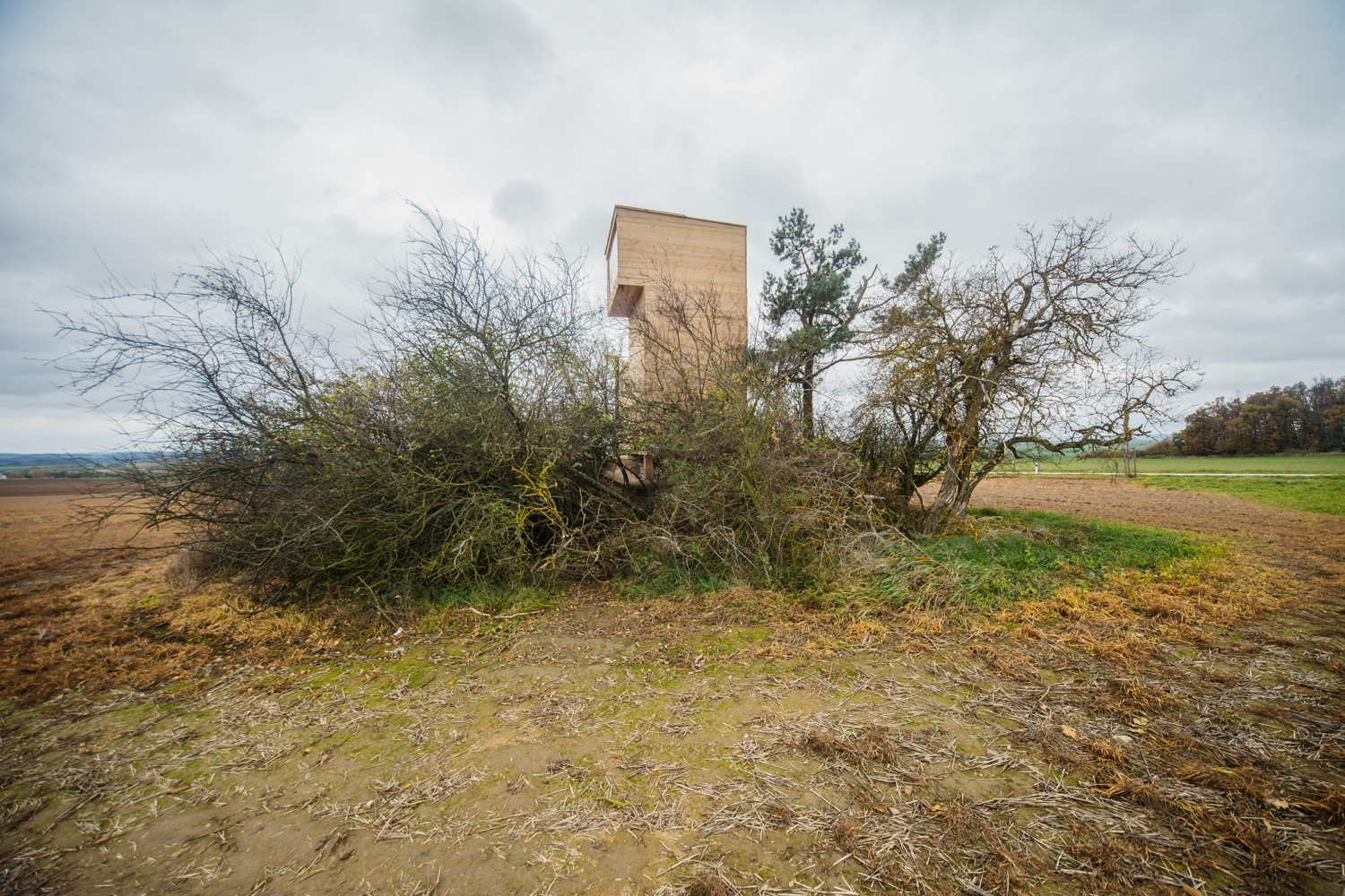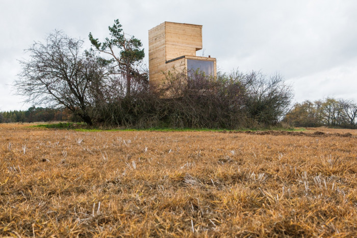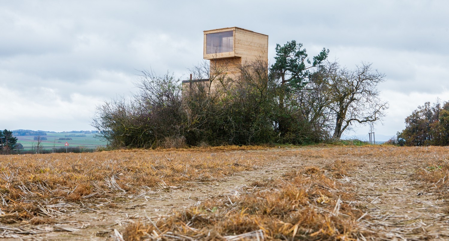 Hlavní důraz celého projektu byl však kladen na respekt k okolní krajině a ke stávající betonové stavbě. Použitým hrubým neopracovaným dřevem, které navíc časem zešediví nepůsobí vůči okolí agresivně a jednoduchý čitelný objem s průhledy působí na osamoceném křovisku uprostřed polí přirozeně, podobně jako osamocený strom.