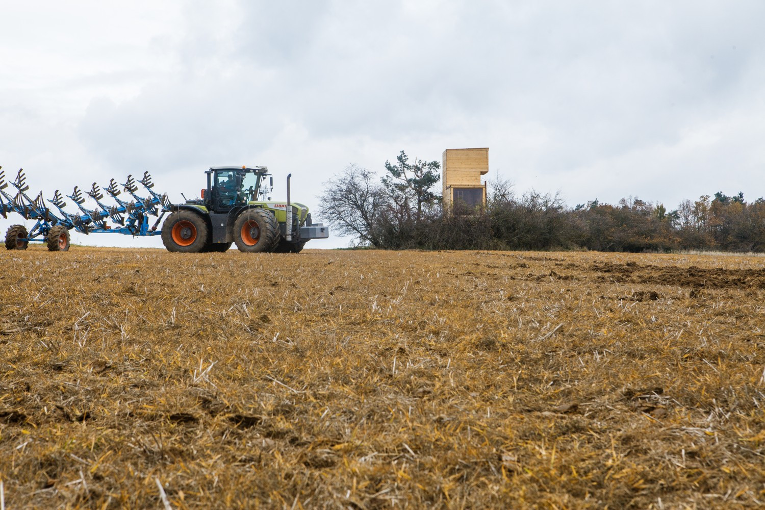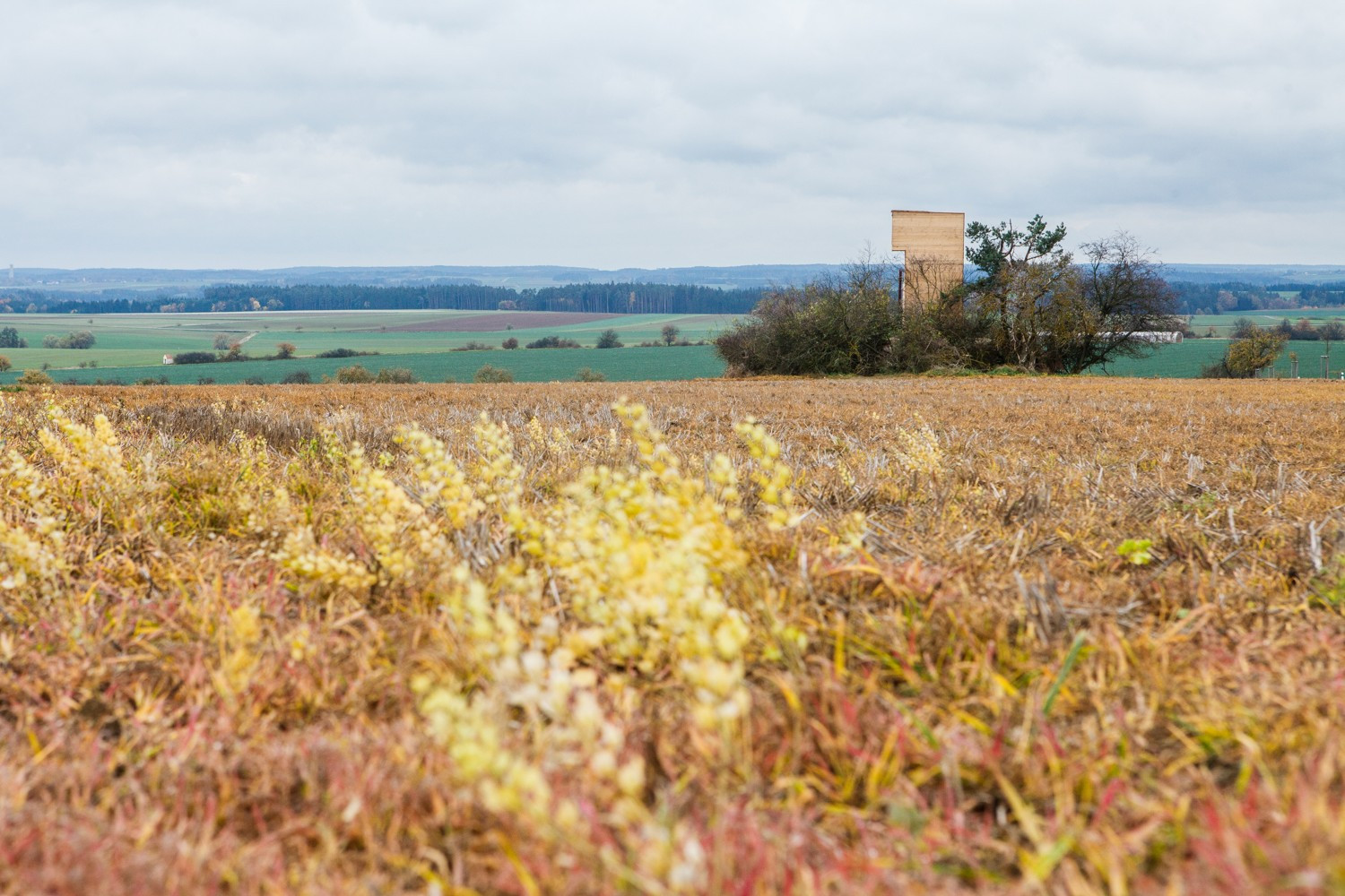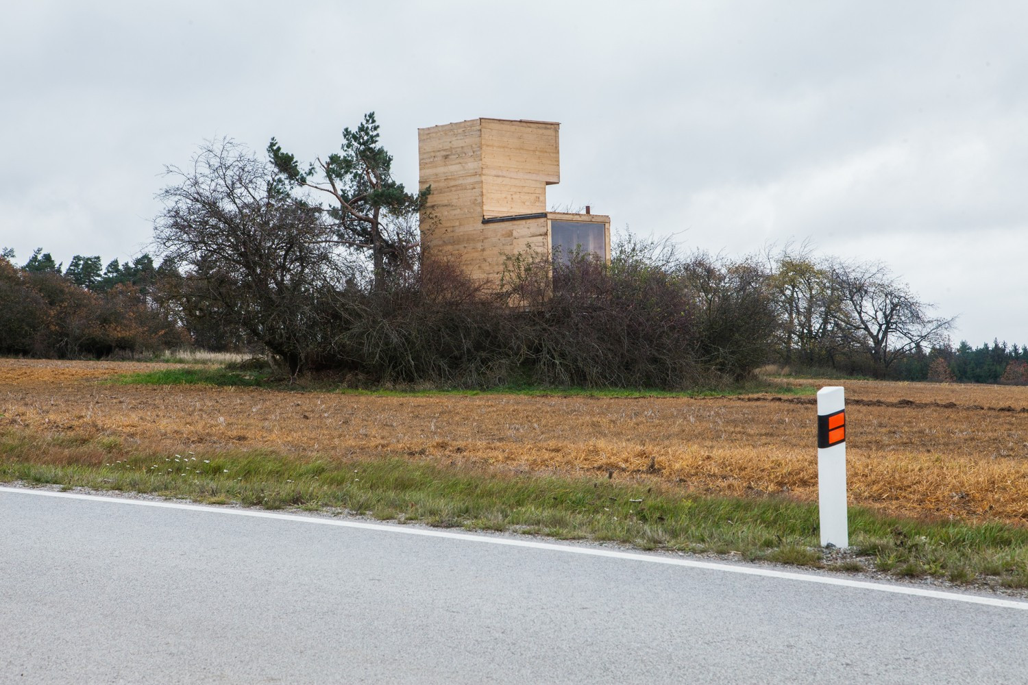 Hlavní důraz celého projektu byl však kladen na respekt k okolní krajině a ke stávající betonové stavbě. Použitým hrubým neopracovaným dřevem, které navíc časem zešediví nepůsobí vůči okolí agresivně a jednoduchý čitelný objem s průhledy působí na osamoceném křovisku uprostřed polí přirozeně, podobně jako osamocený strom.