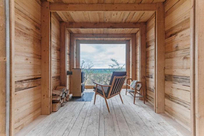 Pozornost byla však kladena i na interiér. Šlo o to ukázat, že i na velmi malé zastavěné ploše - 12m2- lze dosáhnout toho, aby se člověk necítil stísněně, ale naopak svobodně. Jeden průhled je na jih - rovinatou krajinu Rakouska, druhý ve věži na kostel nejbližší vesnice. Doplňuje je pak ještě střešní okno.