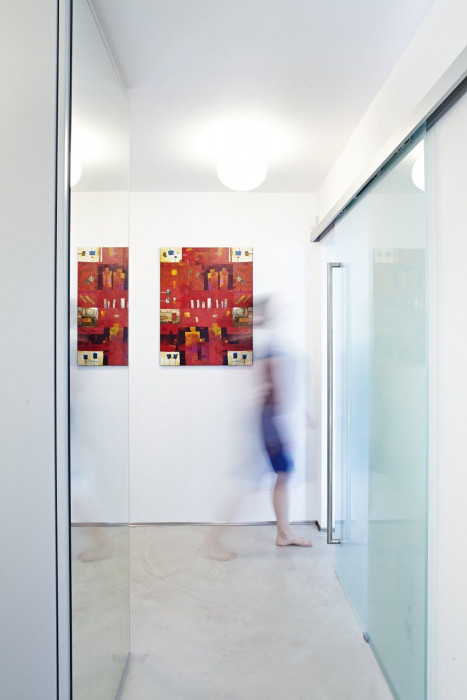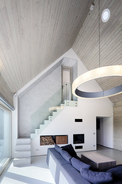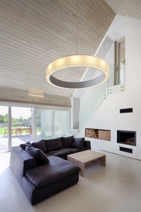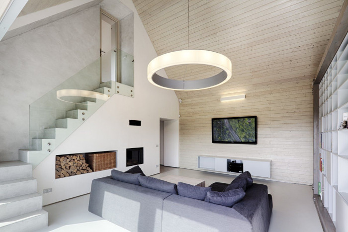 Přízemní hranol klidových obytných částí je vložen do pravidelného rastru dřevěných vazníků navazujících na zděnou část. Celá tato hmota je pak nasazena na betonovém soklu základových konstrukcí. Celková plocha parcely, na které dům stojí, je 2 586 m2. Z toho dřevostavba zabírá 313 m2, zbytek je tedy dům obklopující zahrada.