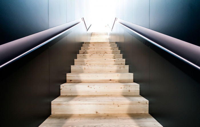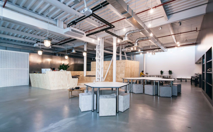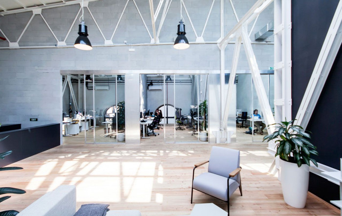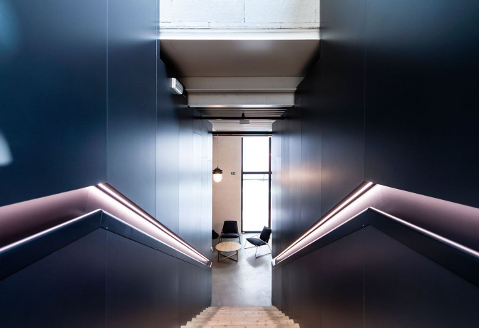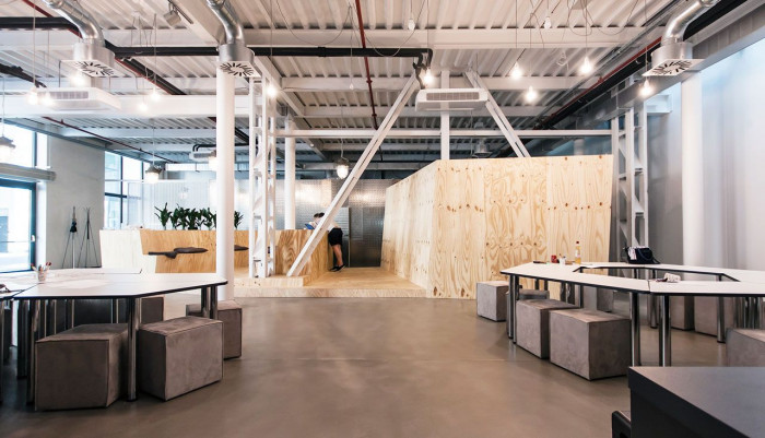 plechová vestavba, ve které je sklad kol, šatna se sprchou, WC a větší zasedací místnost dřevěná vestavba s recepcí, odpočinkovým a barovým sezením a relaxační místností jídelna s modulárními stoly a projekčním plátnem vestavba schodiště, pod kterým je kuchyň s barem a sklad