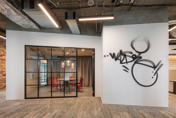 Půdorysné uspořádání místností je záměrně v rozporu s obvyklým utilitárním kancelářským chodbovým schématem, které svou fádností demotivuje a také stěžuje přirozenou orientaci v prostoru. Naší koncepcí je sdružení vždy několika místností do větších celků – „boxů“, které jsou pak celé obloženy v jednom z materiálů - dřevo, cihla, kov, beton. Díky různým velikostem a vzájemnému rozposunutí pak boxy mezi sebou nevytváří klasické chodby, ale spíše volný prostor, který plynule navazuje na otevřená pracoviště. Střední část budovy je naopak v kontrastu s půdorysně jednoduchými boxy. Je výrazně tvarována a ponechána v bílé barvě, která slouží jako podklad pro sprejované grafiky. Jednotlivé materiály jsou vybrány pro svou osobitost, výraznou strukturu a industriální symboliku.