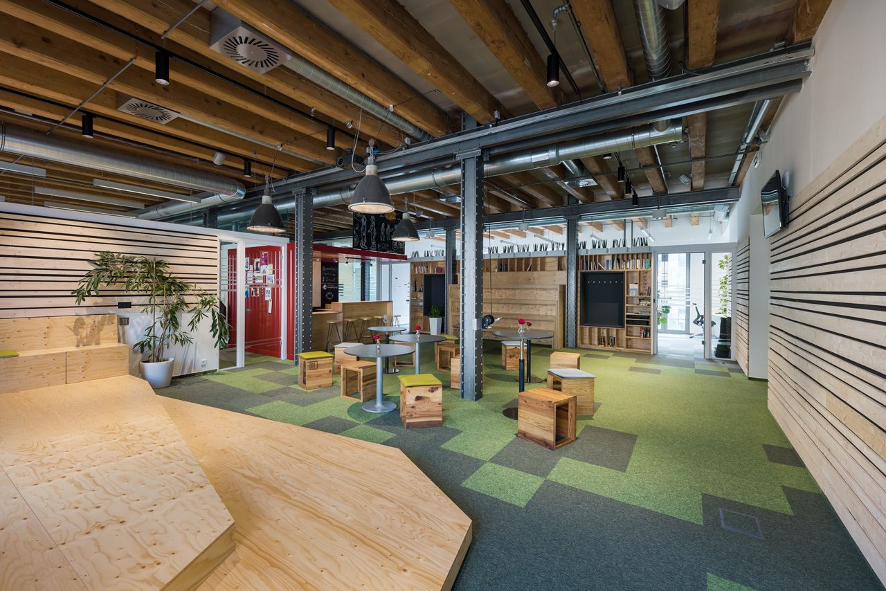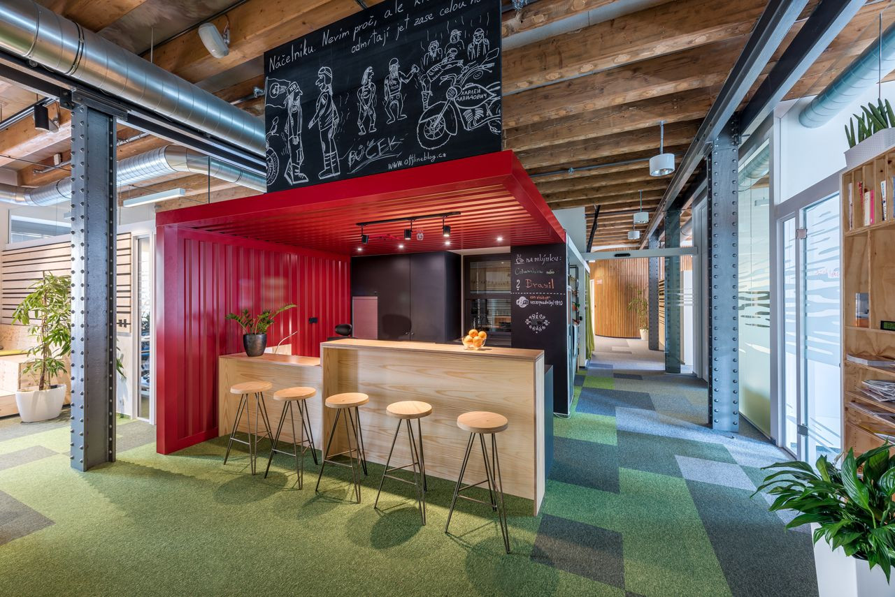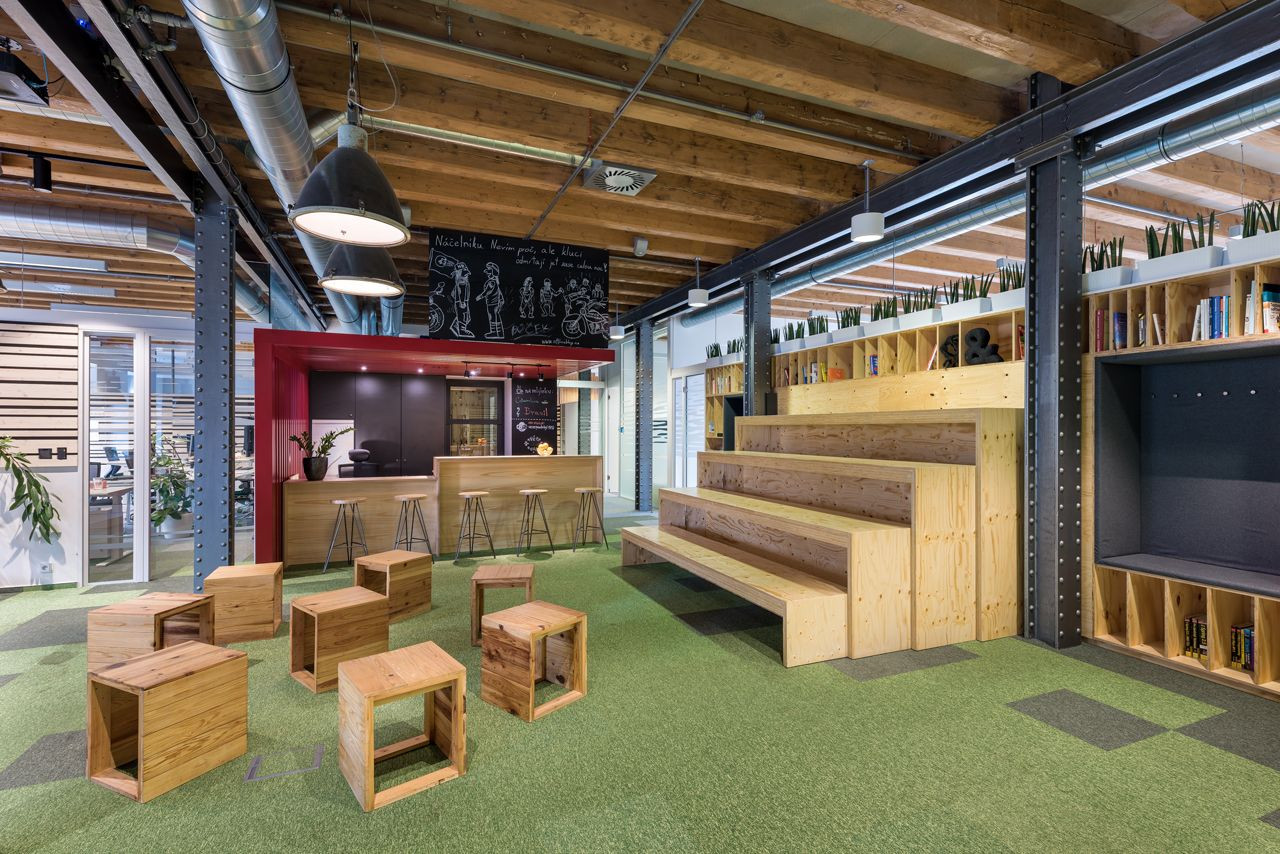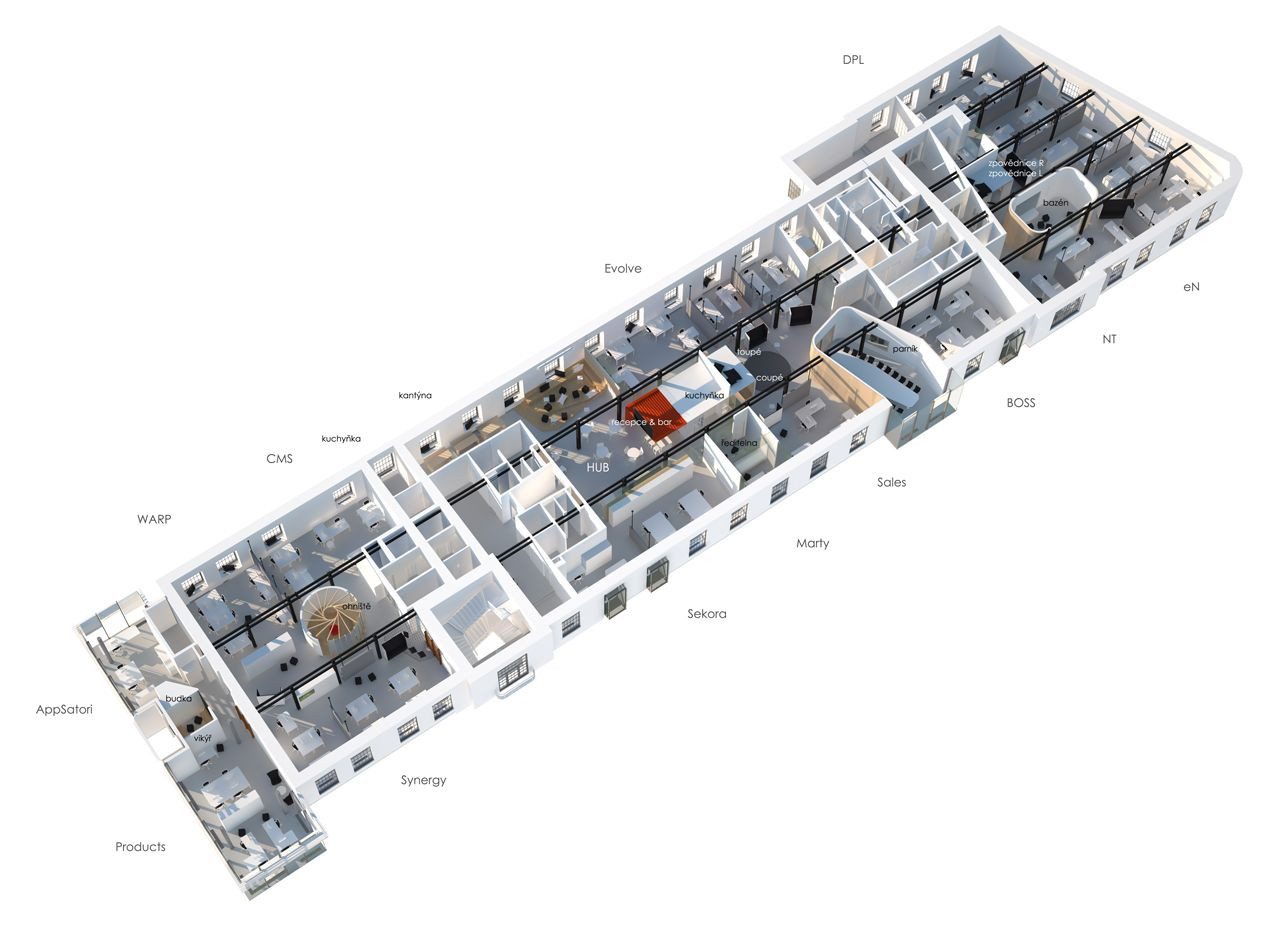 Do volného prostoru orámovaného historickými konstrukcemi byly dosazovány jen nejnutnější objemy pro plynulý chod firmy. Toto nové členění prostoru vytváří kreativní a inspirativní prostor, kde si každý najde své optimální místo pro práci.Přestože se kancelářský prostor rozkládá v několika podlažích, tak prostory působí příjemně intimně.