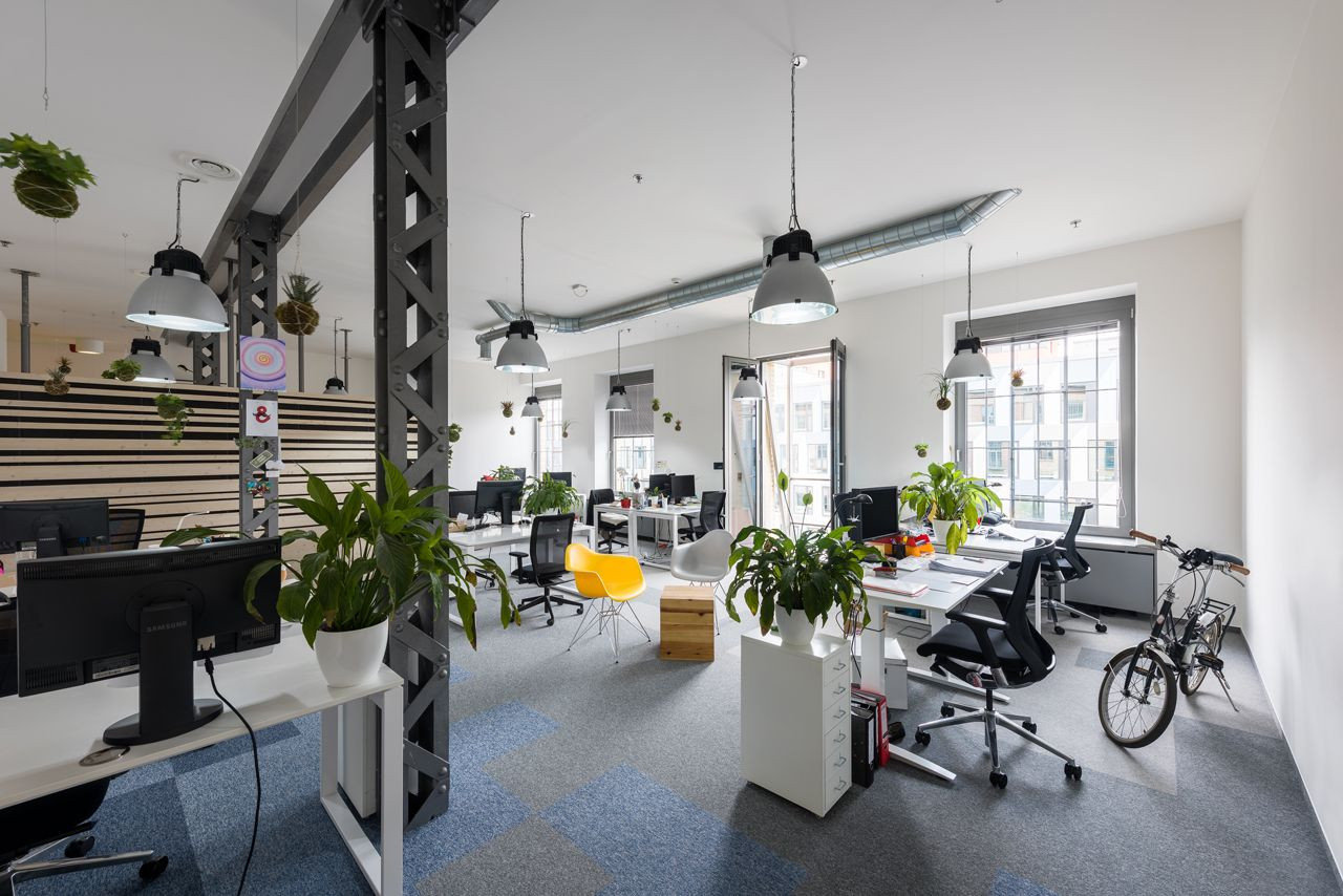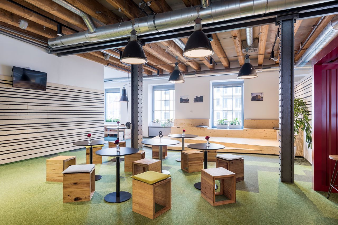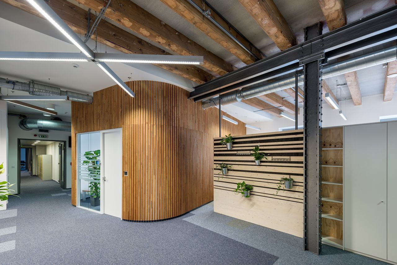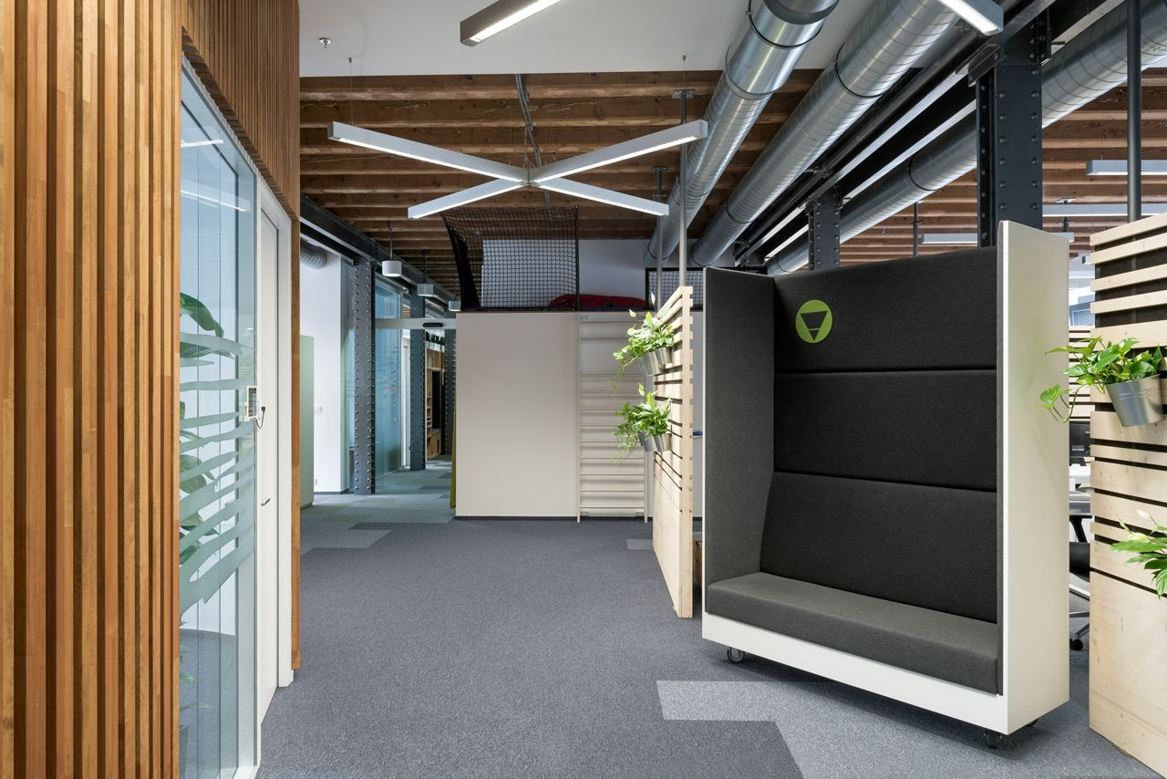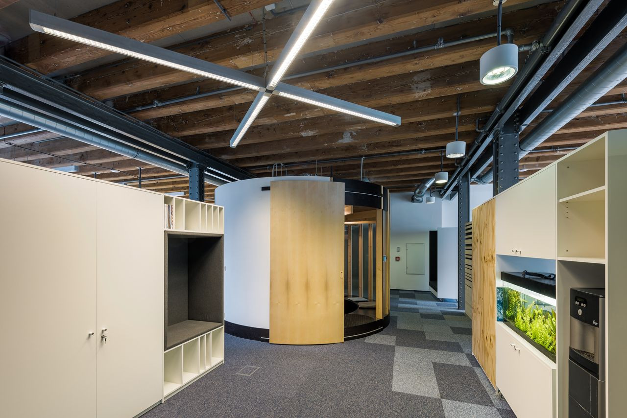 Do volného prostoru orámovaného historickými konstrukcemi byly dosazovány jen nejnutnější objemy pro plynulý chod firmy. Toto nové členění prostoru vytváří kreativní a inspirativní prostor, kde si každý najde své optimální místo pro práci.Přestože se kancelářský prostor rozkládá v několika podlažích, tak prostory působí příjemně intimně.