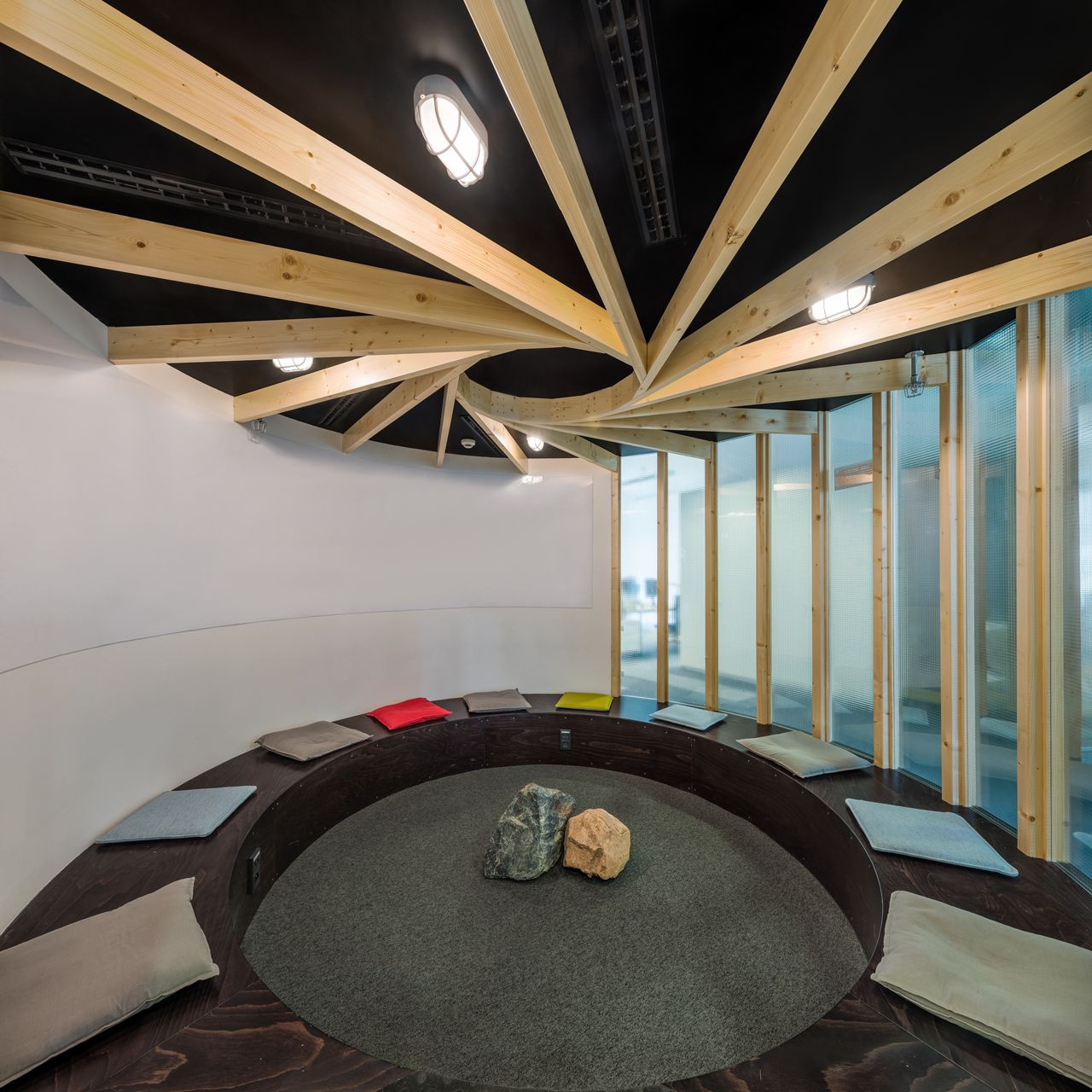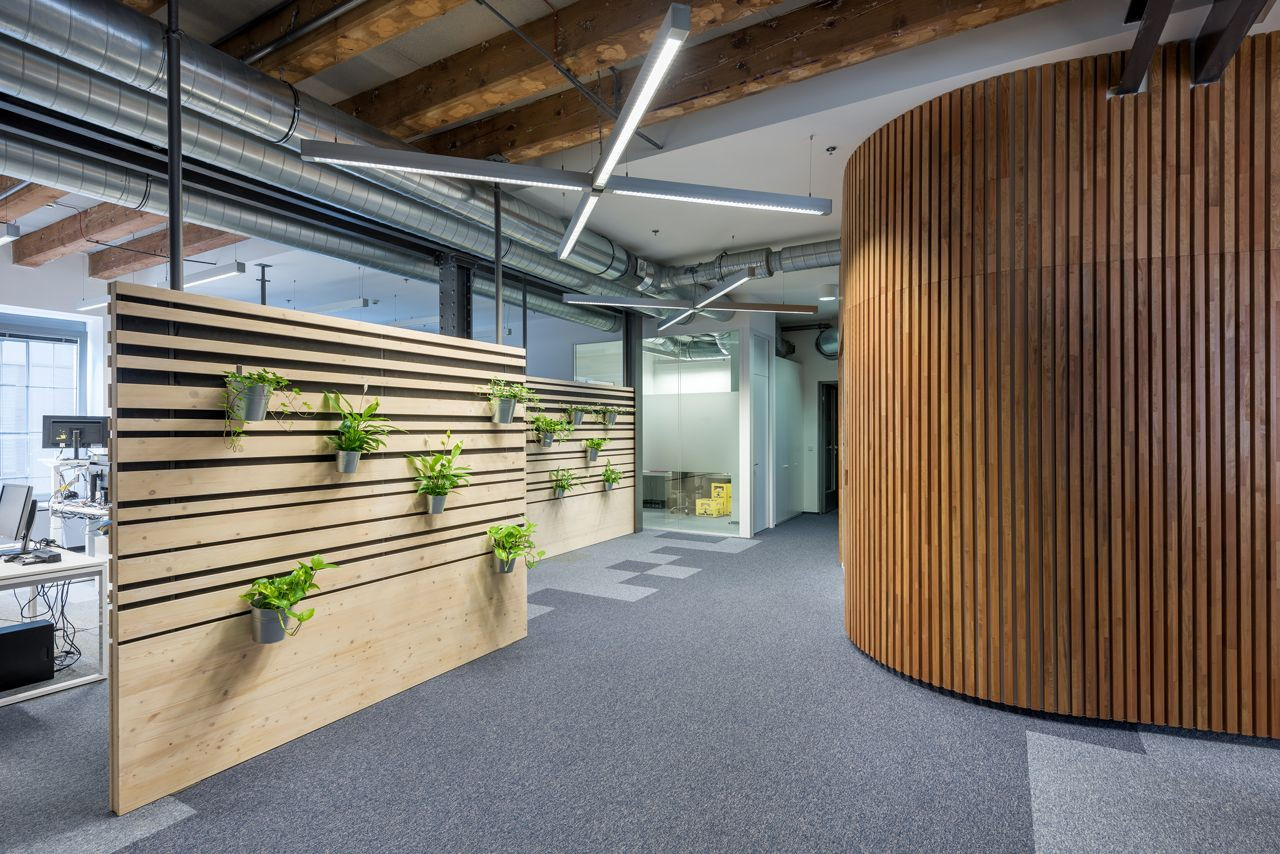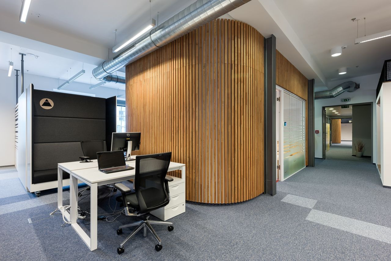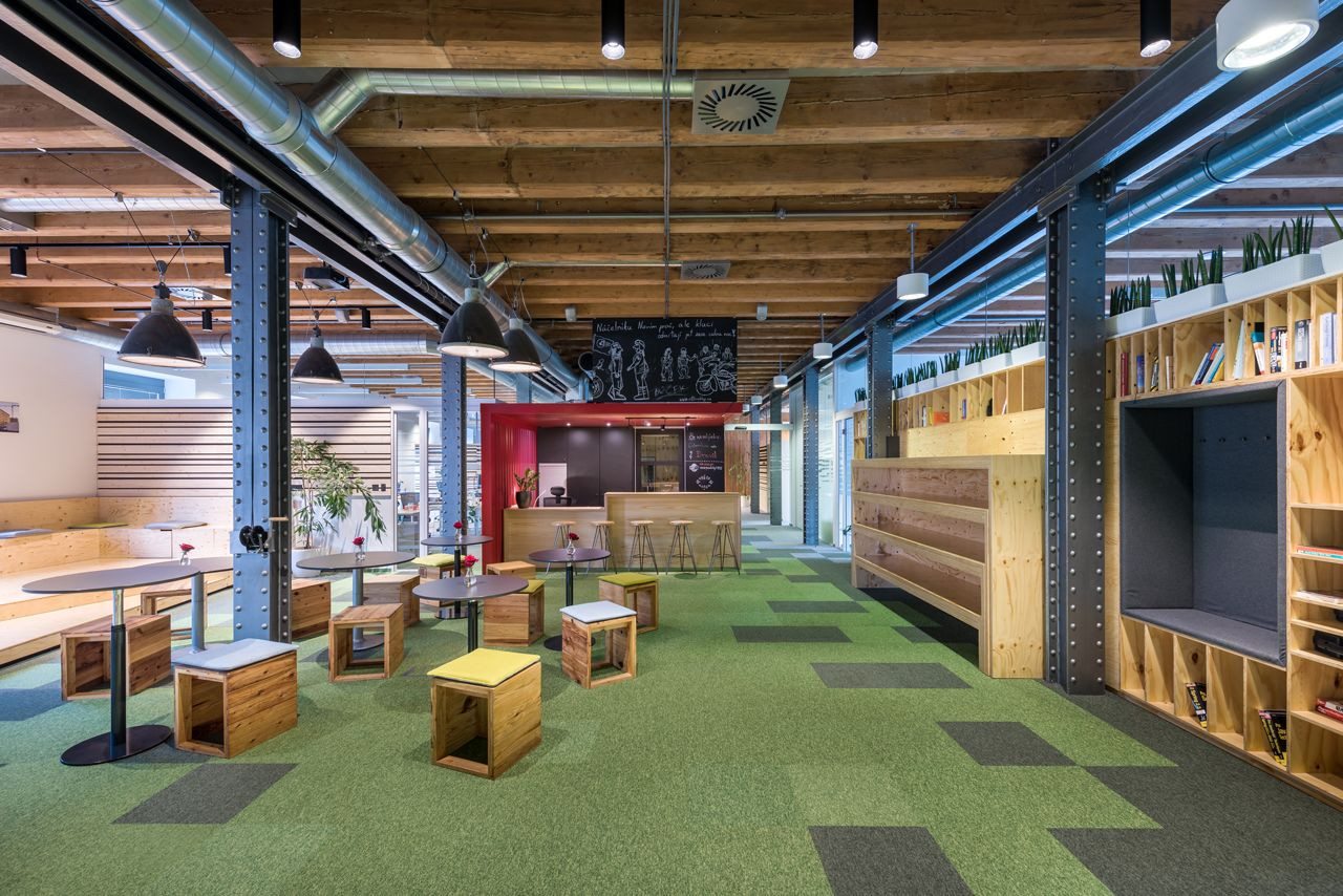 Do volného prostoru orámovaného historickými konstrukcemi byly dosazovány jen nejnutnější objemy pro plynulý chod firmy. Toto nové členění prostoru vytváří kreativní a inspirativní prostor, kde si každý najde své optimální místo pro práci.Přestože se kancelářský prostor rozkládá v několika podlažích, tak prostory působí příjemně intimně.