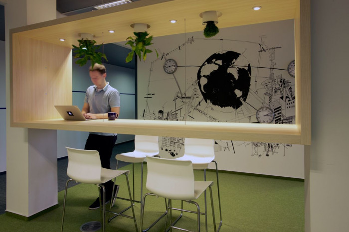 Na stěny v kantýně se díky křídě v ruce zaměstnanců stávají interaktivním obrazem. Hlavním prvkem relax 1 zóny je tetris, sestava sedacího nábytku, evokující legendární počítačovou hru. Kombinací čtyř základních tvarů lze sestavit libovolný tvar, na kterém se příjemně pracuje nebo jen odpočívá. Relax zóna 2 je pojata jako fotbalové hřiště, kde klávesnici a myš na chvíli vystřídají branky body a vteřiny.