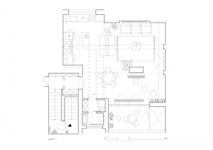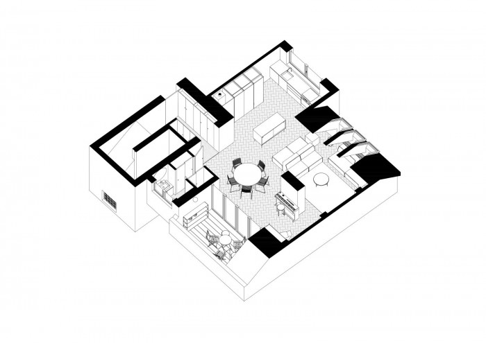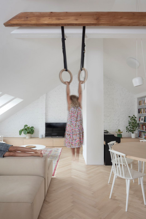Pôvodný stav bytu po rokoch používania nezodpovedal potrebám rodiny. Prebehli drobné no dôležité úpravy. Cieľom bolo dosiahnuť maximálne využitie priestoru, otvorenosť, nové veľkorysé úložné priestory. Denná zóna bytu musí fungovať pre veľkú 5 - člennú rodinu. Funkčno - prevádzkové členenie priestoru určuje mobiliár, nie priečky. Ten celkový priestor definuje, rozdeľuje no zároveň mu dodáva ucelený charakter. Obývačka, kuchyňa, jedáleň, herňa,čitáreň i hudobná miestnosť... Všetko jeden multifunkčný priestor - veľký modifikovateľný a transparentný.