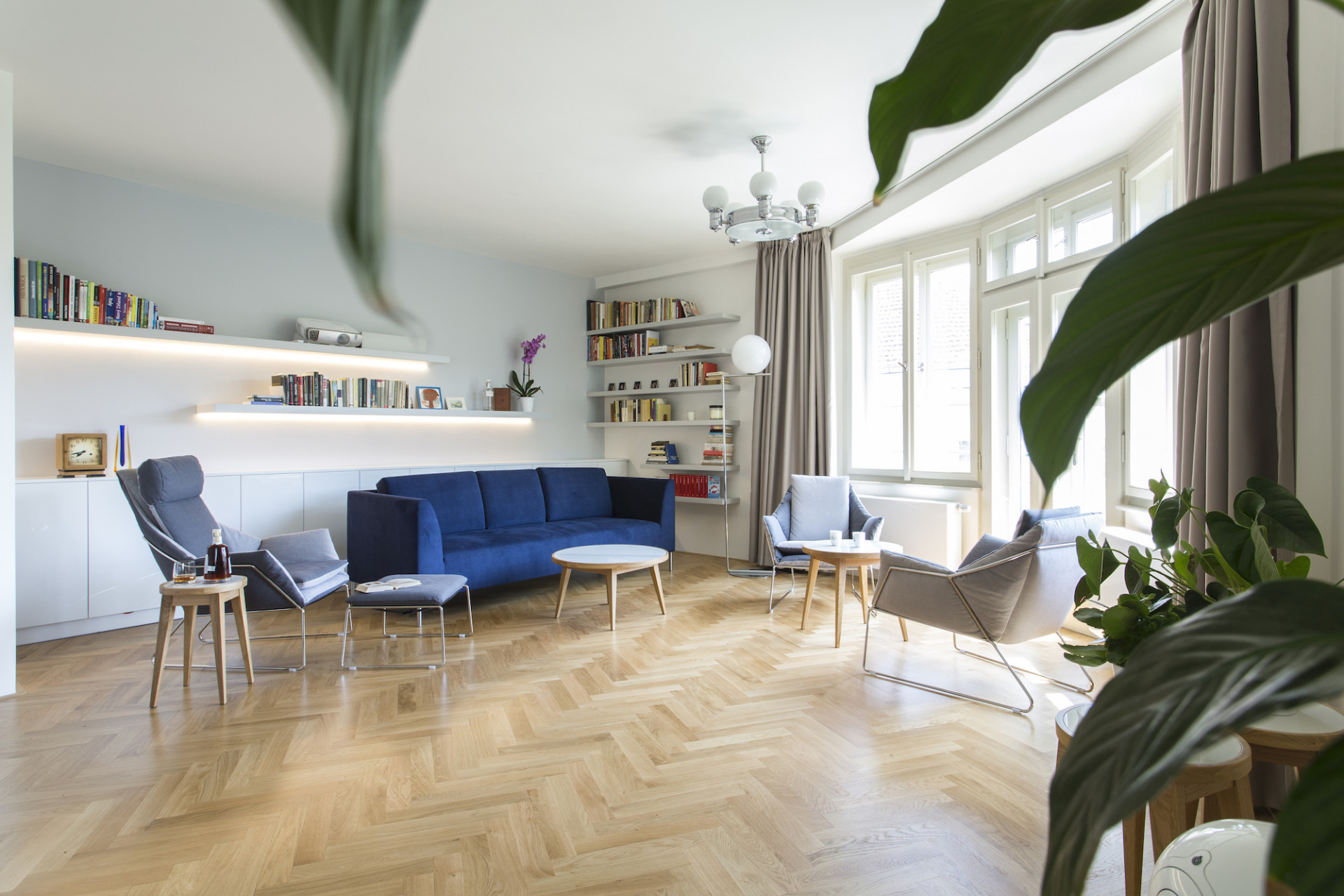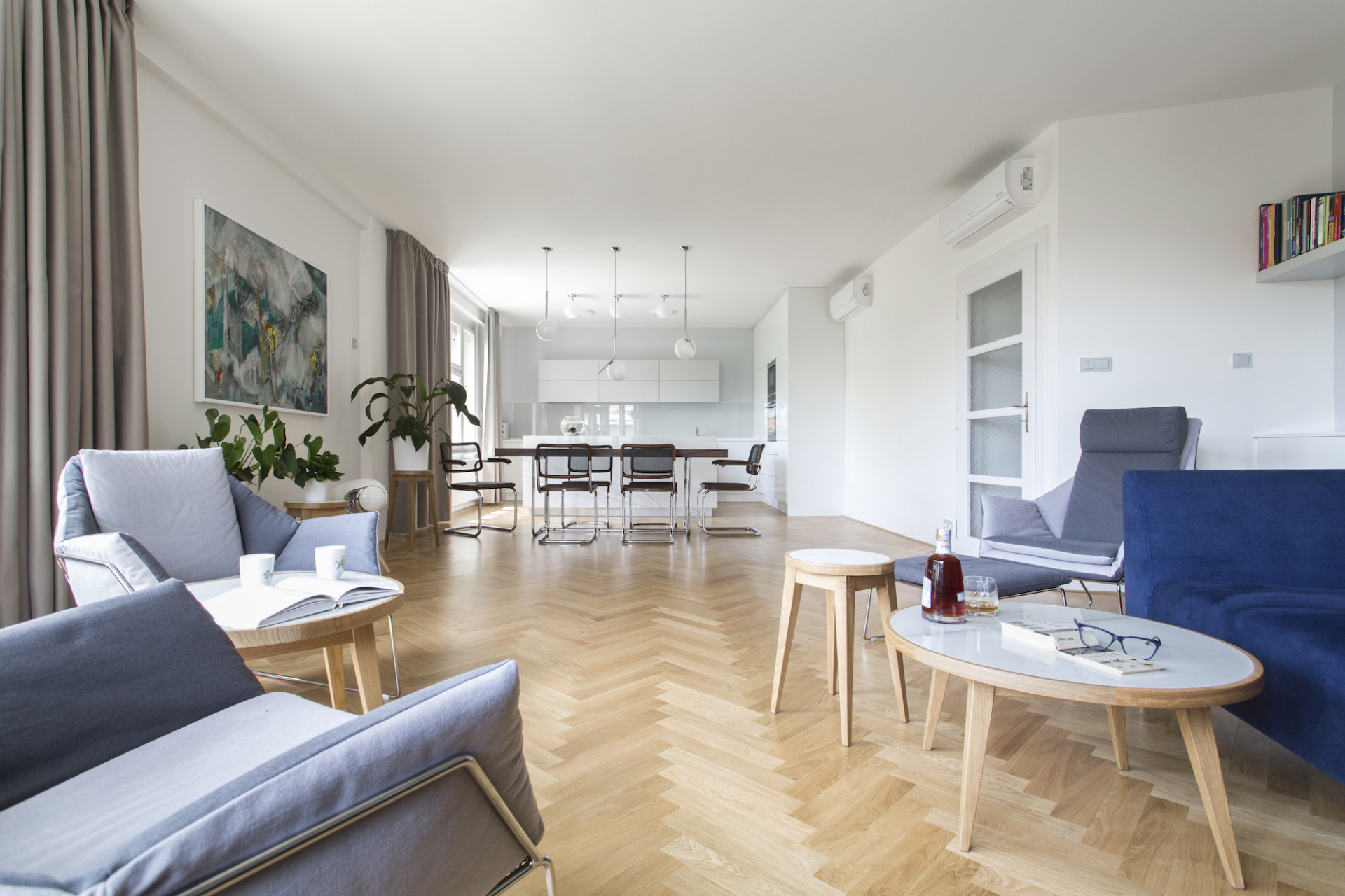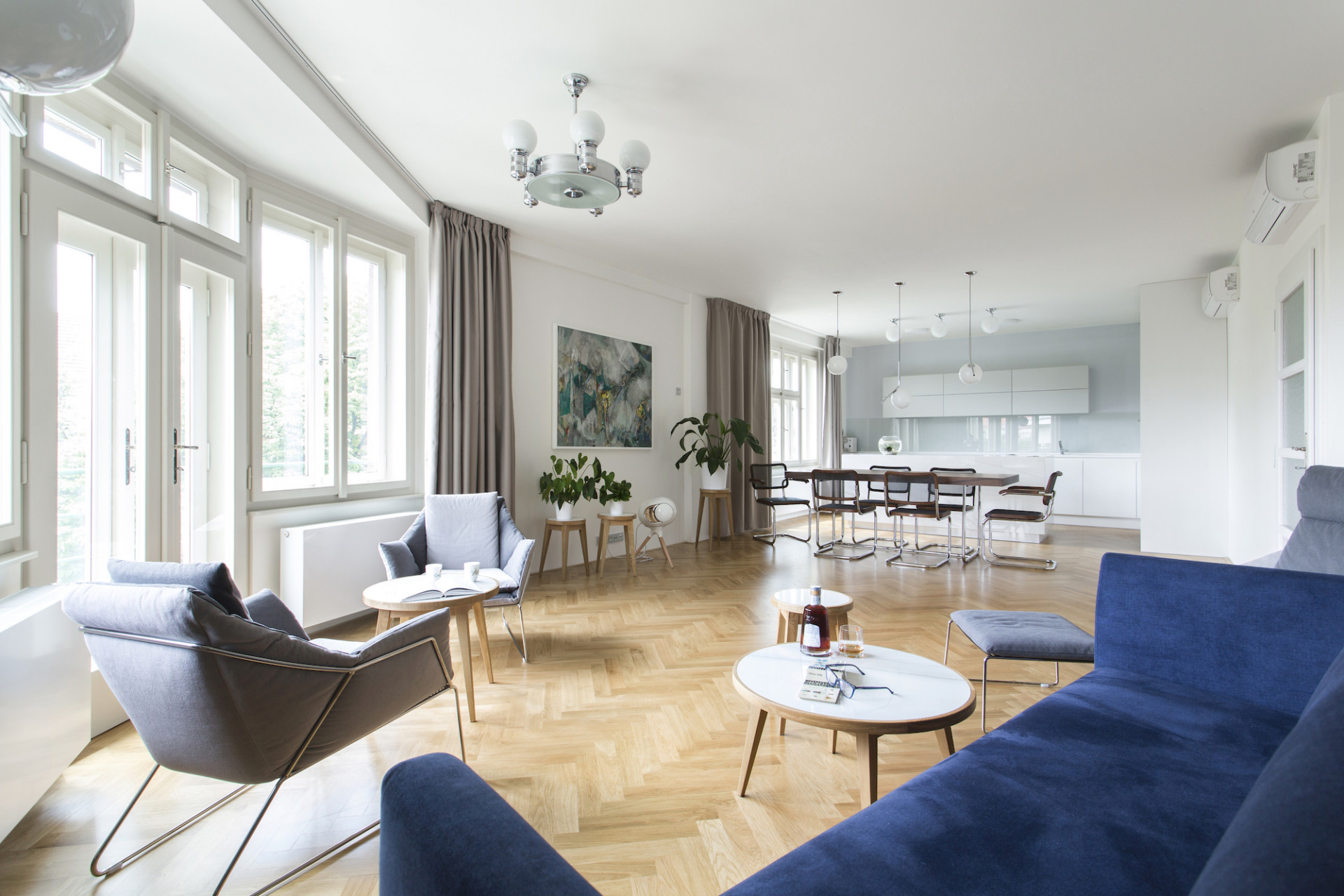 Dubové dřevo, materiál, z něhož jsou vyrobeny původní parkety, se stal sjednocujícím prvkem interiéru. Ke dřevěné podlaze byla zvolena jemná barevnost v odstínech bílé a krémově šedé. Pohovka v sytě modré barvě působí jako barevný akcent v daném prostoru. Výrazný kuchyňský ostrůvek s velkoformátovou dlažbou se opticky propojuje s obývacím prostorem konferenčními stolky, které navrhli architekti. V návaznosti na dobu vzniku domu jsou vybrány ikonické židle Thonet S 64 N a Thonet S 32 N od významného modernisty Marcela Breuera. Tyto židle v kontrastním ořechovém dekoru se stávají dominantním prvkem interiéru. Majitelé jsou sběratelé a obdivovatelé tohoto období. Na židle navazuje výběr křesel, které jsou ikonami současného designu a spolu s vybraným osvětlením od společnosti Flos, propojují interiér chromovými prvky, jež podtrhly nádech období Bauhausu.