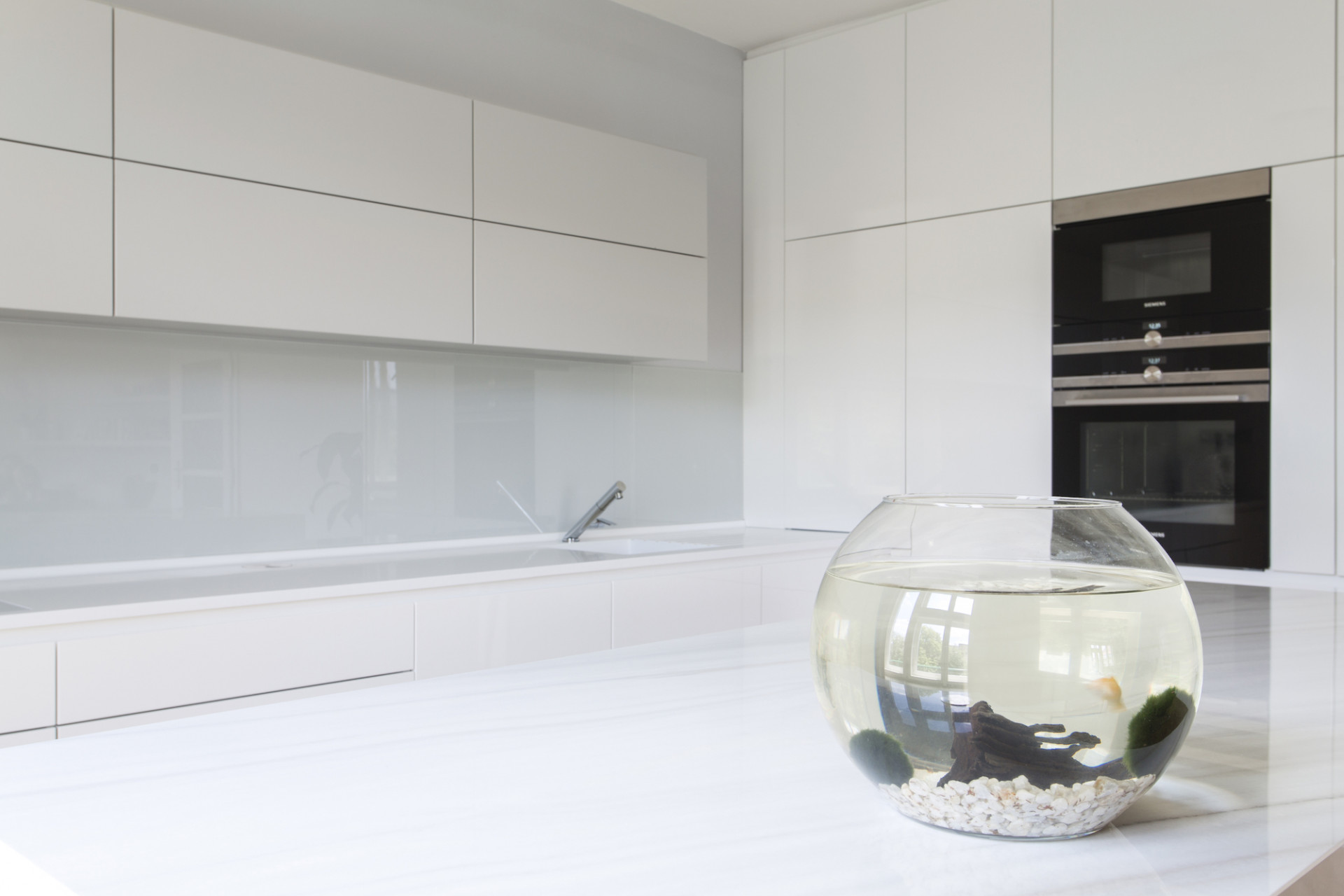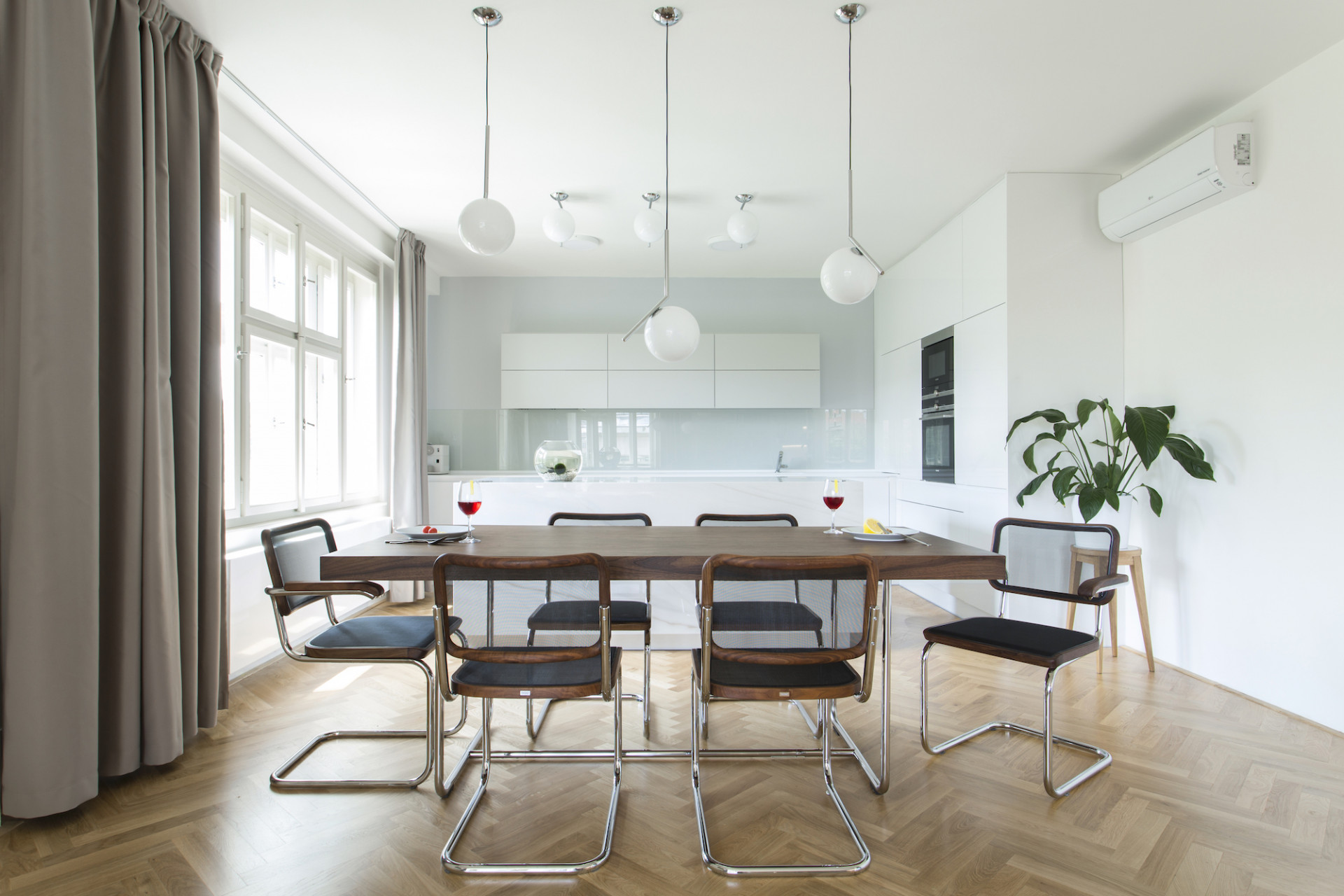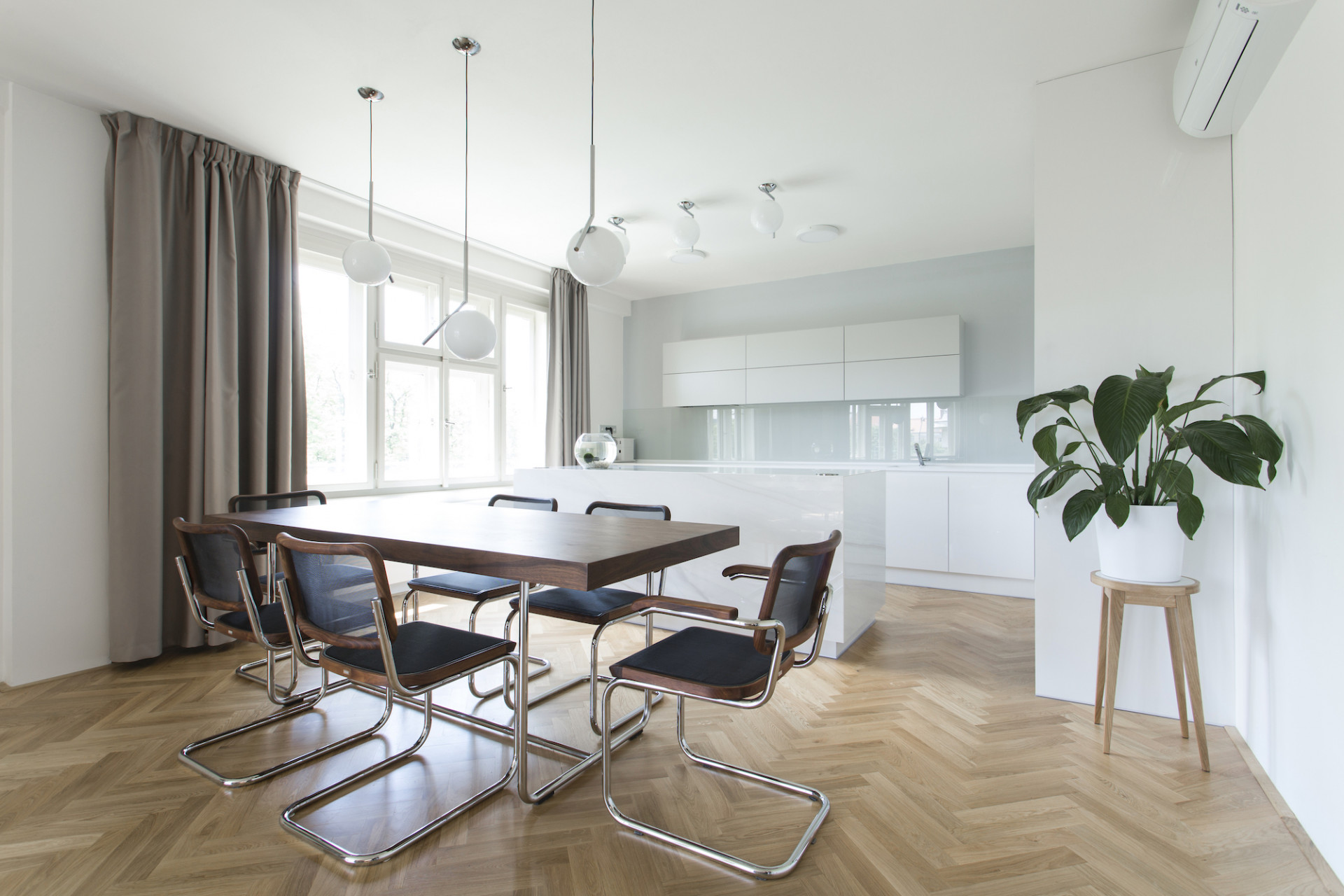 Dubové dřevo, materiál, z něhož jsou vyrobeny původní parkety, se stal sjednocujícím prvkem interiéru. Ke dřevěné podlaze byla zvolena jemná barevnost v odstínech bílé a krémově šedé. Pohovka v sytě modré barvě působí jako barevný akcent v daném prostoru. Výrazný kuchyňský ostrůvek s velkoformátovou dlažbou se opticky propojuje s obývacím prostorem konferenčními stolky, které navrhli architekti. V návaznosti na dobu vzniku domu jsou vybrány ikonické židle Thonet S 64 N a Thonet S 32 N od významného modernisty Marcela Breuera. Tyto židle v kontrastním ořechovém dekoru se stávají dominantním prvkem interiéru. Majitelé jsou sběratelé a obdivovatelé tohoto období. Na židle navazuje výběr křesel, které jsou ikonami současného designu a spolu s vybraným osvětlením od společnosti Flos, propojují interiér chromovými prvky, jež podtrhly nádech období Bauhausu.