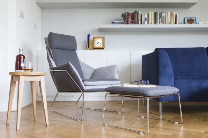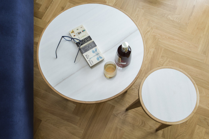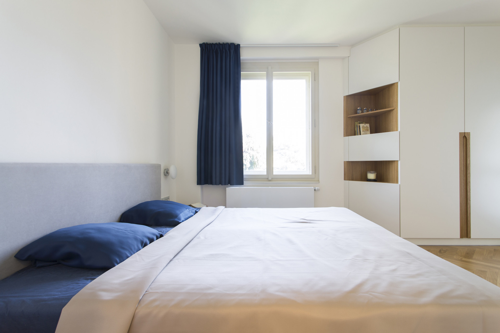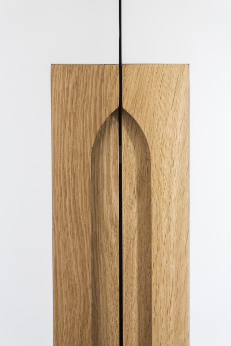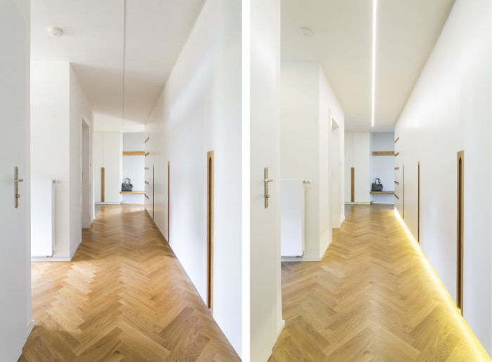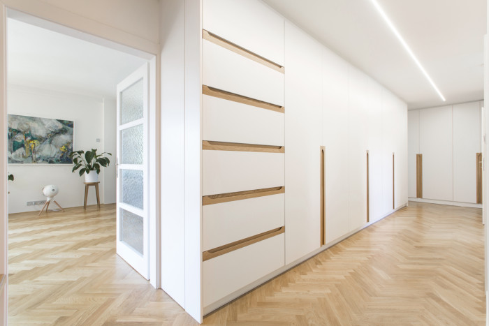 Rekonstrukce si klade za cíl propojit více funkčních zón, velkoryse otevřít obytný prostor a nabídnout pohodlí a praktičnost. Dva průchozí pokoje jsou spojeny v jeden velký prosluněný prostor s balkónovým oknem. Ložnice se samostatnou koupelnou je naopak orientována do klidného vnitrobloku. Tento zásah do dispozice poskytl klidové části bytu dostatek soukromí. Z chodby se stává prostorná šatna s praktickými úložnými prostory. Oblečení, sportovní vybavení i pračka a sušička jsou skryty ve vestavných skříních. Prostor zůstává čistý, bílý, s výraznými geometrickými detaily dubových úchytek.