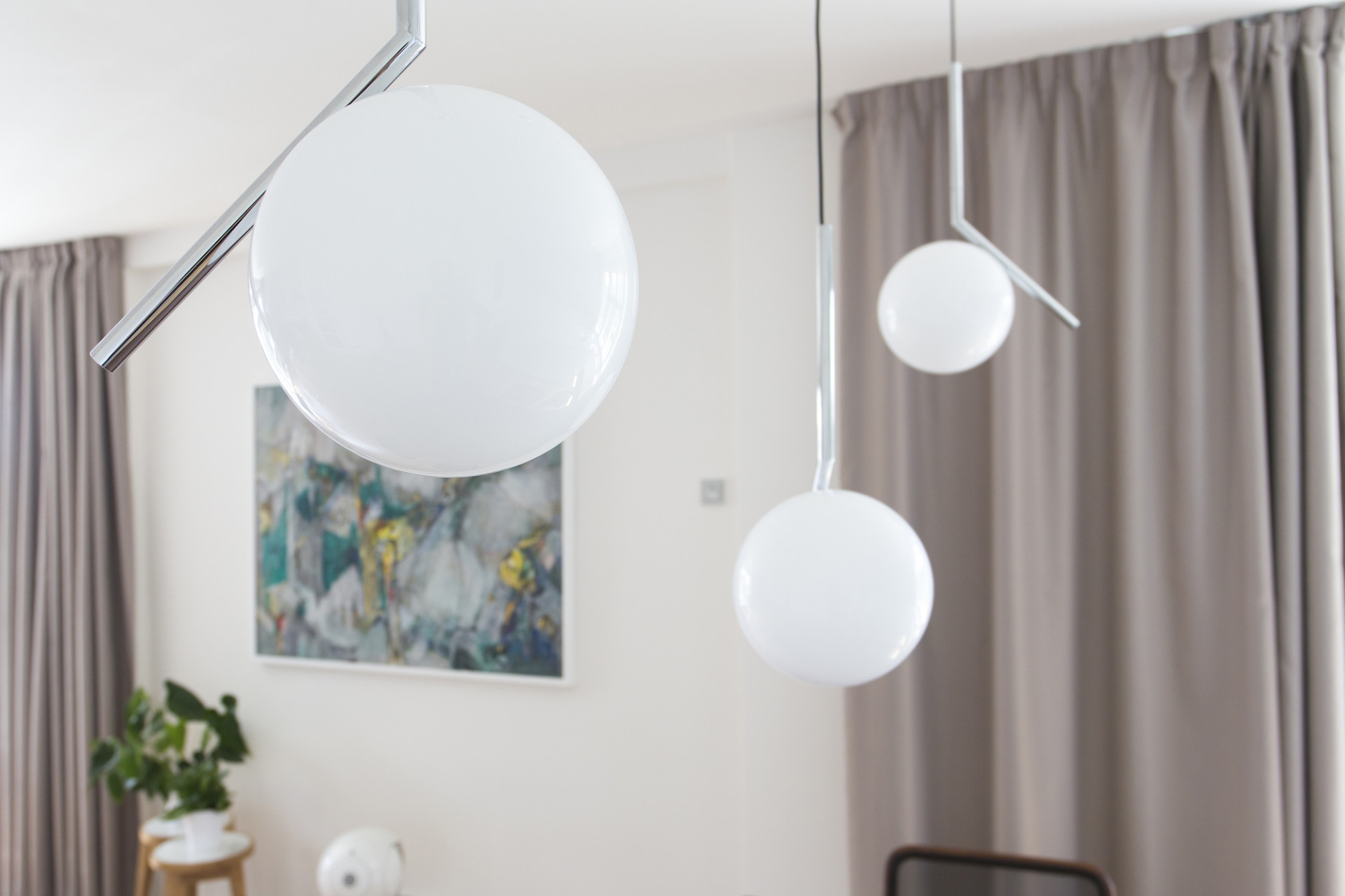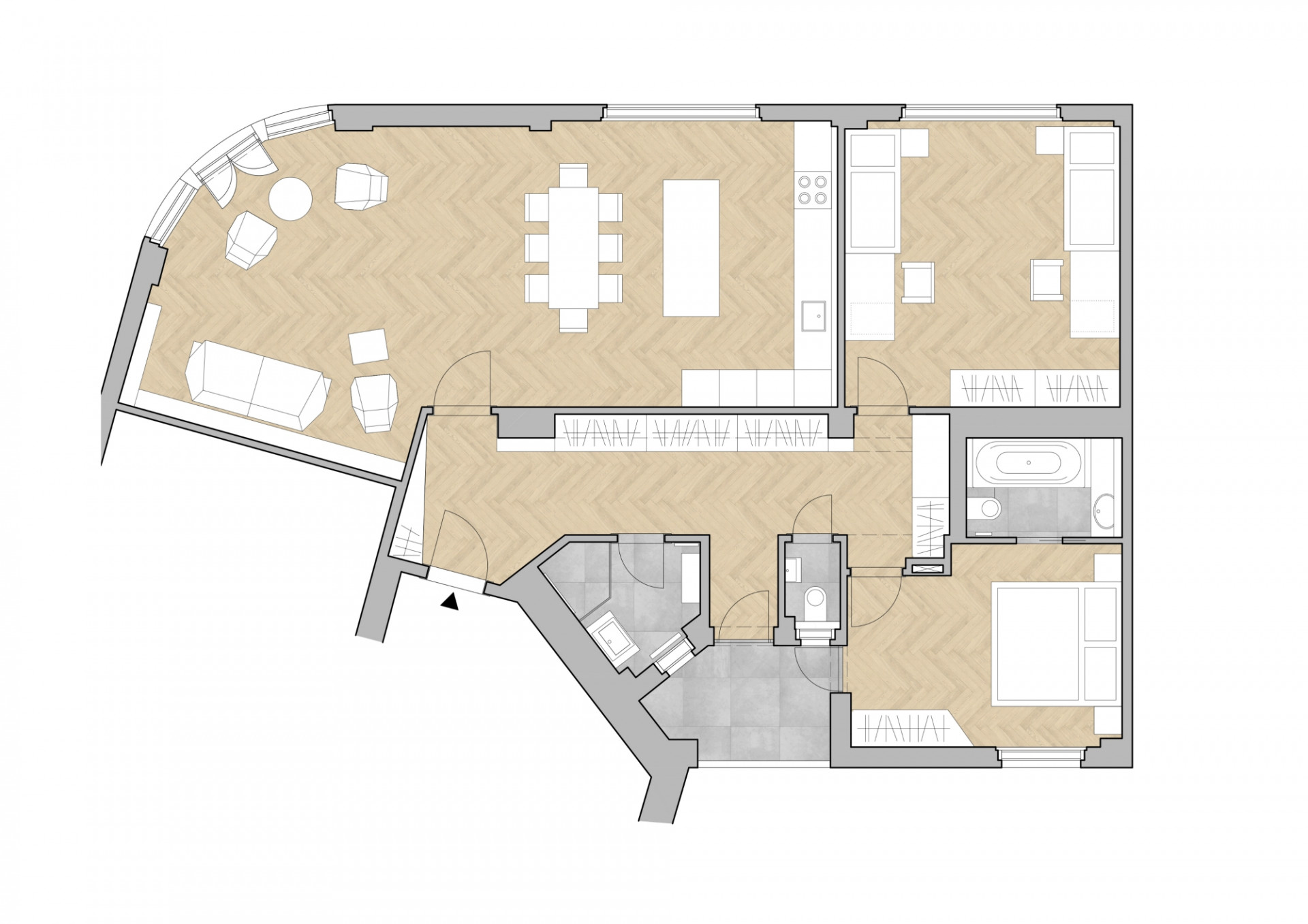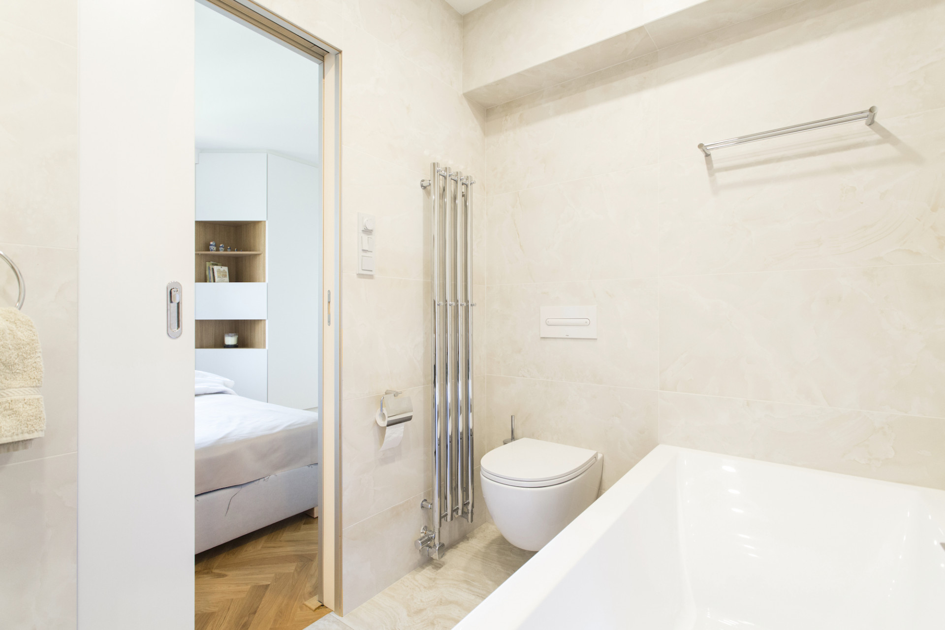 Rekonstrukce si klade za cíl propojit více funkčních zón, velkoryse otevřít obytný prostor a nabídnout pohodlí a praktičnost. Dva průchozí pokoje jsou spojeny v jeden velký prosluněný prostor s balkónovým oknem. Ložnice se samostatnou koupelnou je naopak orientována do klidného vnitrobloku. Tento zásah do dispozice poskytl klidové části bytu dostatek soukromí. Z chodby se stává prostorná šatna s praktickými úložnými prostory. Oblečení, sportovní vybavení i pračka a sušička jsou skryty ve vestavných skříních. Prostor zůstává čistý, bílý, s výraznými geometrickými detaily dubových úchytek.