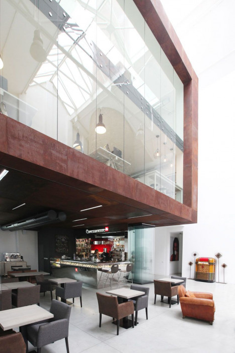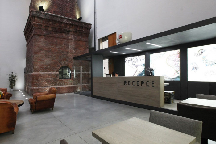 Snažili jsme se, aby i přes nově vložené funkce zůstal zachován duch otevřeného prostoru s dominantou komínu. Stolky z kavárny a vůně kávy plynule přecházejí do atria, lidé se zde potkávají, probíhají zde pracovní schůzky, prostor funguje jako krytá ulice.