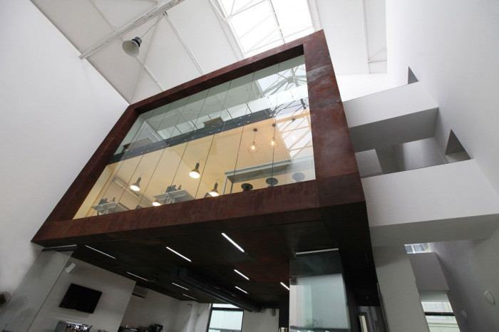 Využili jsme stávající železobetonové sloupy s nosníky a na ty místo jeřábu do vzduchu zavěsili novou „kancelářskou“ kostku. Tu jsme v duchu poetiky kotelny obalili do cortenového pláště a propojili přes kapitánské můstky se stávajícími kancelářskými prostory a únikovým schodištěm. Čelo zrezivělé kostky směřující ke vchodu a komínu jsme celé otevřeli strukturálním prosklením, abychom zajistili dostatečné prosvětlení a vizuální propojení s atriem.
