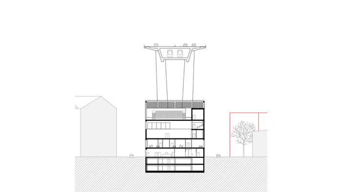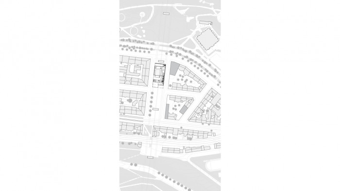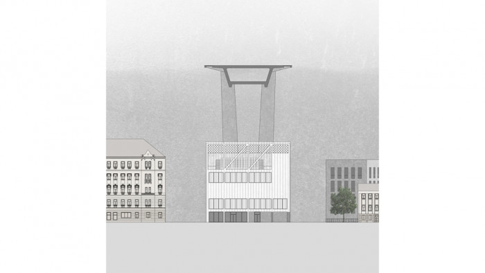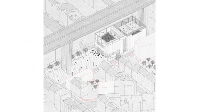 Nuselské údolí má jako svou naprostou dominantu Nuselský most, který prochází přes celé Nuselské údolí. Navrhované komunitní centrum je navrženo jako solitér přímo pod Nuselským mostem s využitím ploché střechy pro podpoření střešní krajiny v území. Pro dotvoření celkového prostorového konceptu jsou doplněny nedokončené východní bloky novou zástavbou. Jako solitérní dům má jasně danou pozici vymezenou náměstím. Náměstí je zpevněné velkoformátovou dlažbou. Konstrukce centra je betonový skelet, fasadá je tvořena polykarbonátovými panely.