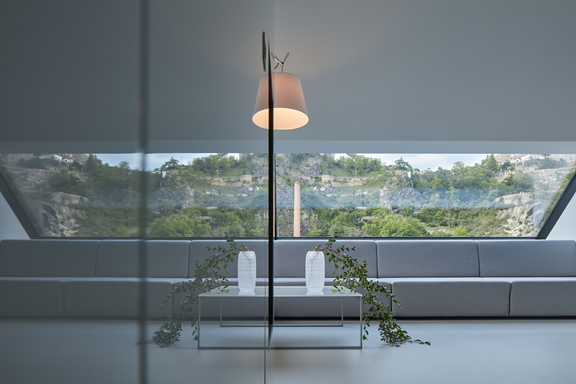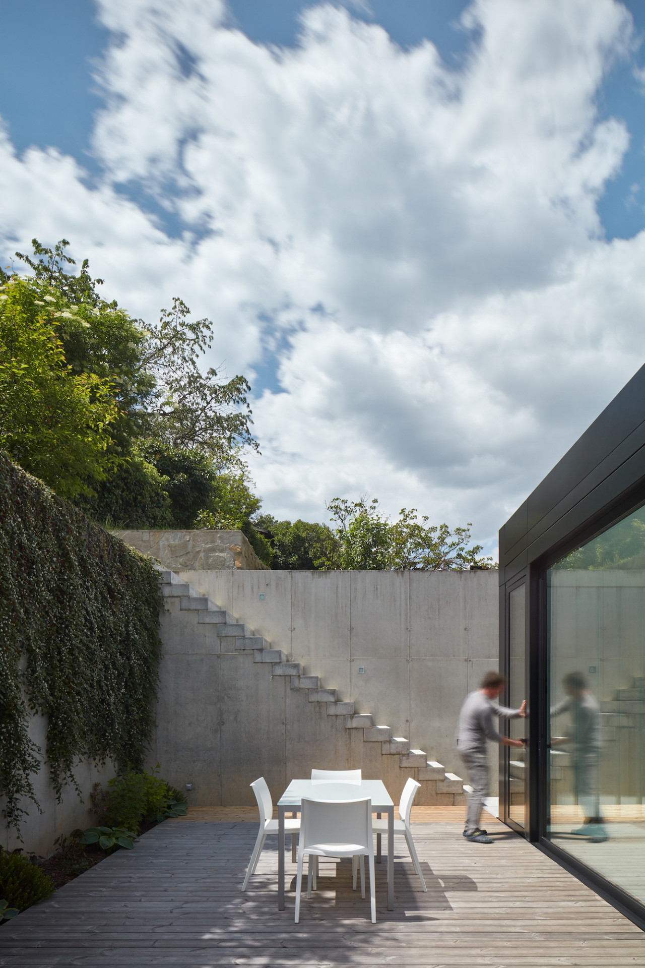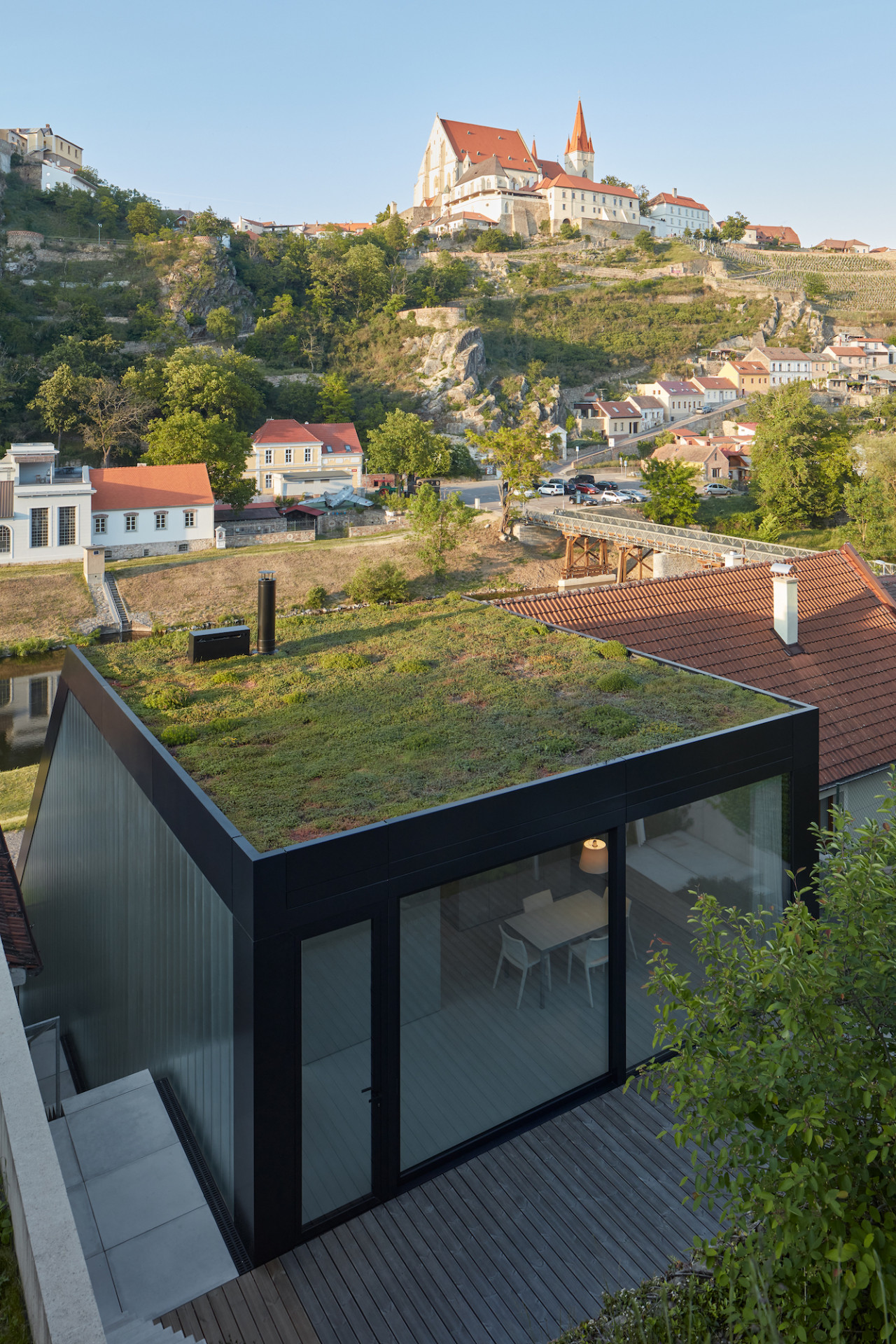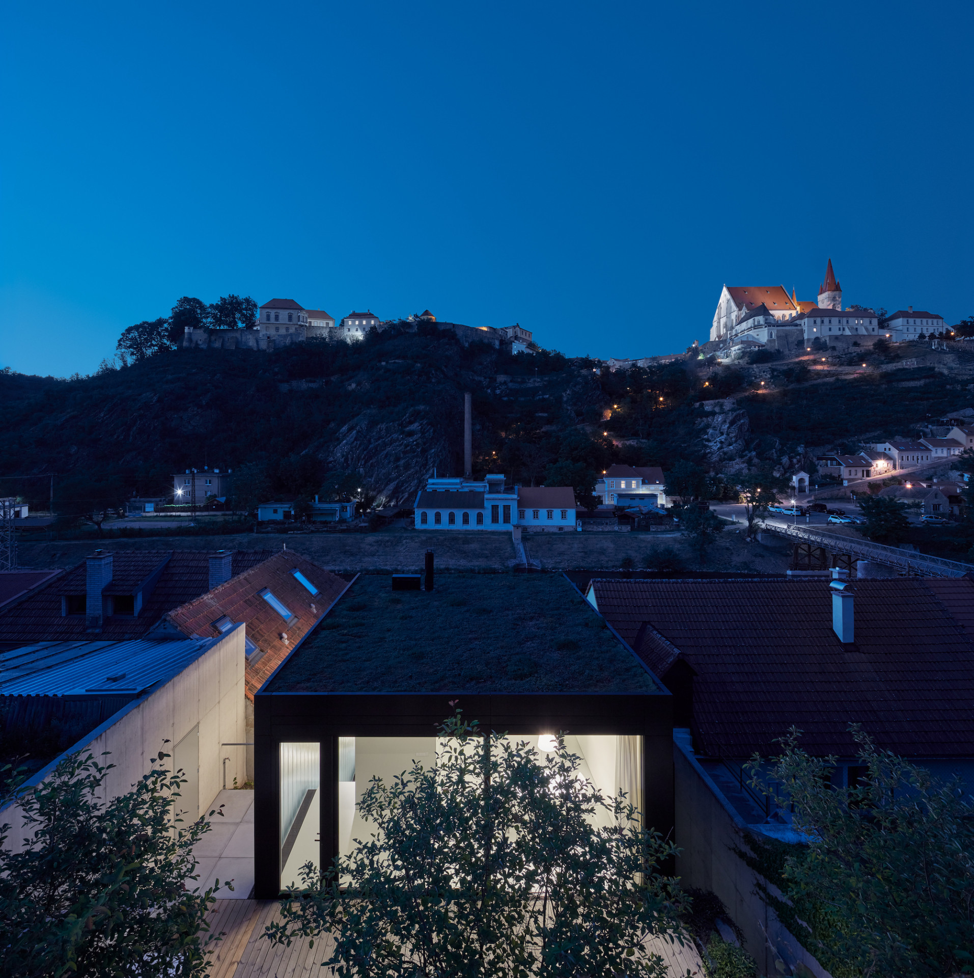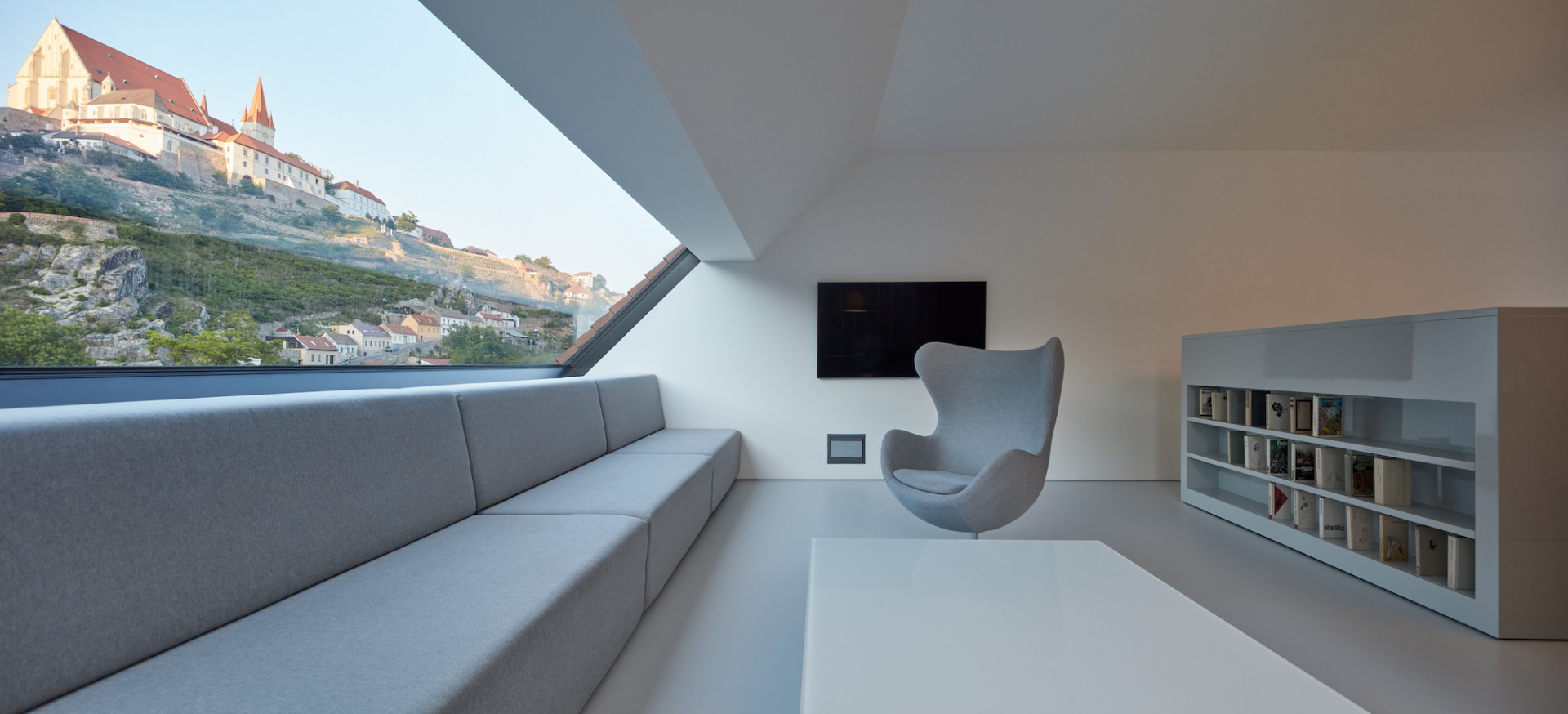 Východní stěna hmoty je vysunutá a ustoupená, umožňuje tak prosvětlení ložnice a prostoru chodby ve 2.NP. Hlavní obytný prostor je umístěný v nejvyšším podlaží a je propojený s venkovní terasou a zahradou na jižní straně. Díky tomu, že obytný prostor není po celé své délce dělený, může využívat jak jižní slunce procházejícího ze zahrady prosklenou stěnou jídelní části, tak výhledy na sever do údolí. Právě krásné výhledy do údolí řeky Dyje a na protilehlé skalní svahy s významnými historickými památkami Znojma jsou největší devizou obytného prostoru a celého rodinného domu.