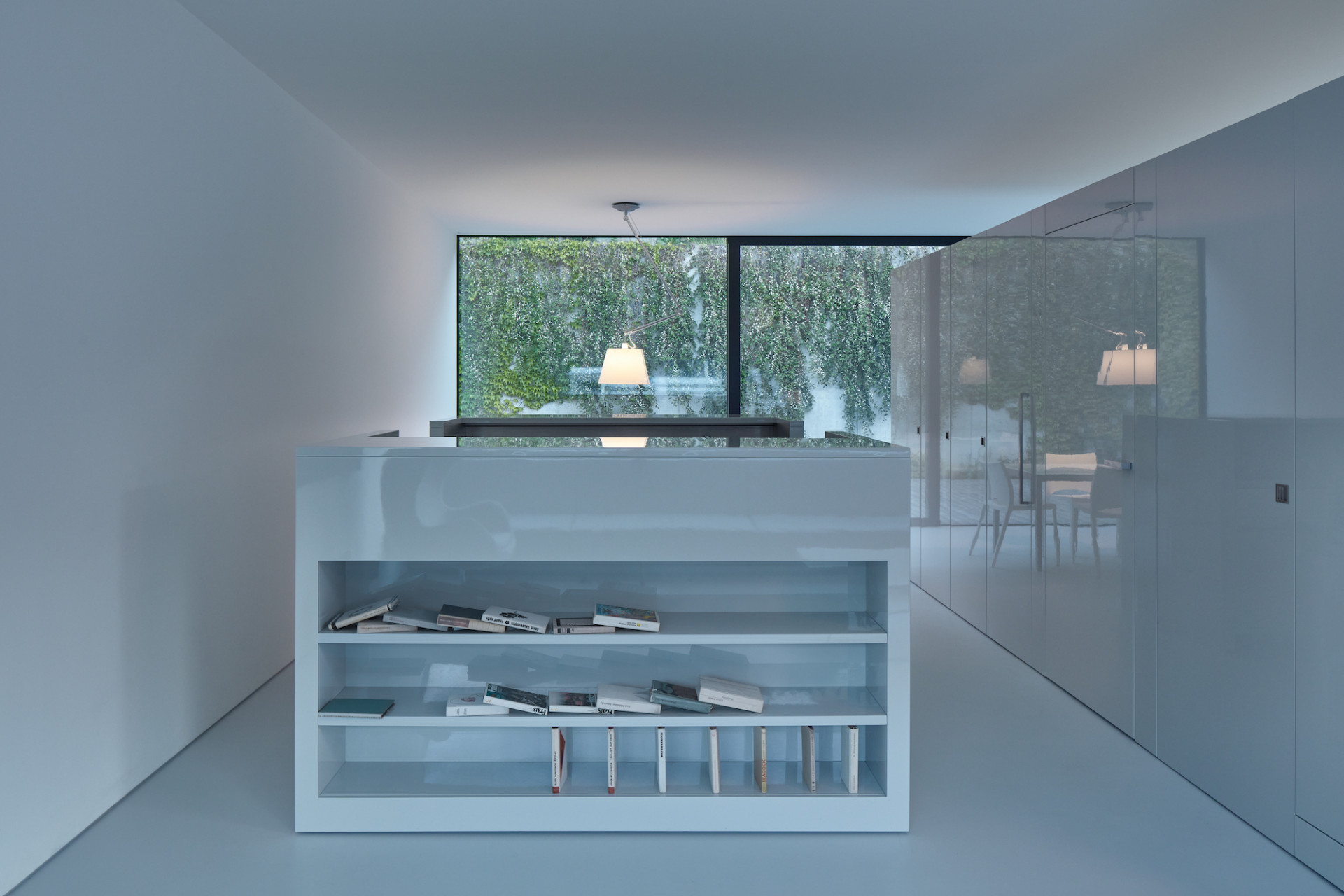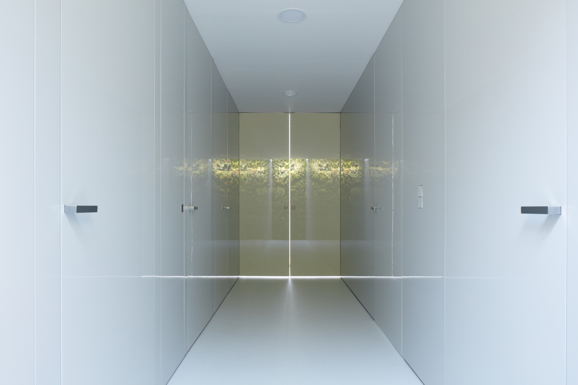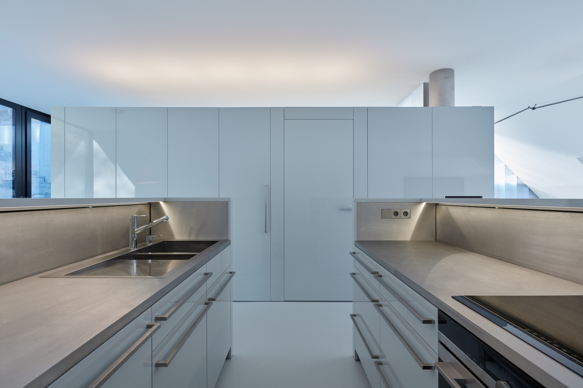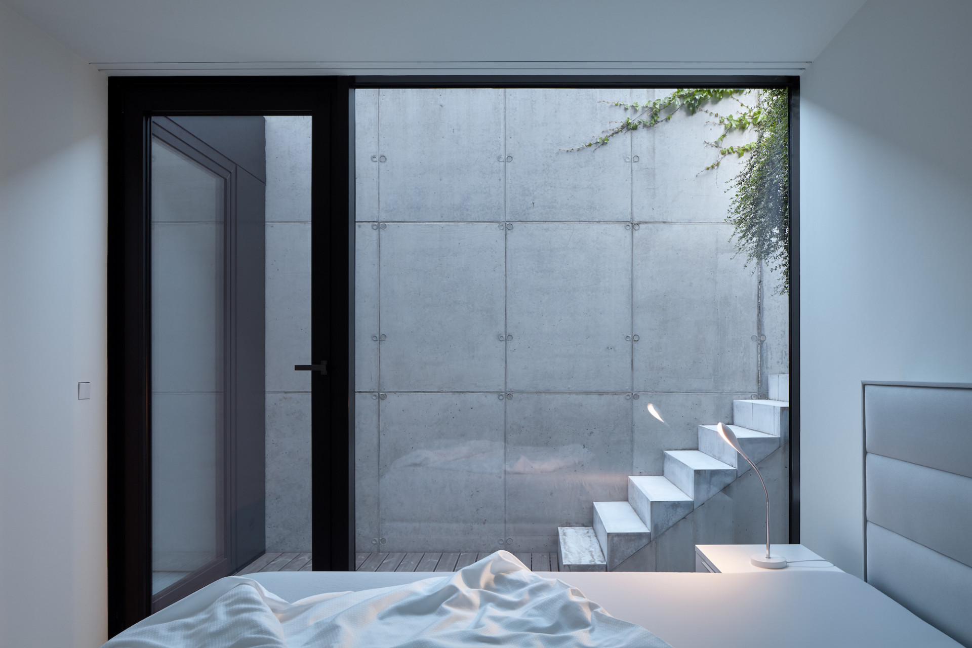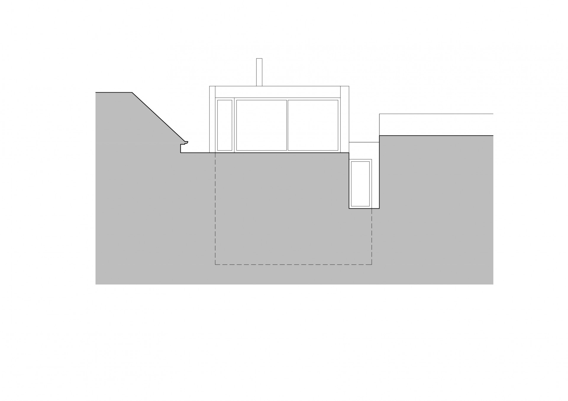Východní stěna hmoty je vysunutá a ustoupená, umožňuje tak prosvětlení ložnice a prostoru chodby ve 2.NP. Hlavní obytný prostor je umístěný v nejvyšším podlaží a je propojený s venkovní terasou a zahradou na jižní straně. Díky tomu, že obytný prostor není po celé své délce dělený, může využívat jak jižní slunce procházejícího ze zahrady prosklenou stěnou jídelní části, tak výhledy na sever do údolí. Právě krásné výhledy do údolí řeky Dyje a na protilehlé skalní svahy s významnými historickými památkami Znojma jsou největší devizou obytného prostoru a celého rodinného domu.