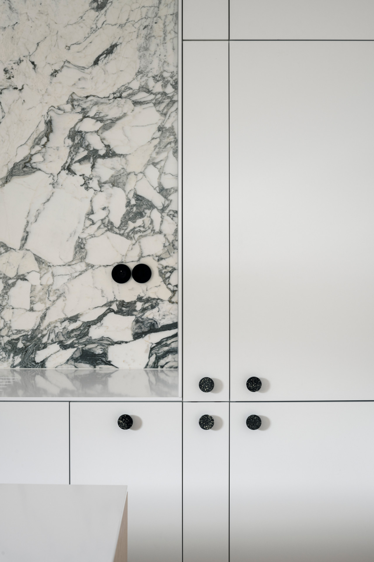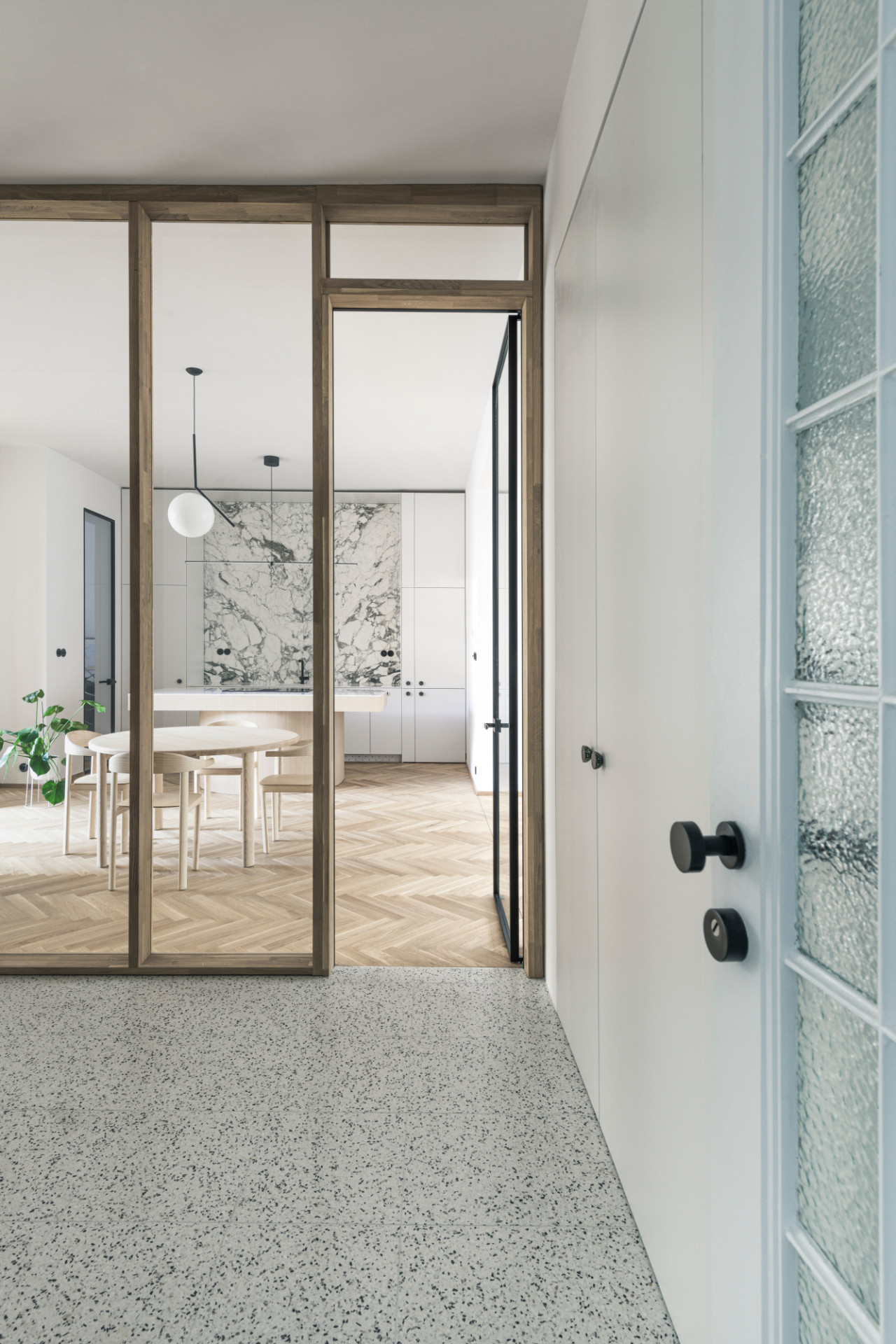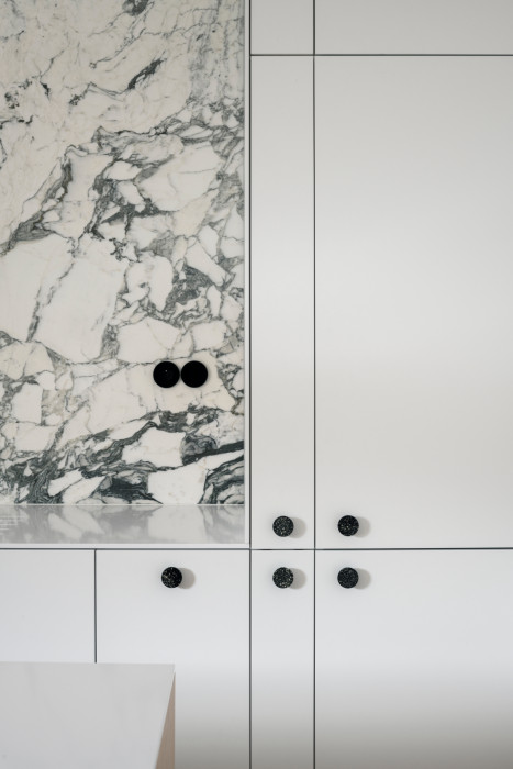Materiálová skladba vychádzala z poznania výstavby a použitia materiálov z obdobia kedy bol dom postavený. Použili sme bielu malovku, terrazzo, drevené vlyskové parkety a drevené stolárske prvky. Novými prvkami je mramor ako kuchynská zástena, kde priraďujeme luxusnému materiálu čisto úžitkovú funkciu či zasklená stena ktorá je aj nie je stenou, keďže má vysoko praktickú funkciu vytvorenia zádveria, ale zároveň priestor vizuálne prepája. Všetky dverné otvory v byte sa stali súčasťami niečoho iného, skrine/steny, tak aby plnili čisto funkčnú úlohu a tým sme nechali v estetike vyniknúť iba pôvodným repasovaným dvojkrídlovým dverám.