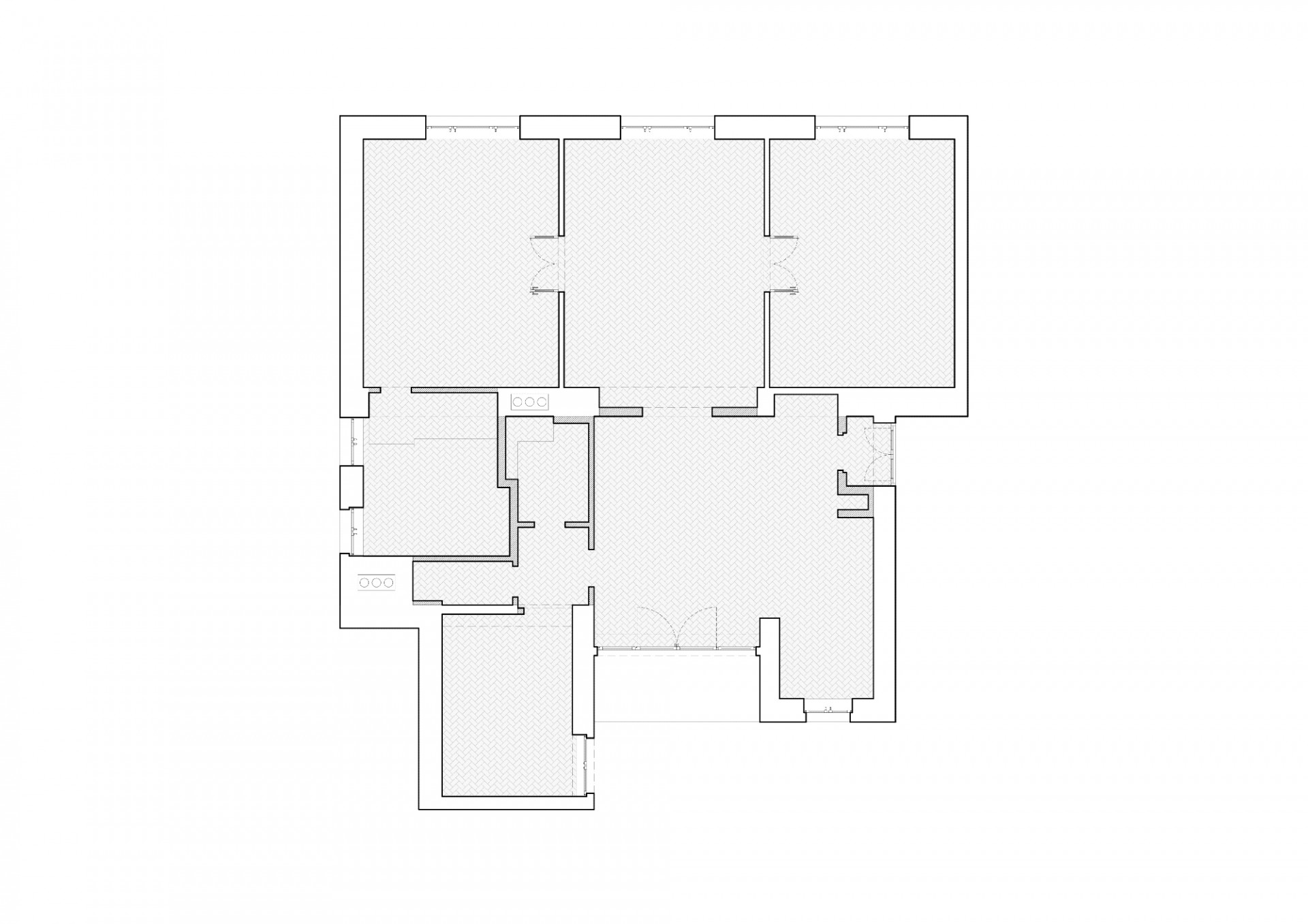 Priestorové riešenie, osadenie otvorov a proporcie rešpektujú a dopĺňajú pôvodnú symetrickú schému bytu. Kuchyňa sa od vstupu presunula k jedálni. Vznikol tak plnohodnotný vstupný priestor s kúpeľňou, prepojený s obývačkou prostredníctvom presklenej steny.