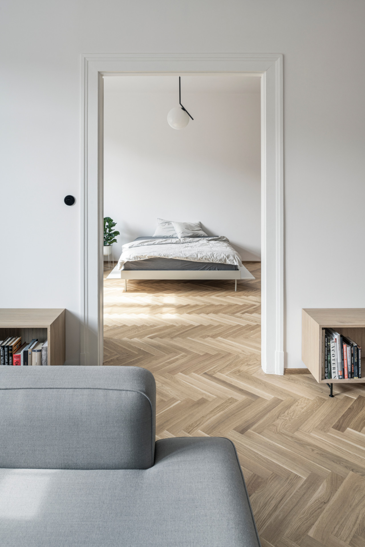 Koncept bytu vychádza z prepojenia všetkých miestností v jeden fluidný priestor. Byt vie poskytnúť intimitu každému z obyvateľov, plnohodnotne poskytnúť komfort hosťom a zároveň sa vie celý otvoriť a fungovať ako jeden spojitý celok. Dispozícia zachovala krásne krížové členenie bytu. Do preplávajúceho spojeného priestoru obývačky s jedálňou sa cez dvojkrídlové dvere vlievajú jednotlivé izby.