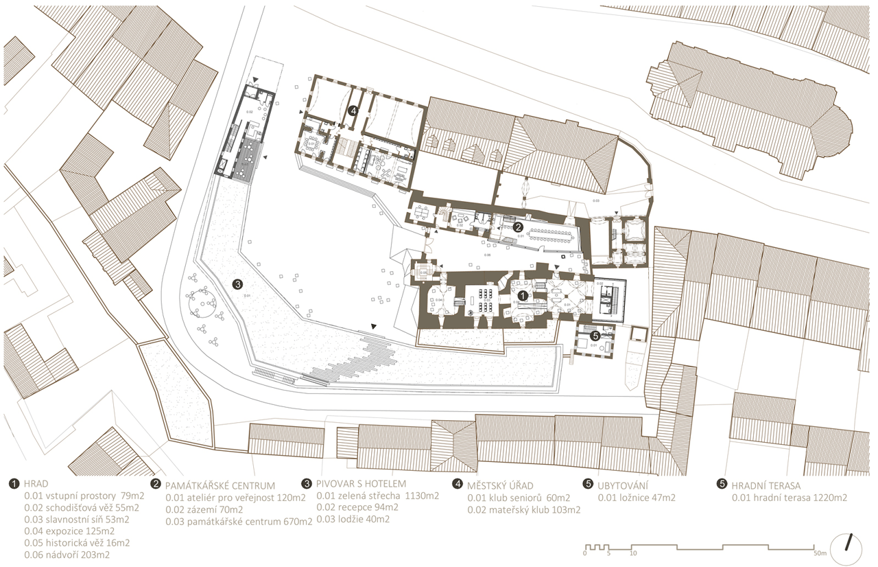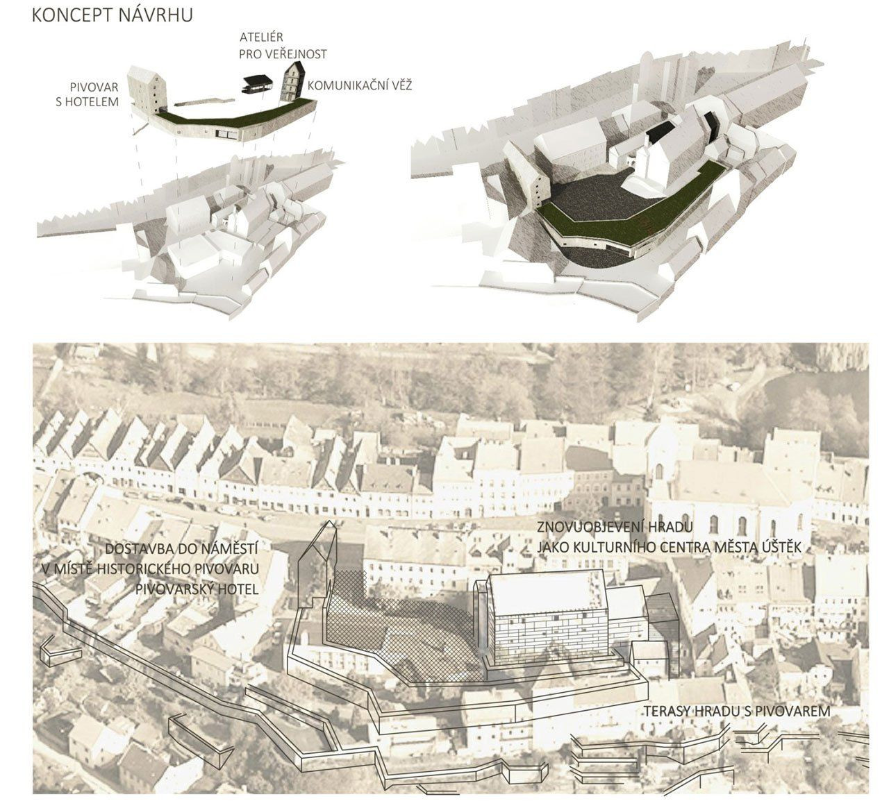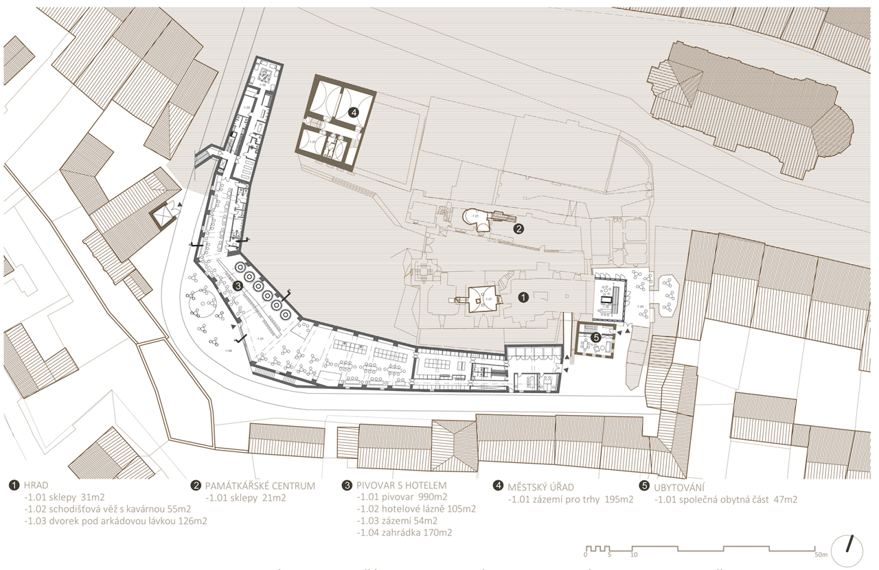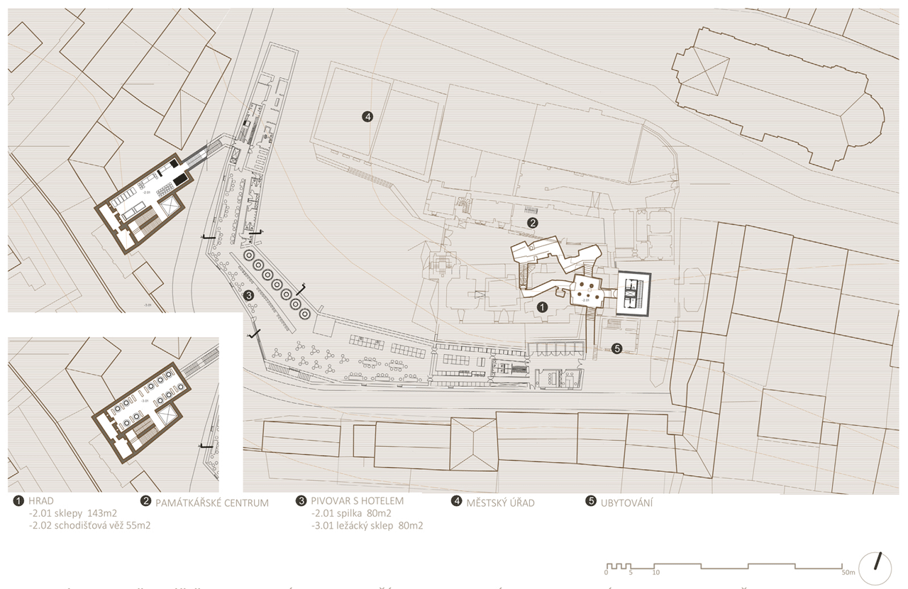 / do uvolněného prostoru po kulturním domu návrh umisťuje dům v terase, ve kterém je ukryta novostavba pivovaru propisující se nad terén hotelem, prostorově definuje nově vzniklý předprostor hradu a zároveň zapojuje do provozu existující historické ležácké sklepy
