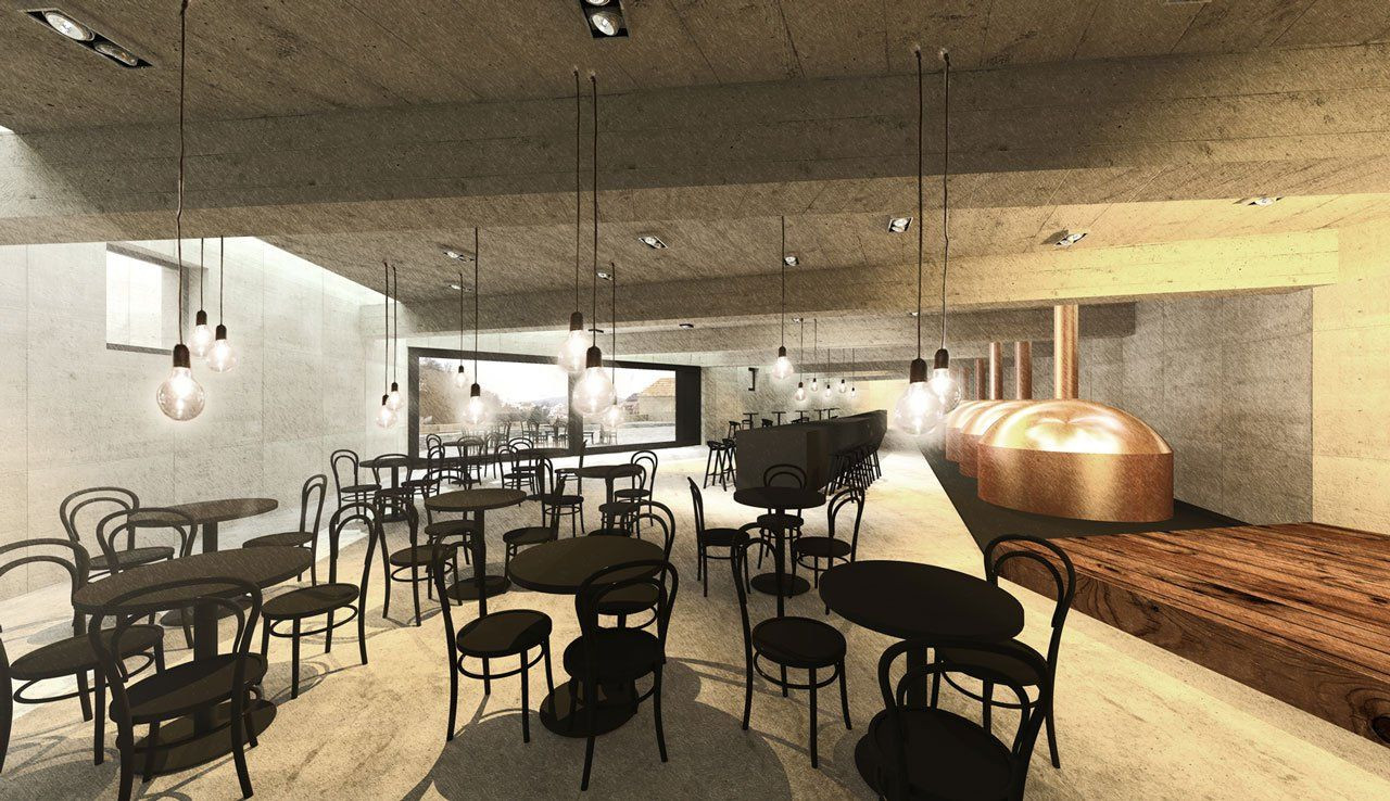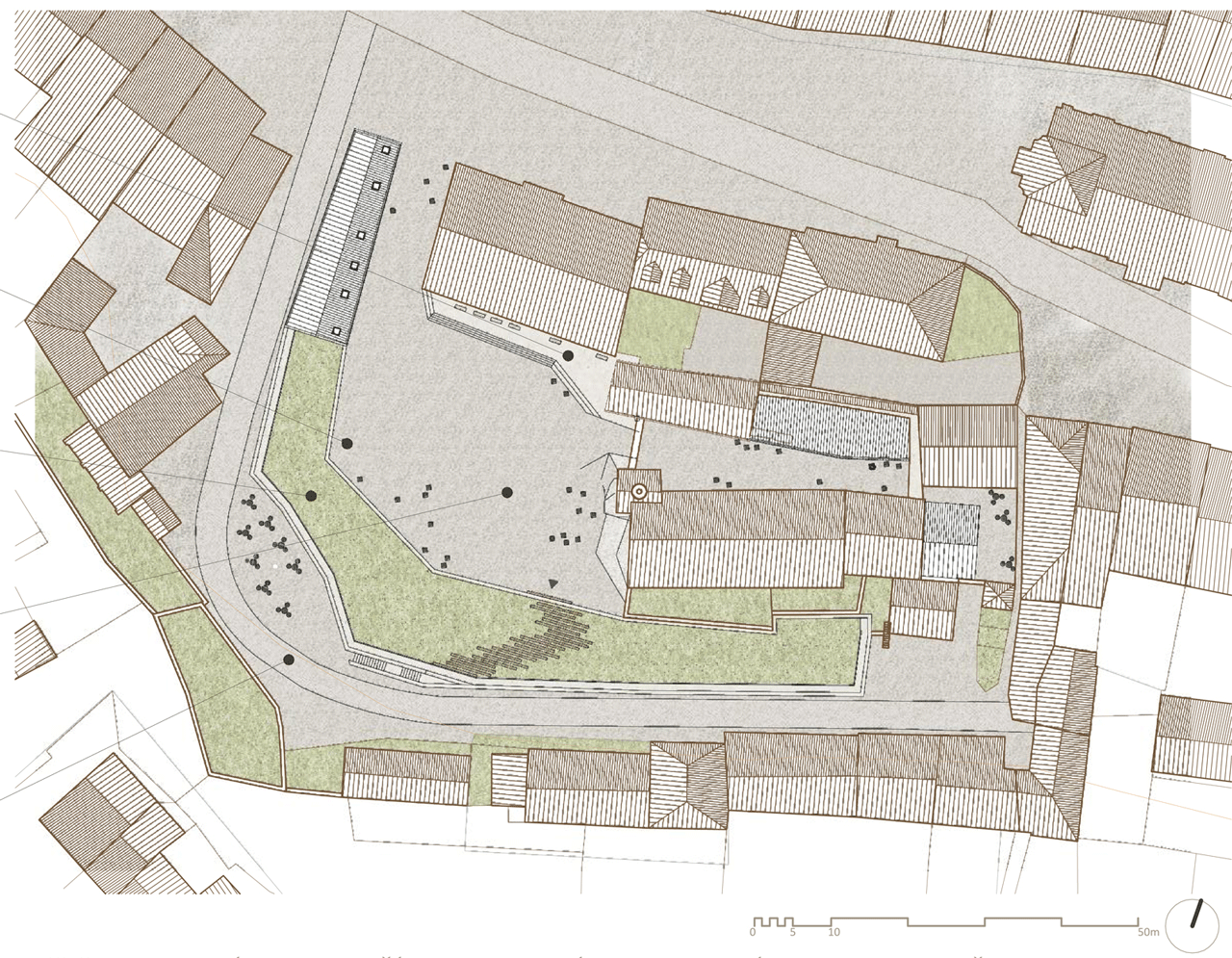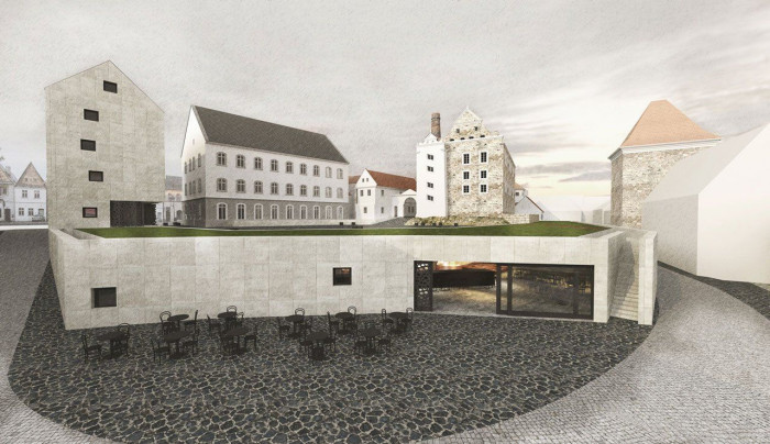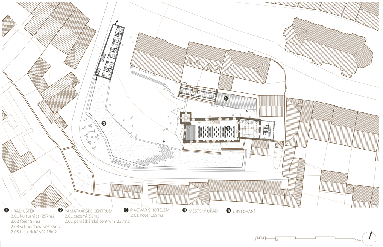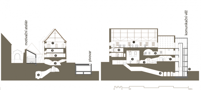 / do uvolněného prostoru po kulturním domu návrh umisťuje dům v terase, ve kterém je ukryta novostavba pivovaru propisující se nad terén hotelem, prostorově definuje nově vzniklý předprostor hradu a zároveň zapojuje do provozu existující historické ležácké sklepy