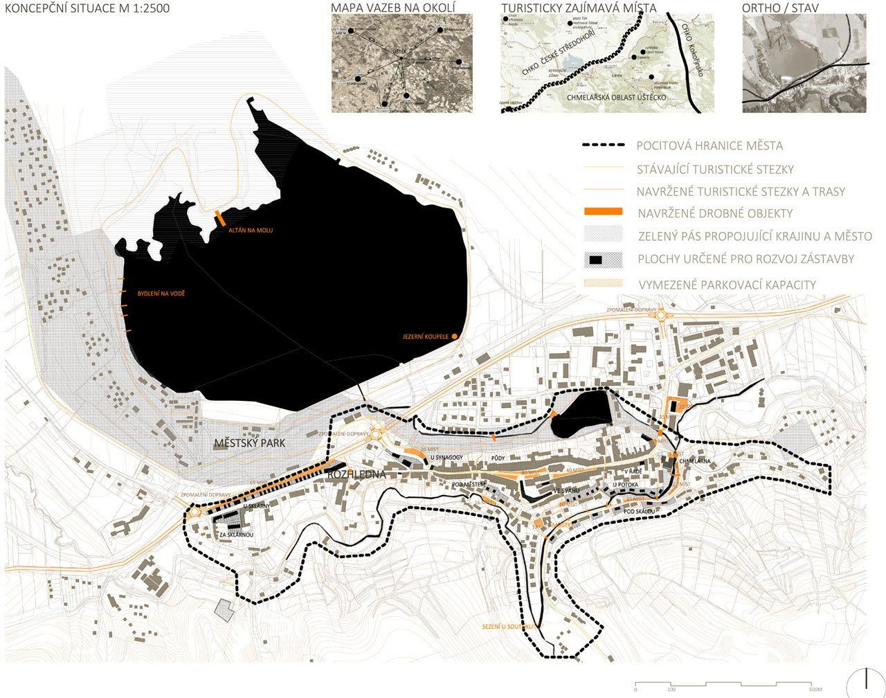 / definováním pocitové hranice města se návrh snaží upozornit na důležitost podpoření zástavby vnitřního města / návrh definuje rozvojové plochy pro obytnou zástavbu, dále se projekt zabývá celkovými souvislostmi města a krajiny, napojením na přilehlou rekreační oblast kolem jezera Chmelař a potlačení současné bariéry, kterou vytváří mezi městem a jezerem rychlostní komunikace s železnicí