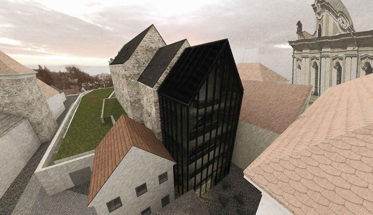 / zpřístupnění hradu pomocí logické organizace jednotlivých prostor a doplnění nového objektu komunikační věže namísto zchátralé jednopodlažní dílny ve dvoře pod arkádovou lávkou na východním konci hradu