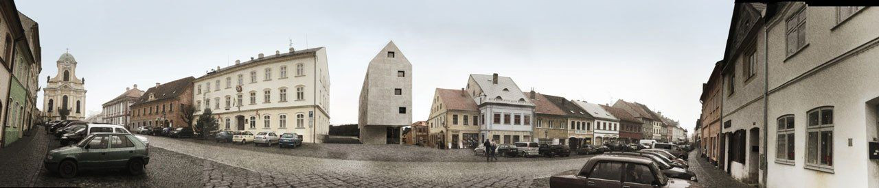 / proluka vedle městského úřadu, kde kdysi stál měšťanský pivovar je bezradně zaplněna směsí jehličnatých stromů umístěných v neudržovaném trávníku, který pomáhá vyrovnat zlom terénu, který se z jedné strany téměř vodorovně přimyká k budově bývalého okresního soudu (dnes Městského úřadu) a na straně druhé postupně klesá v podobě ulice o jednu podlažní úroveň níž, je to dáno rozmanitou morfologií samotného města na ostrohu, tento polootevřený prostor je v druhém plánu ukončen pohledem na kulturní dům, který však svou formou připomíná spíše samoobsluhu stavěnou na malém městě z čistě utilitárních pohnutek