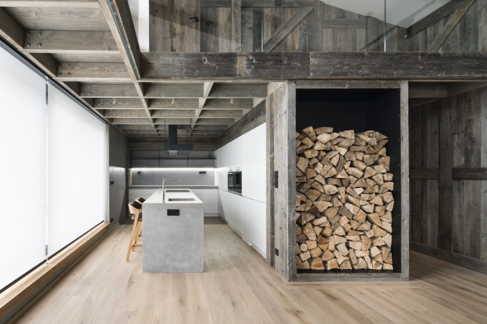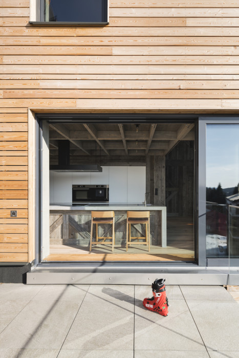 Přestože se jedná o moderní stavbu, která nabízí vše, co současná technická řešení umožňují, uchovala si realizace příjemnou horskou atmosféru. Dřevěné obklady stěn evokují tvarosloví pro lokalitu typického hrázděného konstrukčního systému. Samozřejmostí je provedení interiéru ve vysokém standardu s použitím kvalitních materiálů. Hmoty utvářející vnitřní prostory apartmánu mají přiřazené různé atributy s výrazným materiálovým řešením, které definují prostor a umožňují snadnou orientaci v něm. Architekt pracoval převážně s přírodními materiály, jako je dřevo (kartáčovaný dub, smrk, recyklované řezivo ze starých objektů s patinou a specifickou barevností), ale i ocel (přírodní ocel, nerez ocel a povrchově upravená, černá ocel), nebo beton (vláknobetonové skořepiny, cementovaná stěrka), drásaná kůže a OSB deska. Přírodní materiály pak ve výsledné realizaci kontrastují s monochromatickými materiály, jako jsou lakované plochy a sklo použité v zábradlích a površích koupelen. Vztahy mezi minimalistickým a rustikálním řešením působí ve výsledném dojmu velmi neformálně a zútulňují tak pobyt v interiéru.