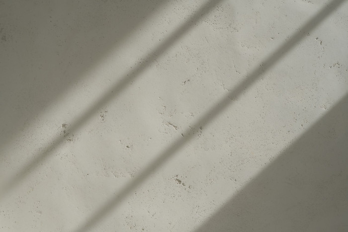 Ústředním motivem interiéru je měkká malba světlem a stínem, podpořená hrou s vizuálním rytmem – obojí komponované použitými materiály a barvami. Základem jsou jemně laděné povrchy v tónech bílé, šedé, béžové, jako například podlaha z přírodního linolea nebo stěny s hliněným výrazem. Pečlivě zvolenými kontrapunkty nastoleného barveného klidu jsou pak antracitový kruh jídelního stolu z břidlice a dva sytě modré ortogonální prvky (obě díla autorky Patrície Koyšové) umělecky pojednaný televizní stolek a obraz na protější stěně.