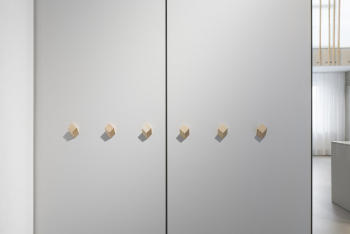 Efekt střídání barevných lomených tónů se odráží i v jemné konstrukci úložných prostor řešených truhlářskou výrobou na míru. Maximálně využitý prostor vstupní chodby, mimimalisticky řešená šatna či dveře nenápadně zapuštěné do stěny obývacího pokoje dávají vyznít geometrii bytových doplňků.
