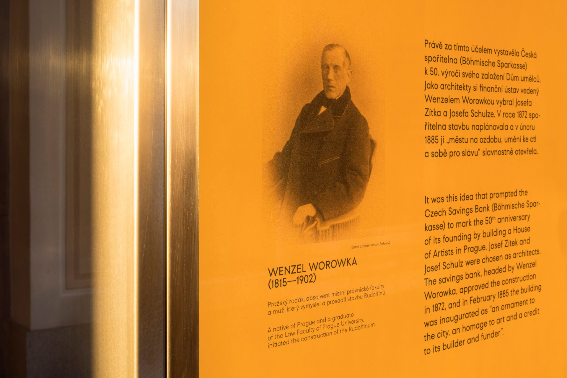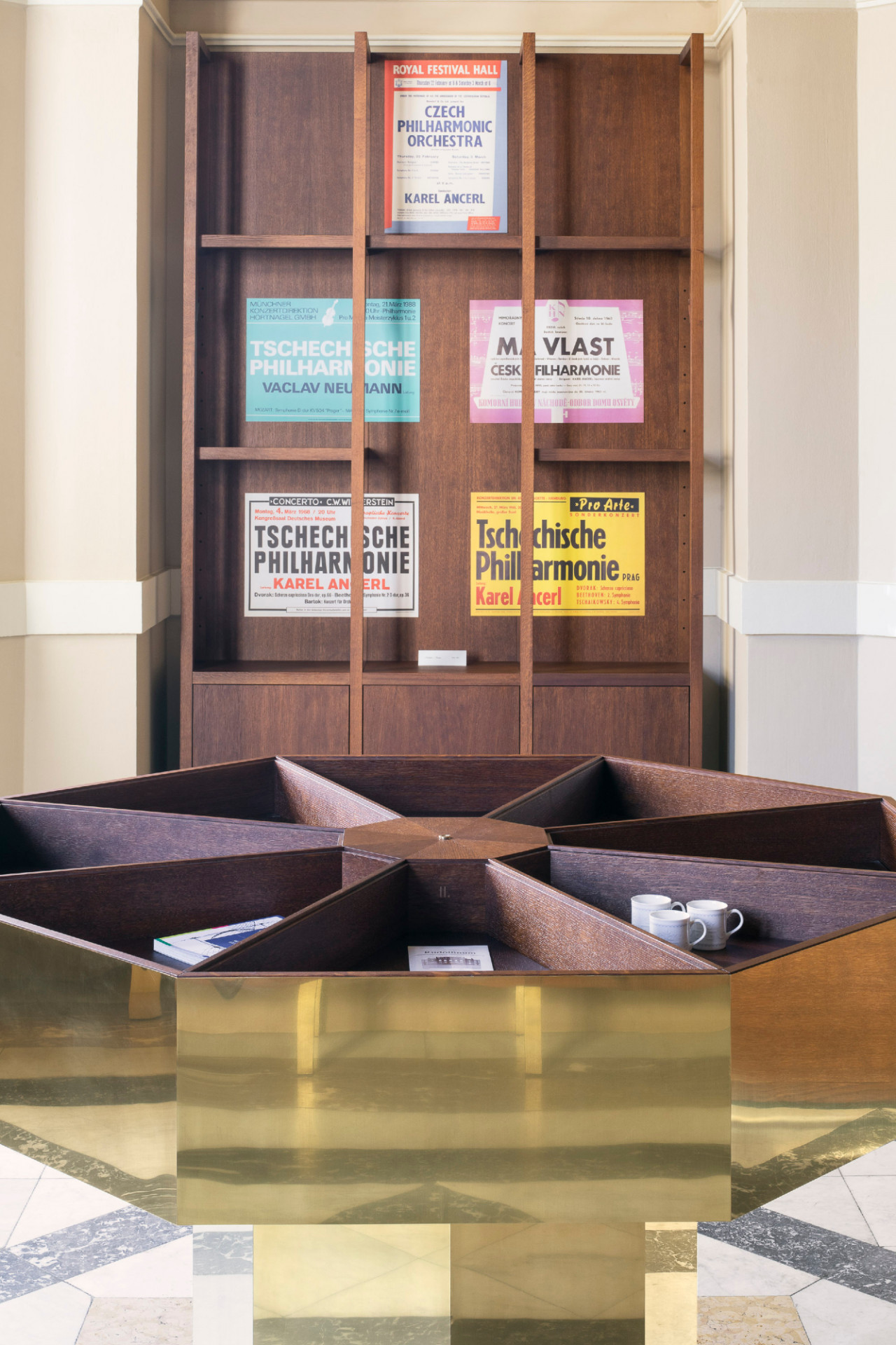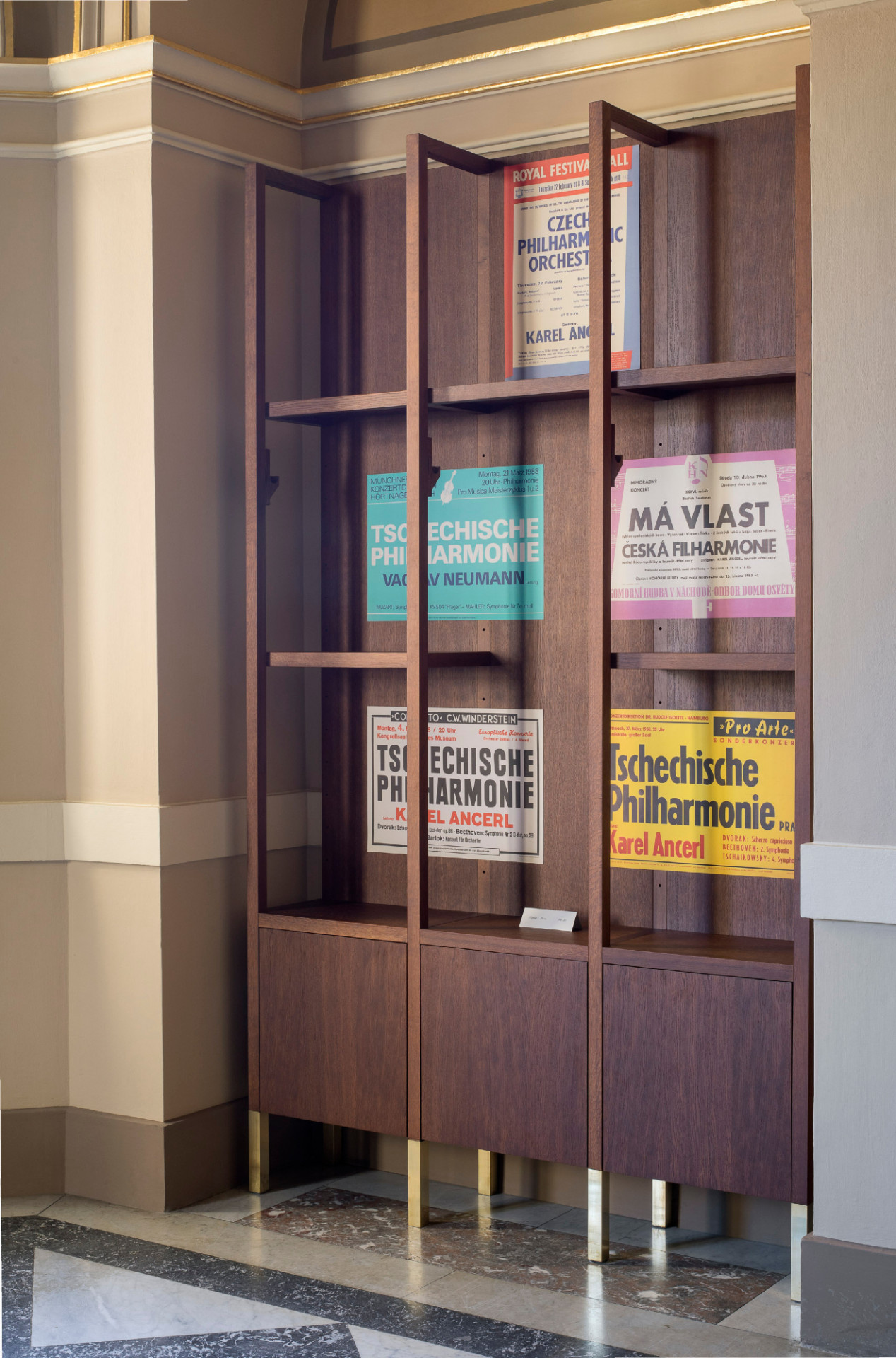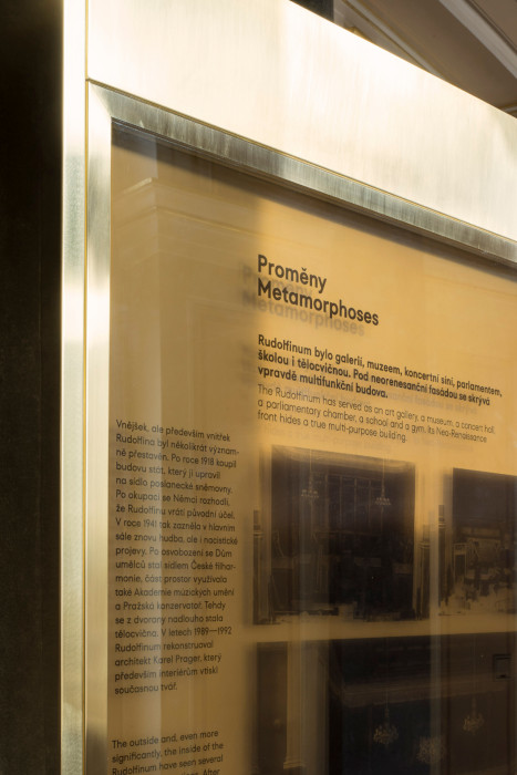 V rámci zadání soutěže (pořádané v roce 2018-2019 organizací Czechdesign) požadovala Česká filharmonie doplnit do prostor předsálí nové využití – předělat obchod se suvenýry, přidat možnost poslechu hudby a umístit sem výstavu s trvalou expozicí o historii budovy. Prvotní záměr návrhu byl jednoduchý – v prostoru předsálí nepřekážet v průchodu a ani ho vizuálně nerušit, funkce soustředit co nejvíce do krajních salonků. Nosiče výstavy, záměrně vyosené a zkosené, proto pomyslně maskuje efekt zrcadlení, zdálky jako tajemné obelisky lákají blíže k salonkům a až víc zblízka odkrývají obsah výstavy.