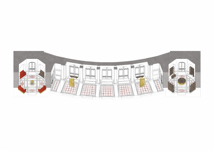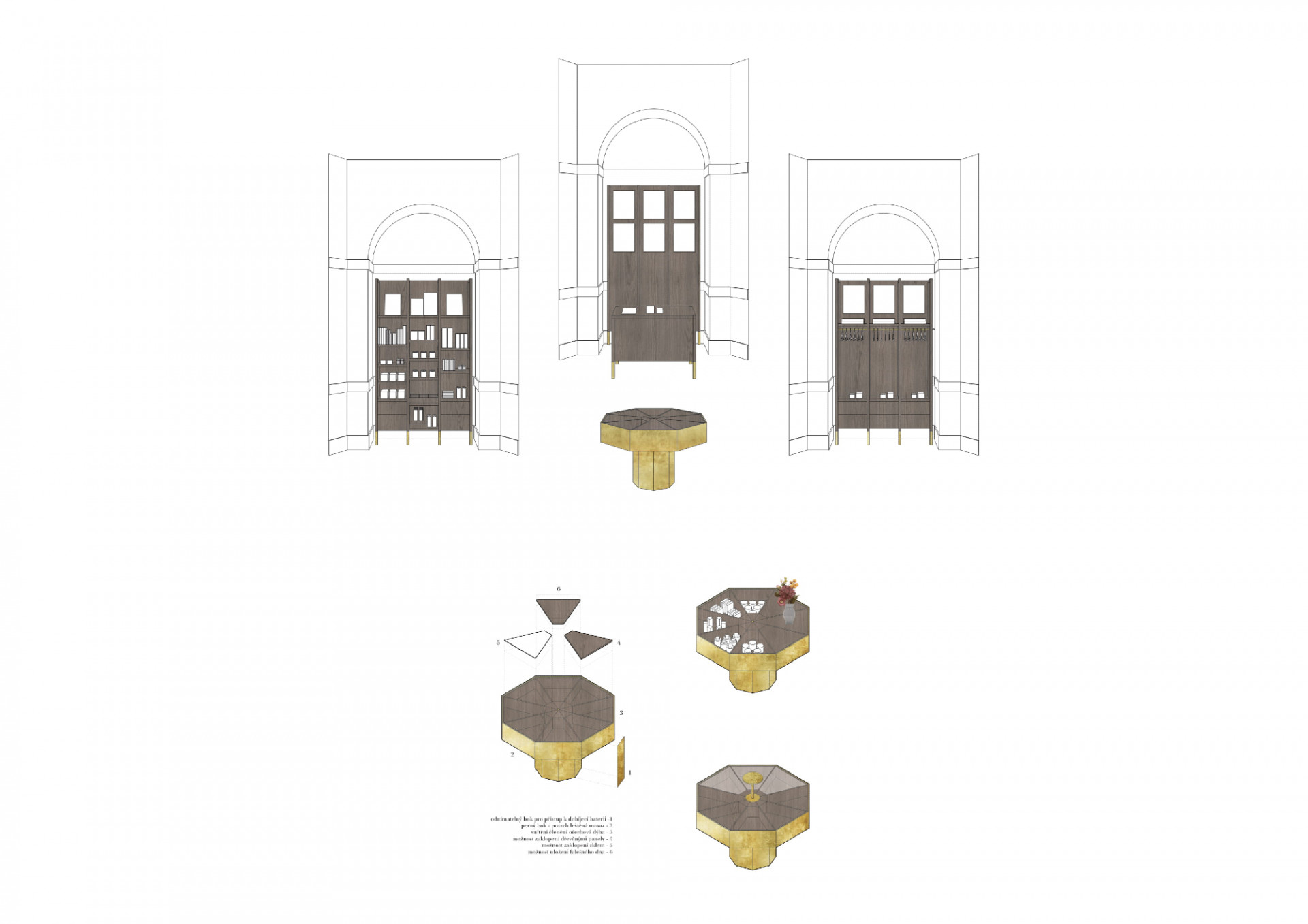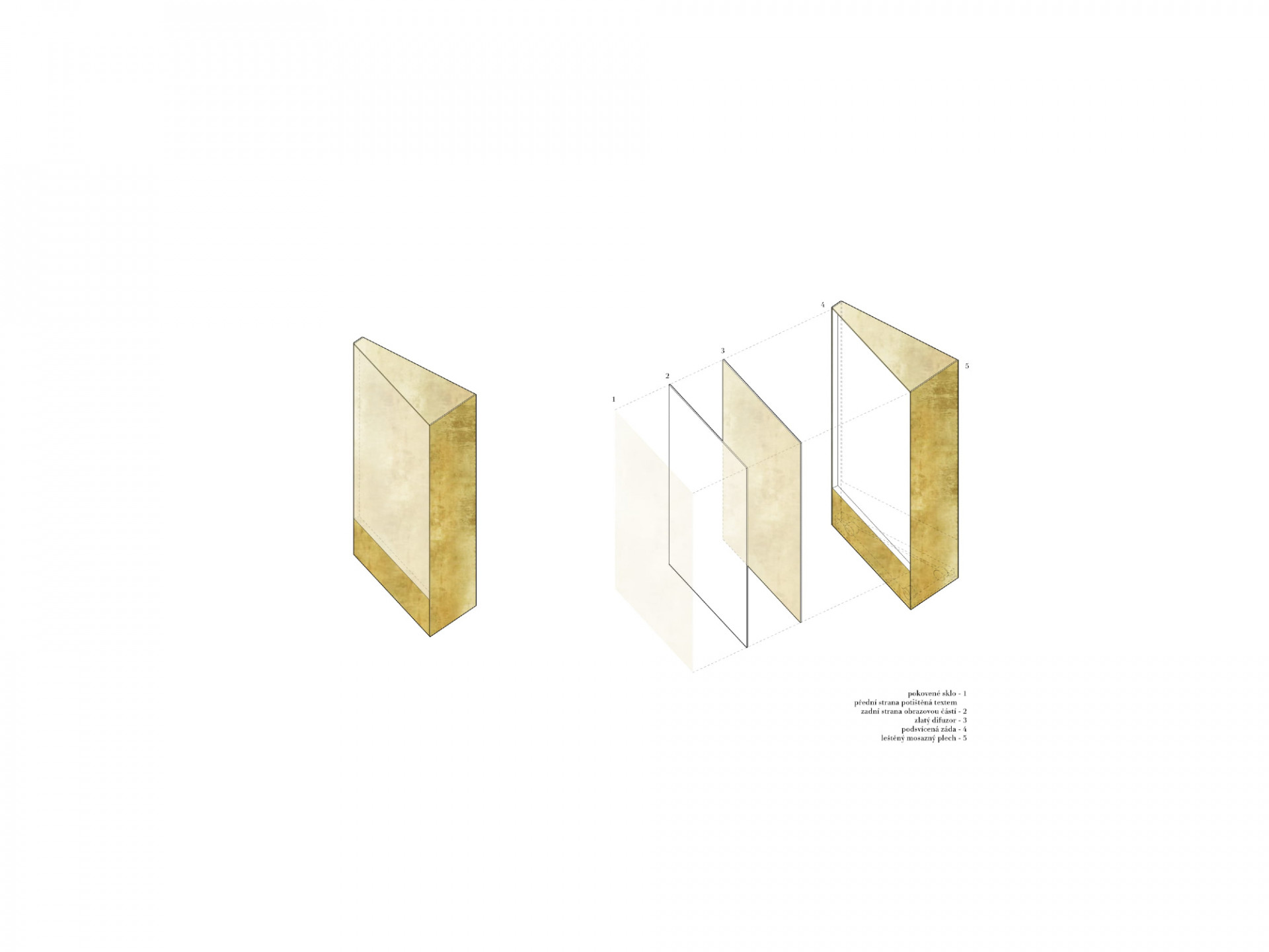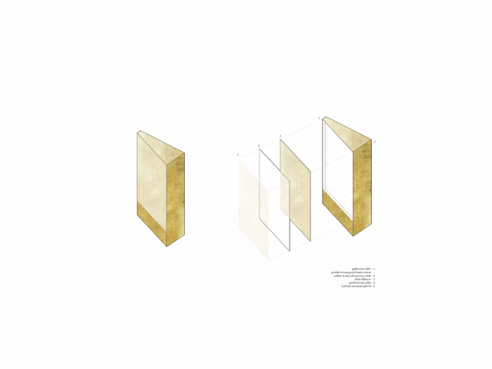 Záměrem bylo umístit požadovanou výstavu do předsálí tak, aby nevznikl jen nosič informací, ale svébytný objekt se vztahem k prostoru. Instalaci proto tvoří dva vertikální objekty, lehce monumentální ale měřítkem záměrně podřadné historickému prostoru, respektují jeho symetrii i hlavní průchody. Objekty jsou posazené v krajních polích předsálí zrcadlově proti sobě, v podélném směru mírně vyosené, aby nestály v cestě do krajních salonků. Jejich tvar vychází z hlavní trasy při průchodu předsálím, zúžená čelní stěna se maskuje zrcadlením, aby objekty zdánlivě splynuly s okolím. Skrz zrcadlení v plechovém obkladu kratších stran i skrz lichoběžníkový půdorysný tvar se při pohybu prostorem vnímání objektů proměňuje, díky tomu nepůsobí jako pevné vybavení a lákají návštěvníky k sobě a tím i dál do krajních salonků.