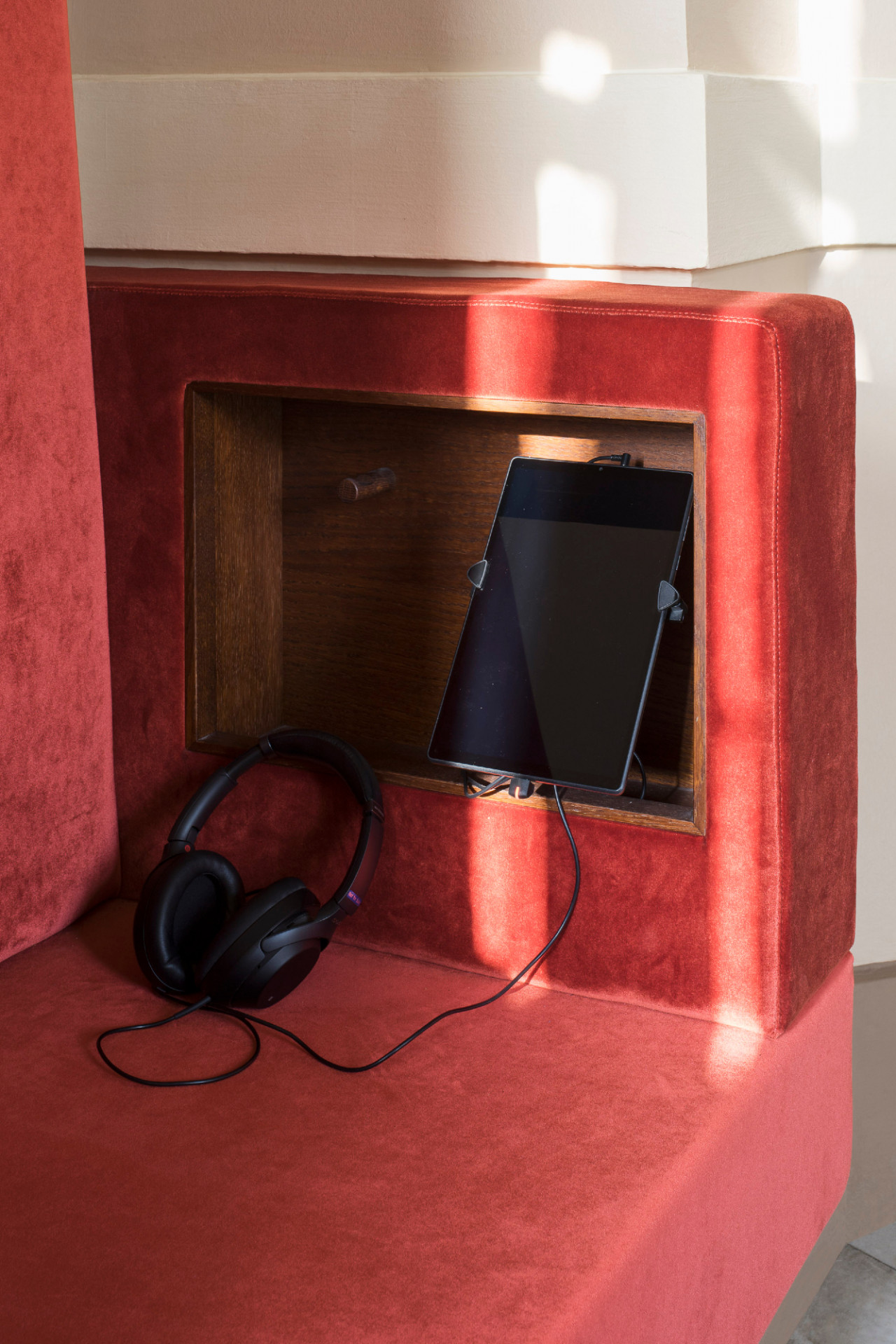 Podobné radiální řešení jako v obchodě má i druhý salonek, kde je v nikách mezi okny vestavěné sezení. Tři sametem polstrované lavice mají v sobě integrovaná sluchátka a ovládání pro poslech hudby, jedna dřevěná lavice mezi dveřmi ve svých zádech nese knihovnu s policí pro čelní vystavení publikací a lampičky.