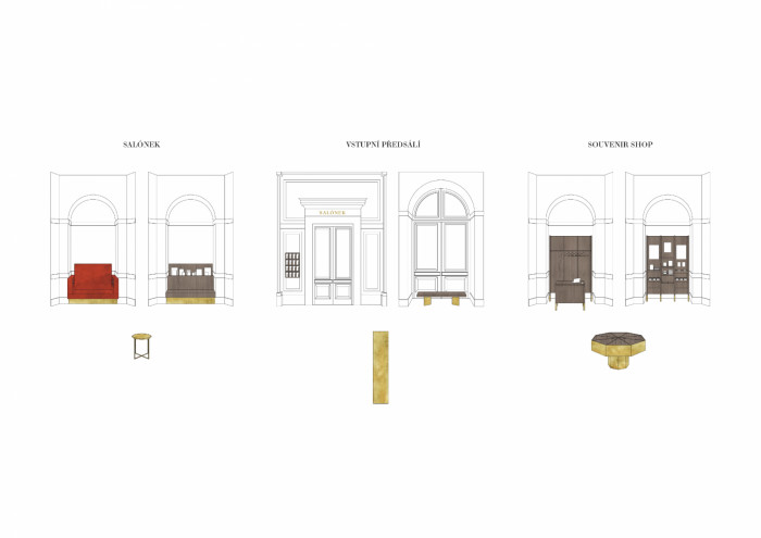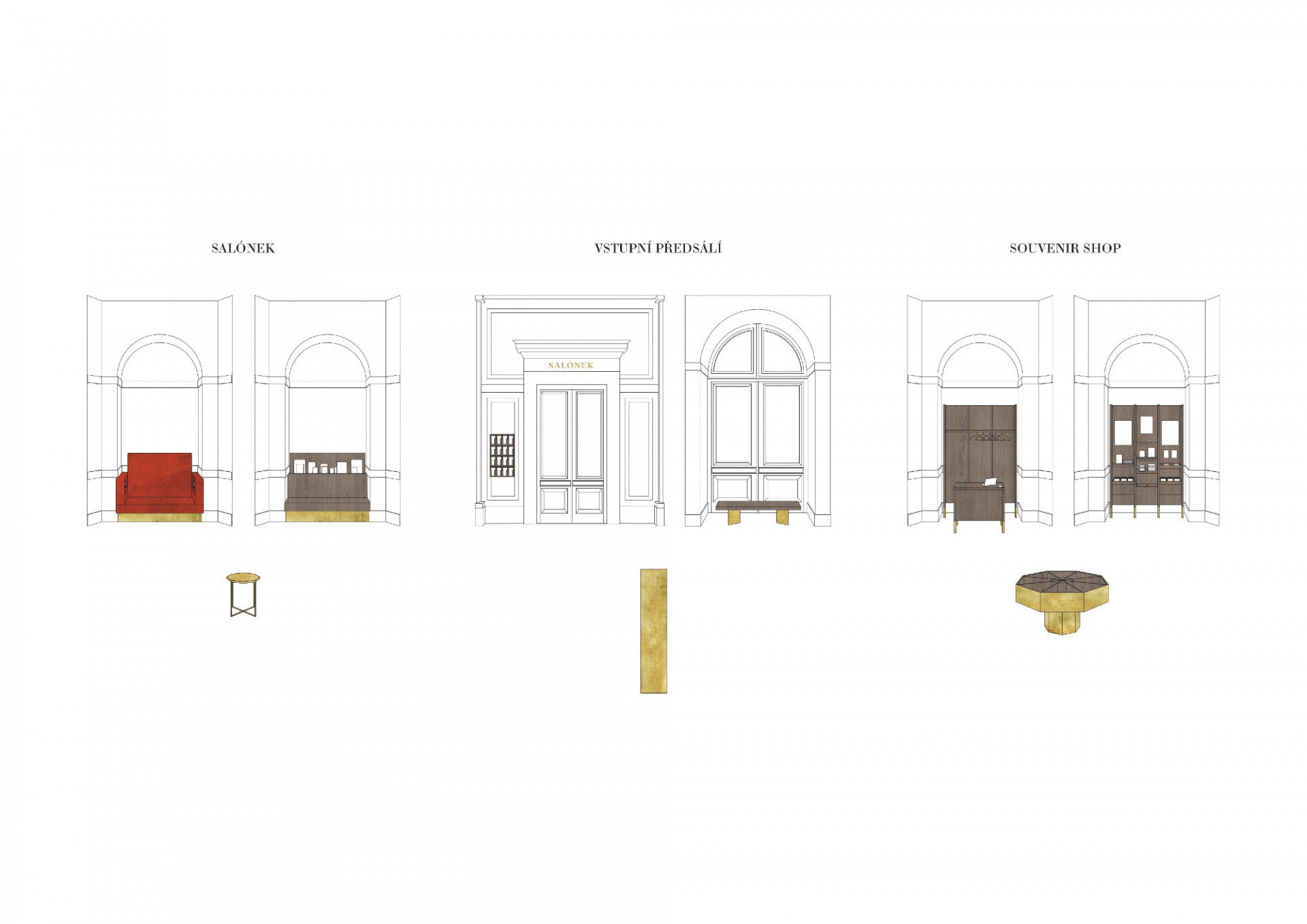 Interiér obou krajních salonků vychází z jejich radiálního půdorysu a propisuje v sobě oktogonální tvar. V obchodu se suvenýry tvoří středovou dominantu prodejní stůl s možností expozice pod sklem pro vzácnější zboží anebo vybranou kompozici na stole při jeho zaklopení. Hlavní prodejní plochu vytváří policové stěny v nikách po obvodu místnosti, konstrukce mají jednotný rastr a v něm variabilní prvky na různé zboží. Plná záda všechny věci vizuálně sjednocují, rastr konstrukce naopak člení na různě velká pole, aby se různé exponáty vzájemně nerušily. Prodejní pult s pokladnou je přisazený k nice mezi dveřmi pro dobrý kontakt prodejce se zákazníky i celkový přehled.