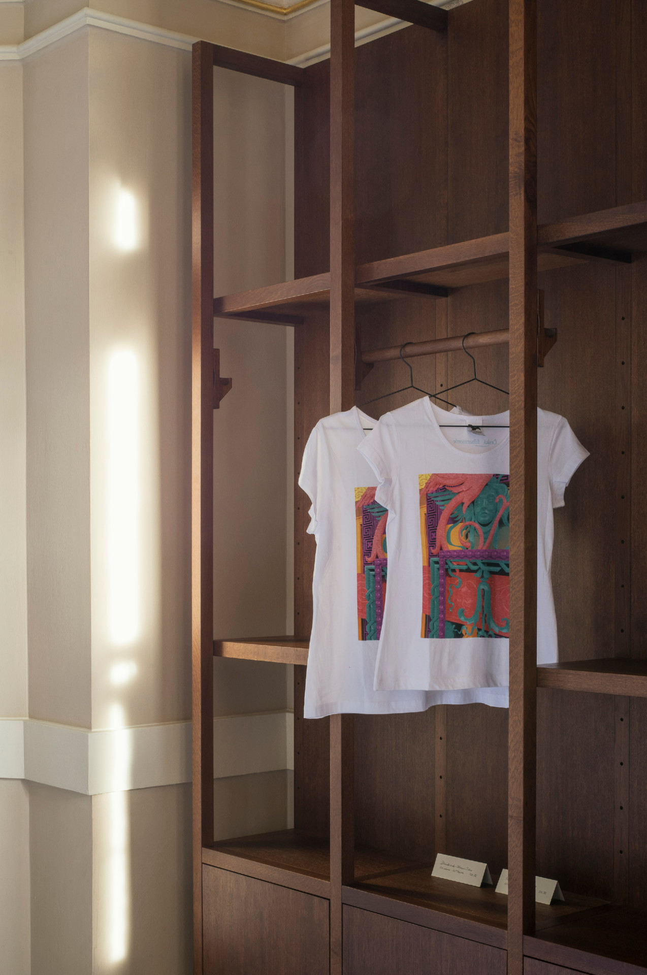 Hlavním materiálem vestavných policových stěn v obchodě je tmavá dřevěná dýha, která navazuje na rámy dveří a oken, vytváří pocit solidnosti a poskytuje jednotné pozadí pro všechny vystavované věci.
