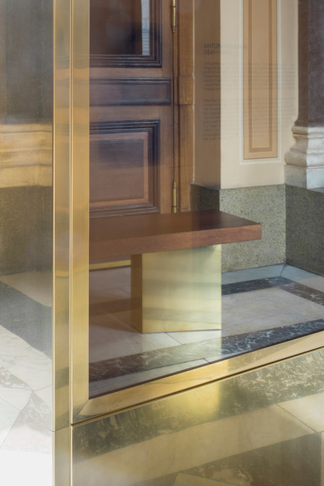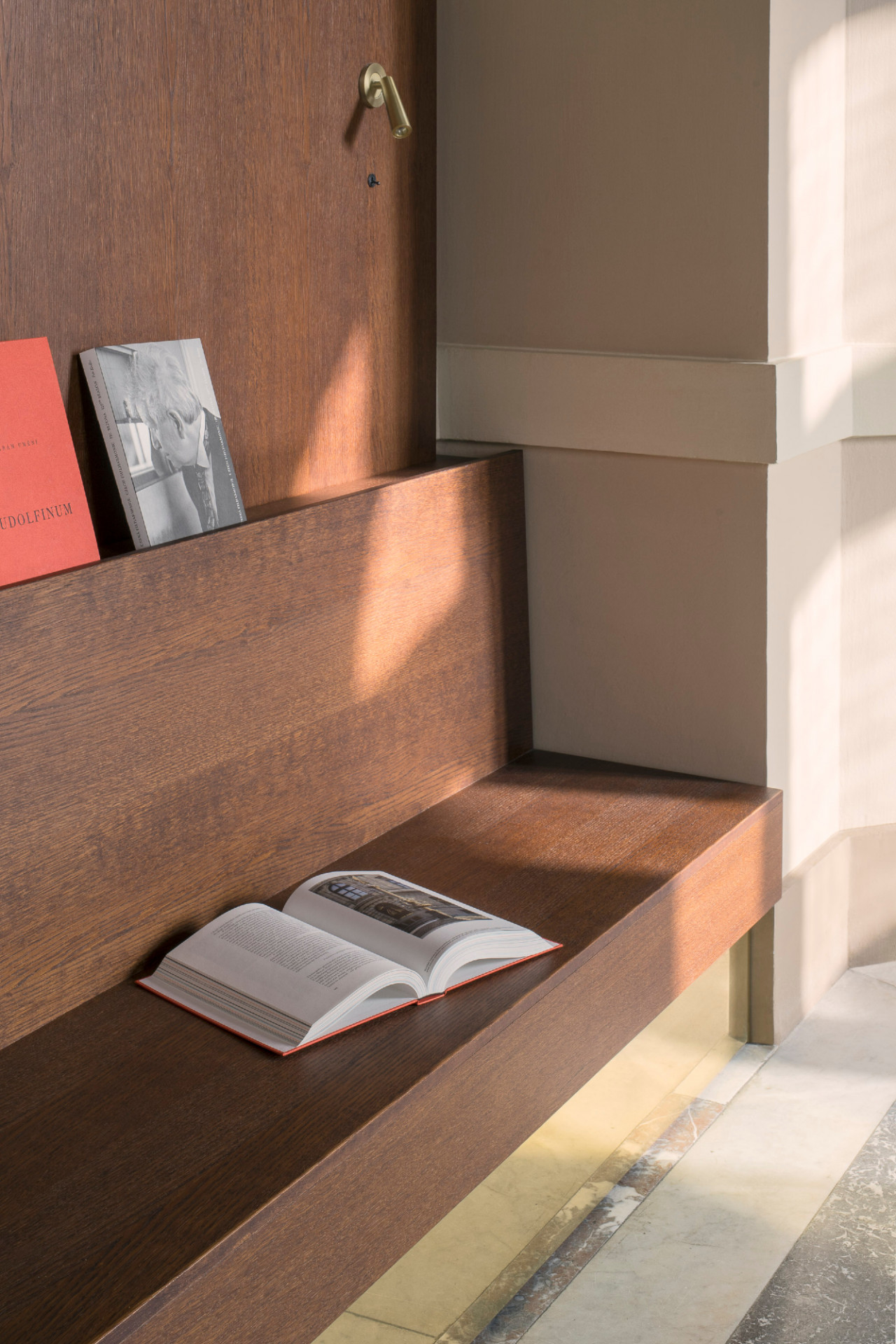 Sedací nábytky v salonku mají mosazné sokly a čalouněné sedačky jsou v červeném sametu. Lavice s knihovnou je dřevěná stejně jako vybavení obchodu. Všechen vestavný nábytek se tak do historického prostoru snaží zapadnout a působit nenápadně.