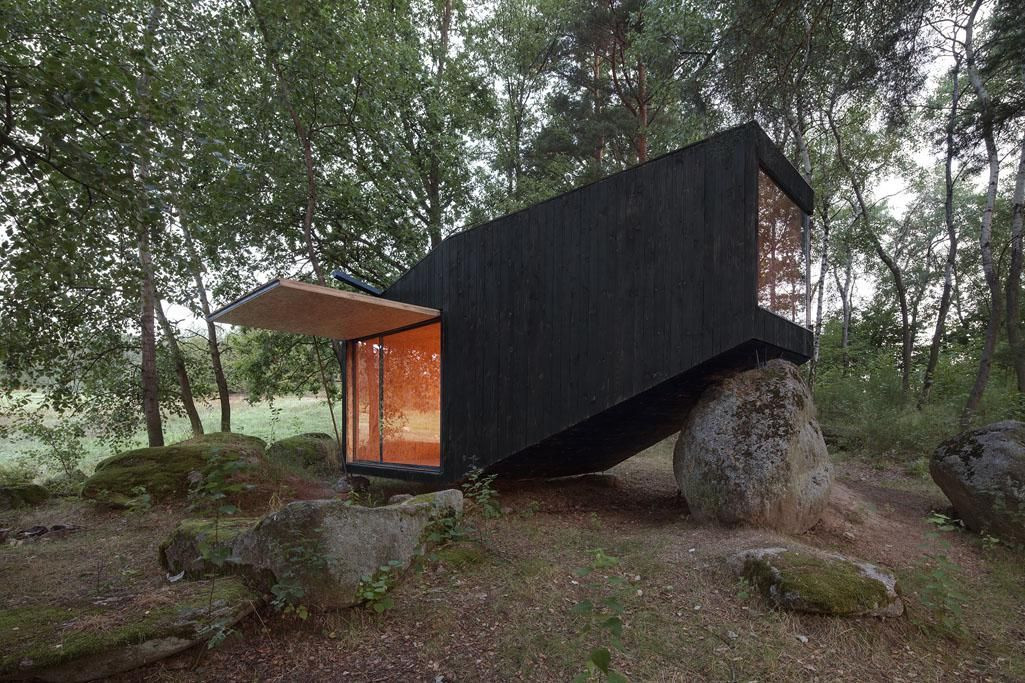 Navrhli jsme kompaktní uzavřený objem, volně stojící objekt na balvanech se zvedlou zádí na velkém balvanu. Uzavřený černý objekt z opáleného dřeva. Uvnitř skrývá jeden spojitý vnitřní prostor o rozměrech 3,1x 5,8m. Ve vstupní části volná rovná plocha v délce 2,3 m s výškou tak akorát pro stojícího člověka, otevřená velkou prosklenou plochou na výhled. Zbytek délky objektu je stupňovitě zvednut k otvoru směrem do korun stromů zakončen plochou pro ležení. Tedy prostor multifunkční nejen na přebývání, ale i na menší akce, představení, rozjímání atd. Pod jednotlivými stupni je úložný prostor, překlopením jedné z lavic vzniká druhé dvojlůžko. Oba prosklenné otvory se zavírají velkými okenicemi , ten větší pomocí kladky a navijáku s klikou. Pro chladnější období je stavba vybavena malými kamny s zaústěnými do plechového komínu.