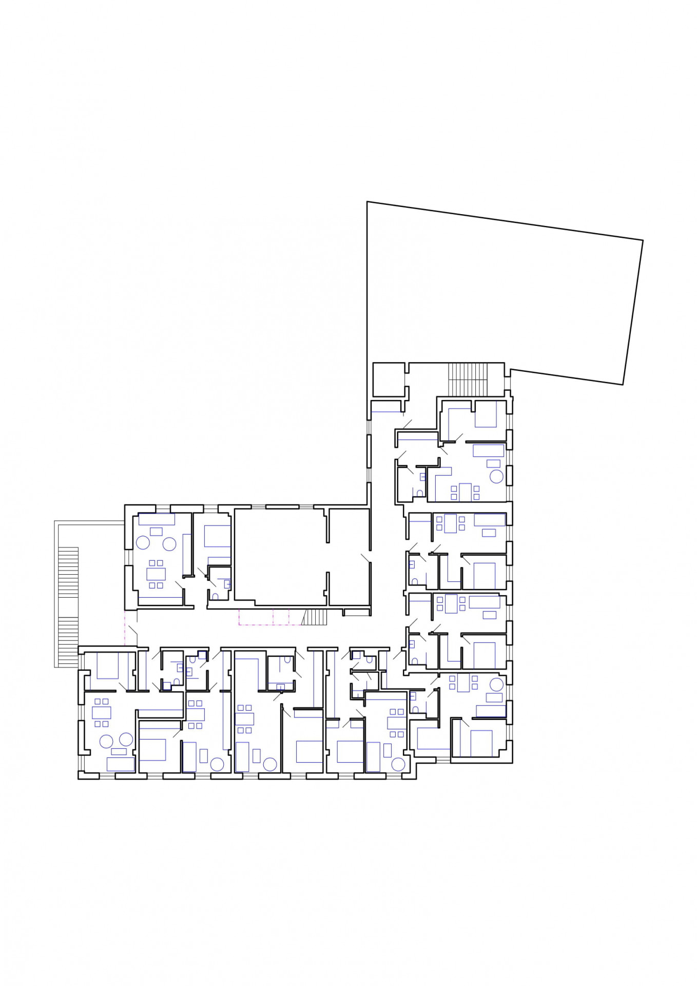 Odbouráním schodiště a části jednoho traktu ve 2. NP původního nákupního střediska byl vyrovnán nepoměr objemů obou původních staveb nákupního střediska a pošty. Tím vznikla hmotová nárožní figura se dvěma koncovými štíty a střední nižší částí.
