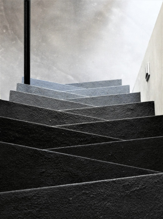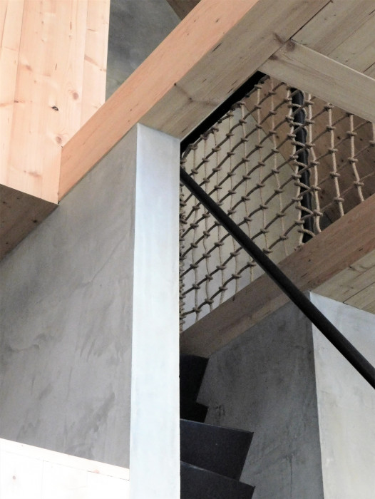 Podlaha přízemí je materiálově sjednocena cementovou stěrkou, která se vizuálně opakuje jako pohledová stěrka na štítové stěně, na stěnách schodiště a v hygienickém zázemí. Podlaha ve výstavní místnosti má svůj příběh. Na večírku před finalizací stěrek udělalo vylité červené víno na podlaze skvrny a tak bylo rozhodnuto podlahu dobarvit dalšími rozlitými lahvemi. Tak má stěrka pod Máňou originální odstín, je z odrůdy Cabernet. Ostatní stěny a šikmé podhledy tvoří dřevěná podlahová prkna v přírodním odstínu. Ocelová svařovaná konstrukce schodiště a zábradlí galerie mají černošedý nátěr. Mobiliář je vyroben na míru místním truhlářem, dřevěné variabilní stoly z masivu jsou doplněny lehkými plastovými červenými židlemi. Uspořádání se mění podle společenských akcí.