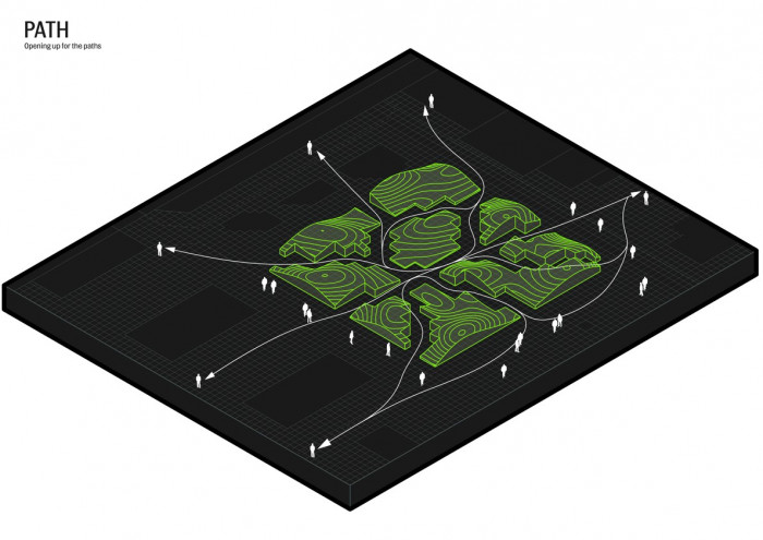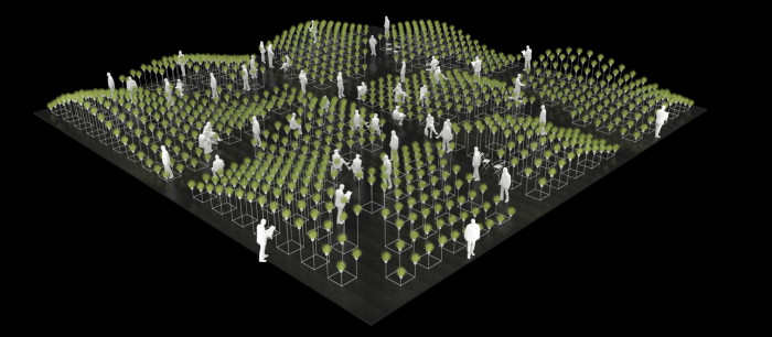 Všechny rostliny jsou rozmístěny v celé instalaci náhodně a v různých výškách podle výšky konstrukce, kterou chápeme jako analogii kmenů lesa nesoucí větvě s listy. Celá levitující topografie klesá směrem do středu instalace, kde jsou rostliny položeny nejníže, aby vytvářely pomyslnou louku.
