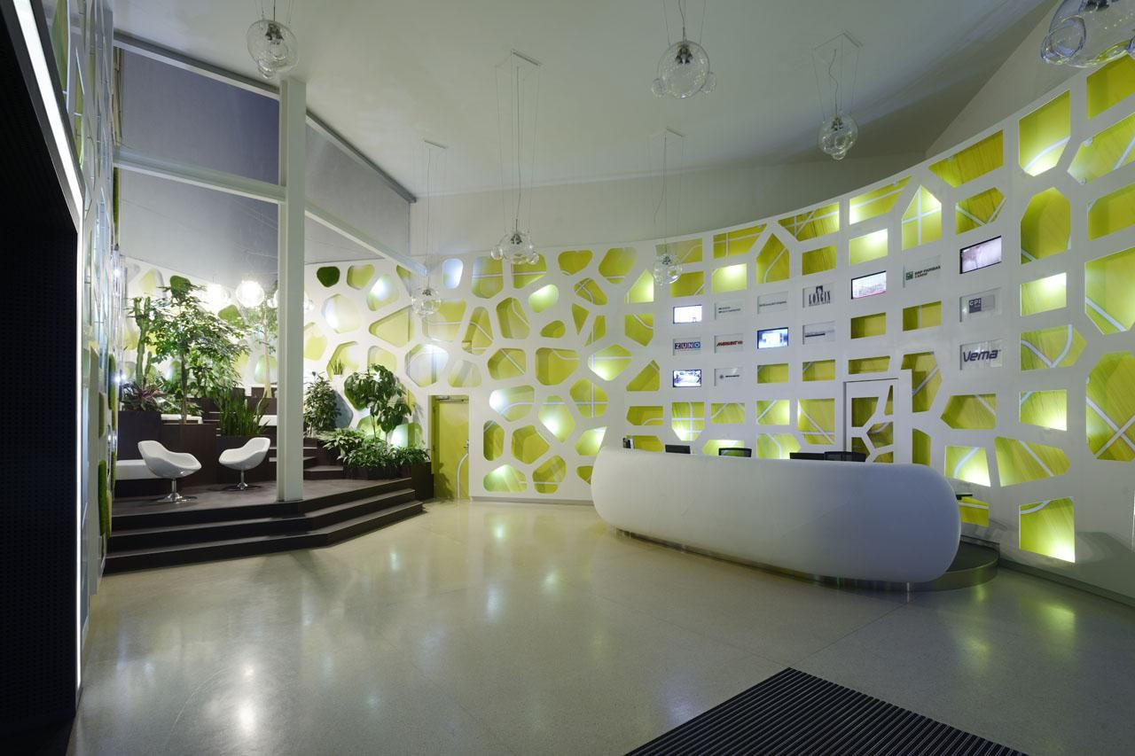 Prostor recepce a atria je „obalený“ perforovanou corianovou stěnou, která prostory sjednocuje a jasně vymezuje prostor změny. Perforace vychází z Voronoi diagramu – buněčné struktury a od recepce přechází směrem k atriu z pravidelných tvarů do organických. Tedy z technického prostředí do přírodního. To vše je podbarveno nasvícenou grafickou tapetou navrženou na míru konceptu. Recepce je velitelským můstkem s měkkým recepčním pultem organického tvaru, příjemným na dotek. Atrium se stalo kyslíkovou místností s bujnou vegetací. Návštěvník se v atriu vydává na rozeklanou cestu vzhůru jako by stoupal po skalách Giant Causeway v Severním Irsku. Nad atriem a recepcí se ve vzduchu vznáší molekuly vody „zavlažující rostliny“ – atypická skleněná svítidla na míru vyrobená ve sklářské dílně v Novém Boru. Každý kus je ručně vyráběný originál.