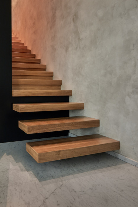 Interiér nově rekonstruované garáže odpovídá v důrazu na detail vozovému parku. Návrh dal vyniknout fragmentům historického domu. V monochromatickém industriálně laděněném interiéru barevně vystupuje původí “nedokonalá” cihelná stěna a pískovcová podezdívka v prostoru pod schodištěm.