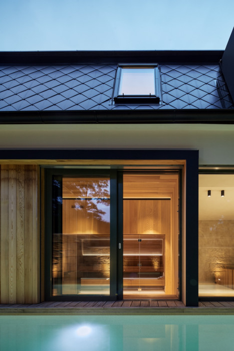 Prostor určený pro wellness byl původně polosuterénní, postrádal dostatek denního světla a kontakt s přilehlou zahradou se vzrostlými stromy. Přístup světla byl vyřešen odkopáním části zahrady a maximálním otevřením severní stěny směřující do zahrady. Ve vytvořeném prostoru podél domu byl následně usazen lineární bazén.