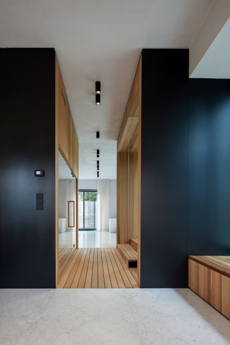 Na zahradní fasádě se kromě velké míry prosklení výrazně projevují i dva současně pojaté objekty, které prochází skrz fasádu do interiéru. Černým plechem obložené kvádry v sobě integrují saunu ve spodním patře a balkón s posluchárnou v patře horním. Vnitřky objektů jsou obloženy cedrovým dřevem, které kontrastuje s jinak monochromaticky laděný interiérem, ve kterém dominuje bílý mramor a cementová stěrka.