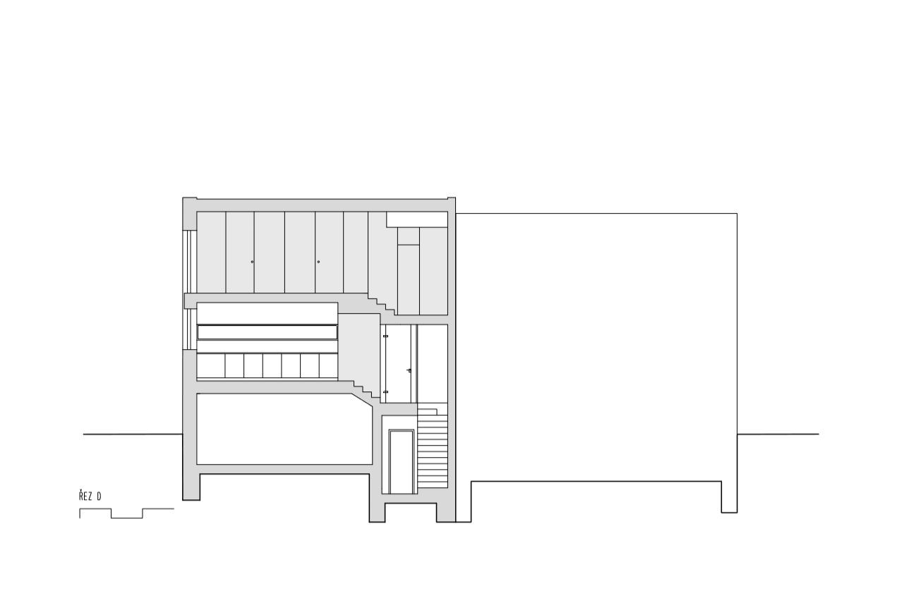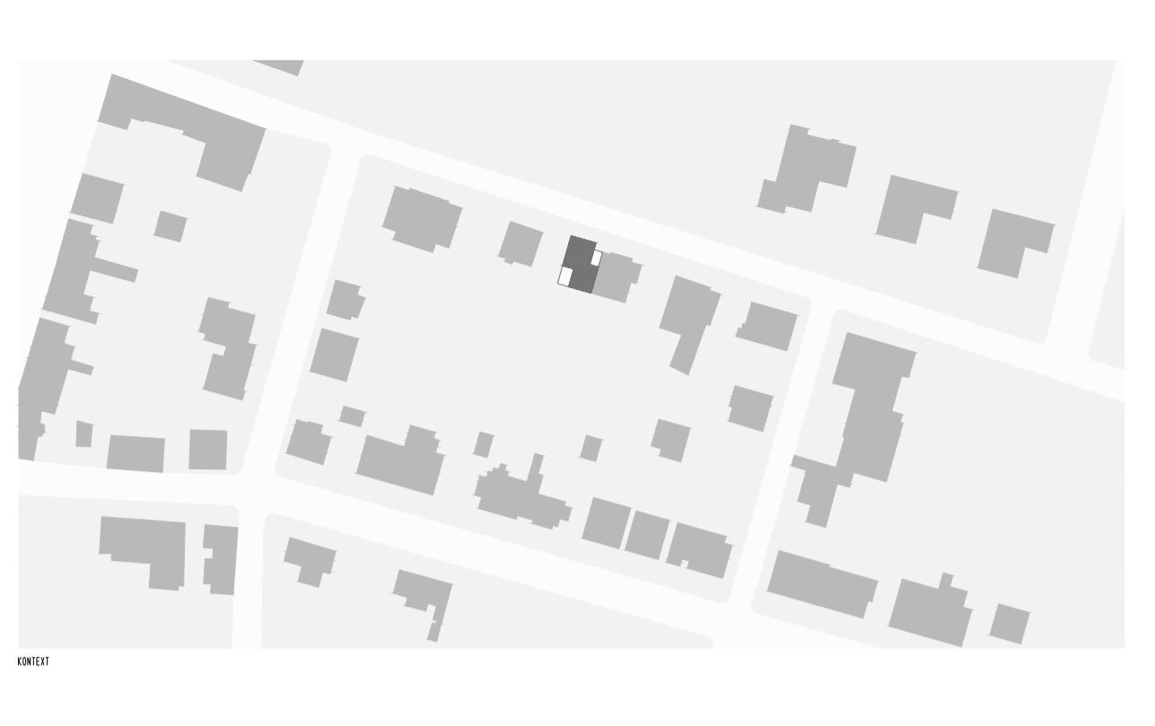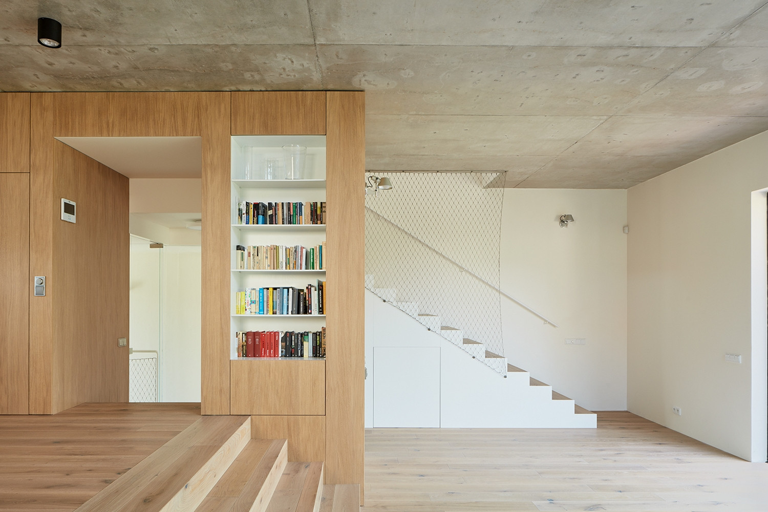 Součástí projektu byl návrh vestavěného interiéru na míru. Nábytkové prvky hrají důležitou roli v členění obytného prostoru. Na obývák navazuje pobytová dřevěná terasa směrem do zahrady. Oplocení do ulice kombinující beton a dřevo se snaží kultivovat veřejný prostor.
