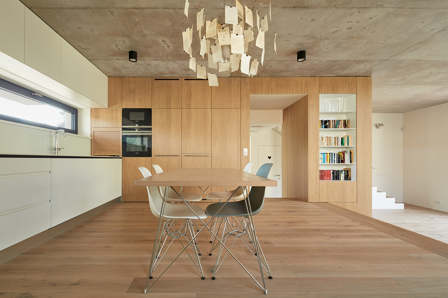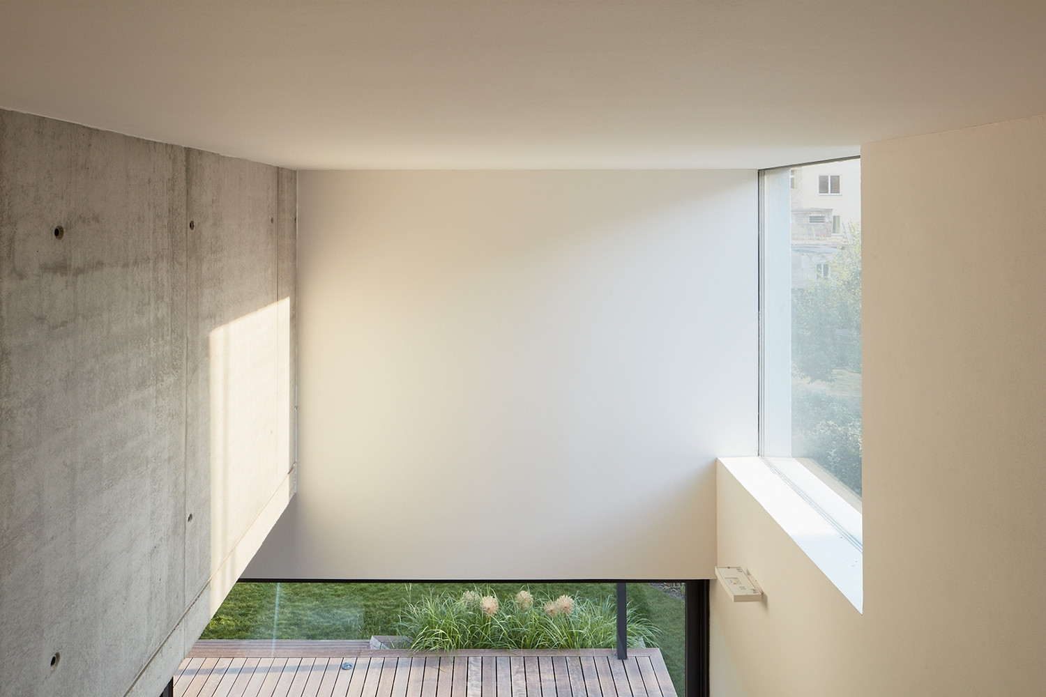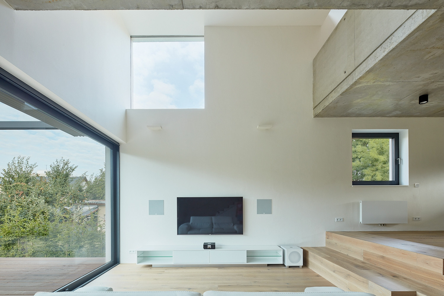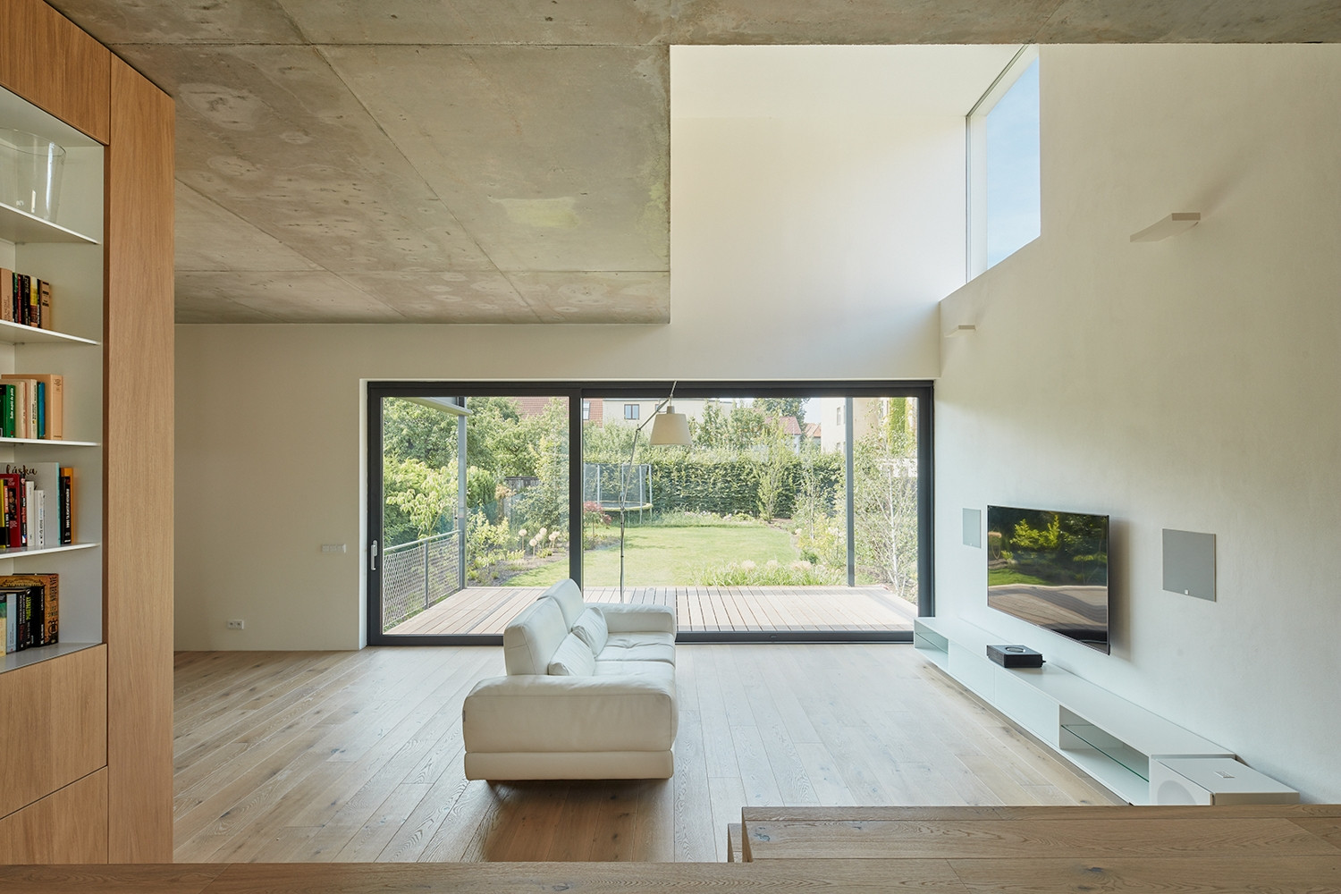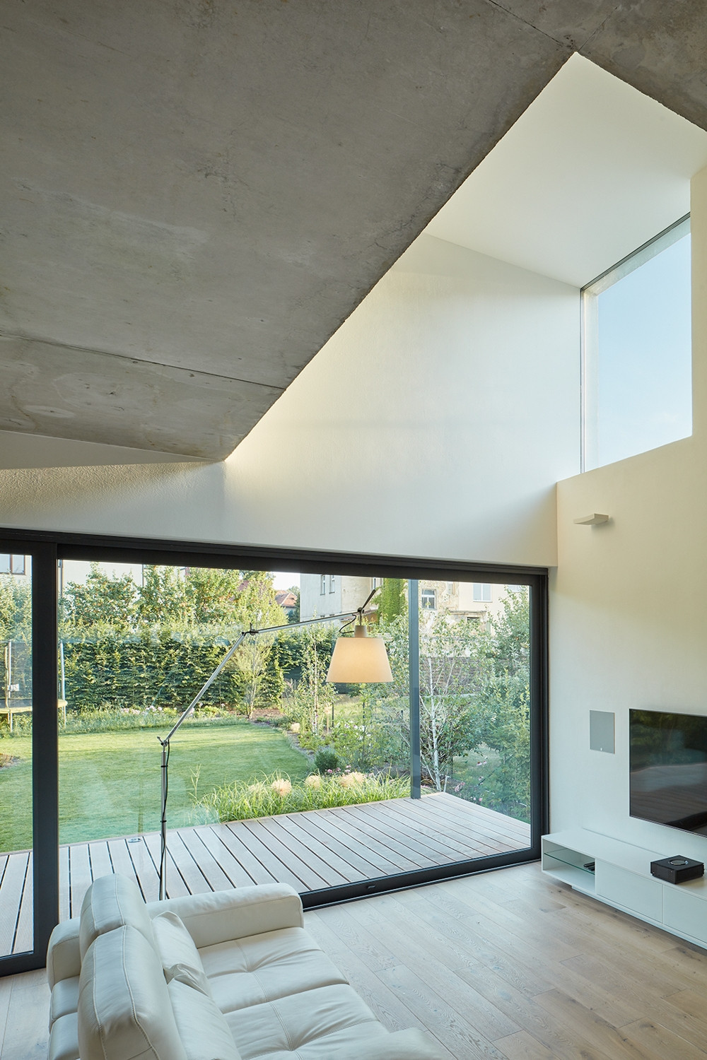 Diagonální zalomení objektu druhého patra je reflektováno posunem ve výškovém uspořádání. Kuchyně s jídelnou je kvůli lepšímu výhledu do zahrady výše než obývací pokoj, na to navazující vertikální posun úrovně stropů v horním patře umožňuje vizuální propojení osluněné pracovny s hlavním obytným prostorem.