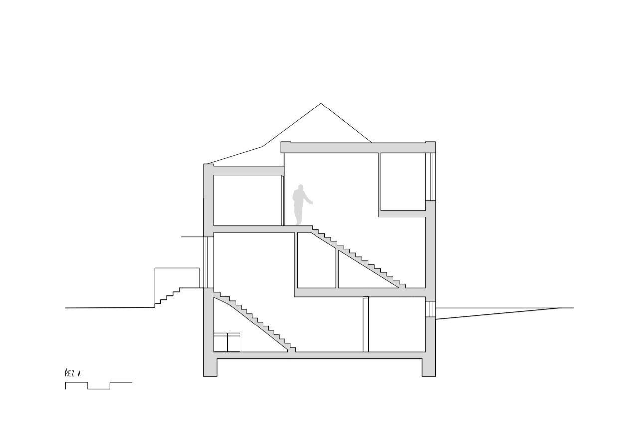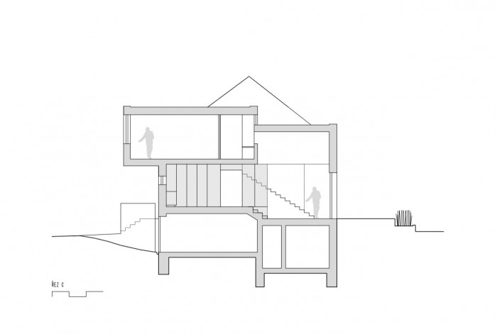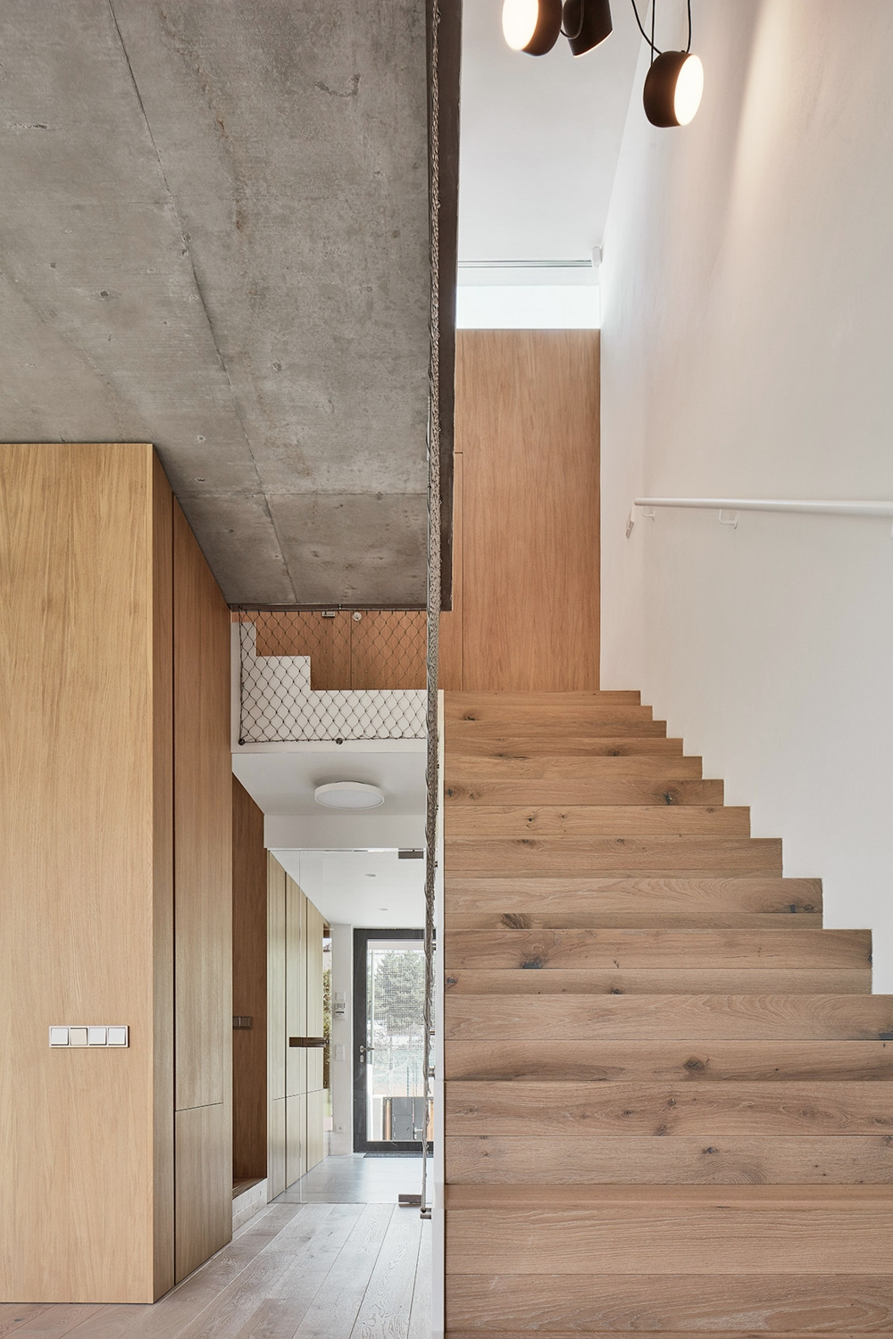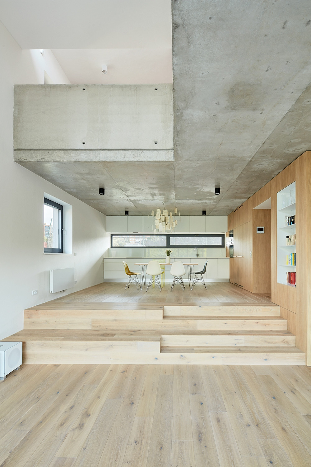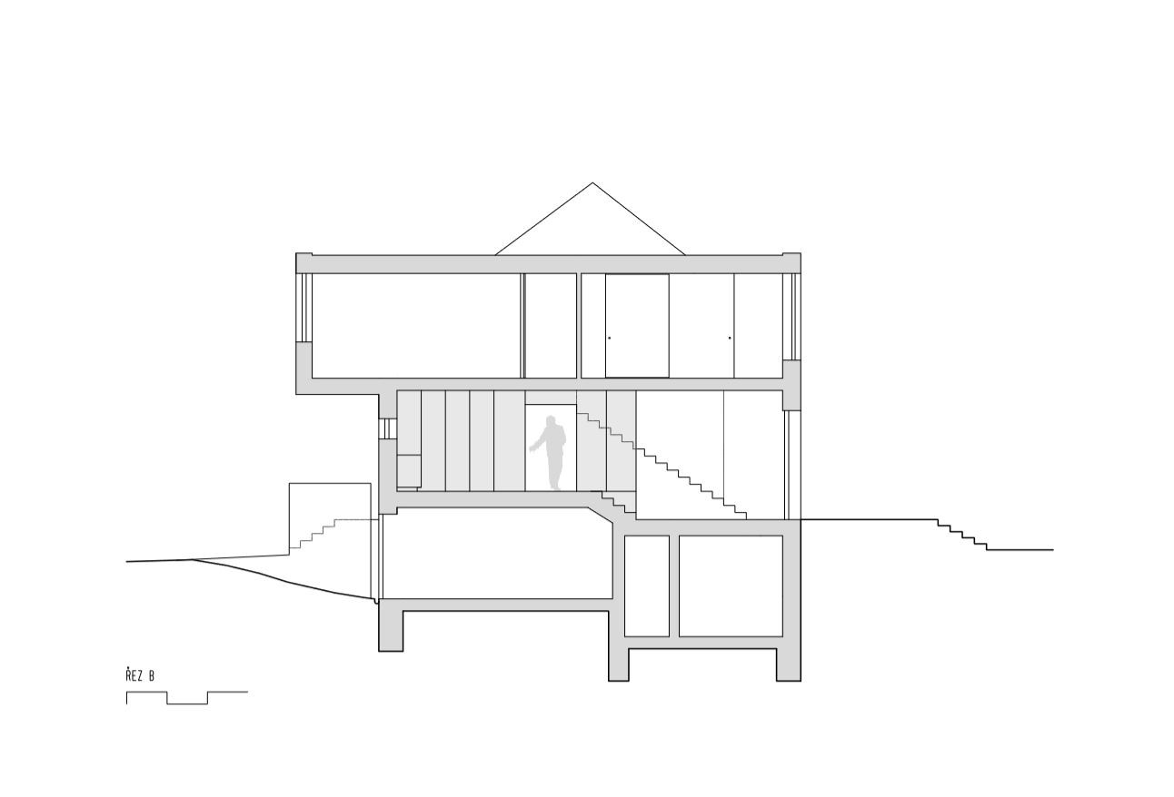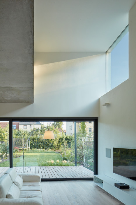 Diagonální zalomení objektu druhého patra je reflektováno posunem ve výškovém uspořádání. Kuchyně s jídelnou je kvůli lepšímu výhledu do zahrady výše než obývací pokoj, na to navazující vertikální posun úrovně stropů v horním patře umožňuje vizuální propojení osluněné pracovny s hlavním obytným prostorem.