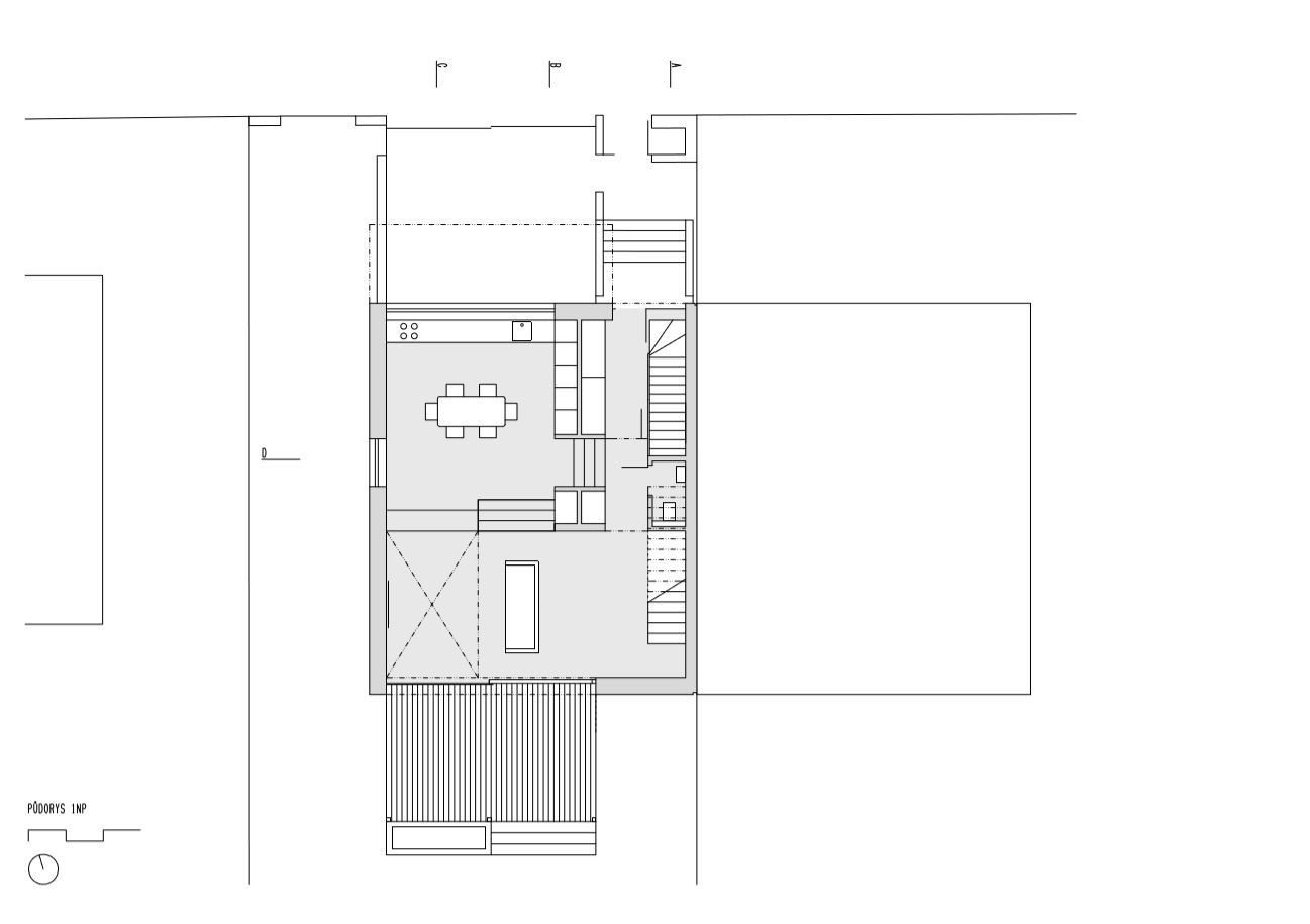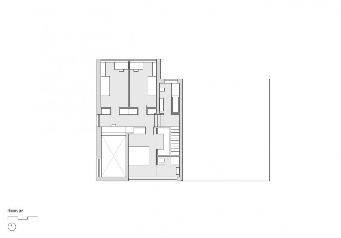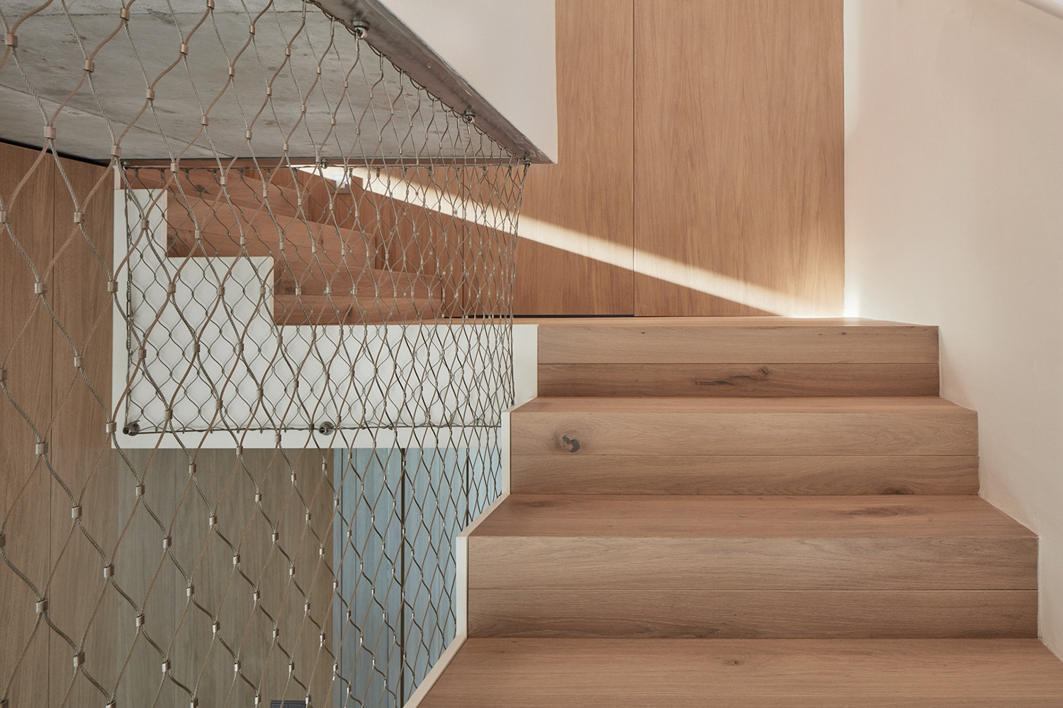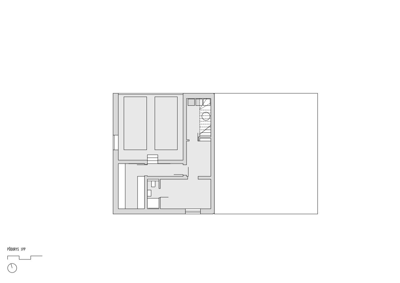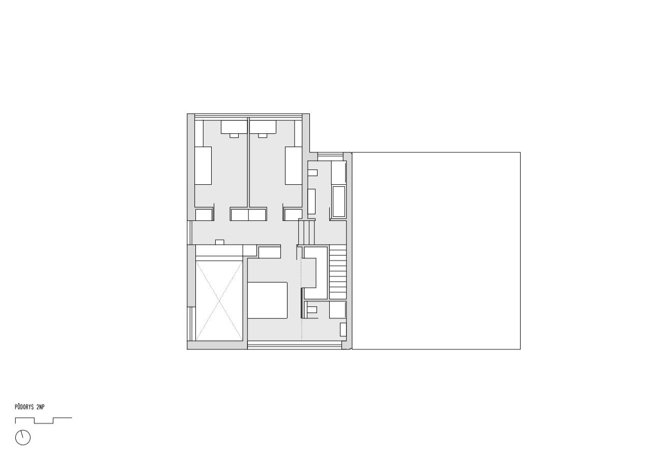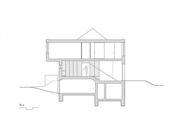 Diagonální zalomení objektu druhého patra je reflektováno posunem ve výškovém uspořádání. Kuchyně s jídelnou je kvůli lepšímu výhledu do zahrady výše než obývací pokoj, na to navazující vertikální posun úrovně stropů v horním patře umožňuje vizuální propojení osluněné pracovny s hlavním obytným prostorem.