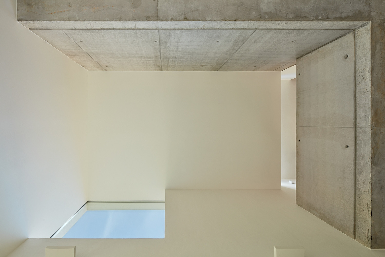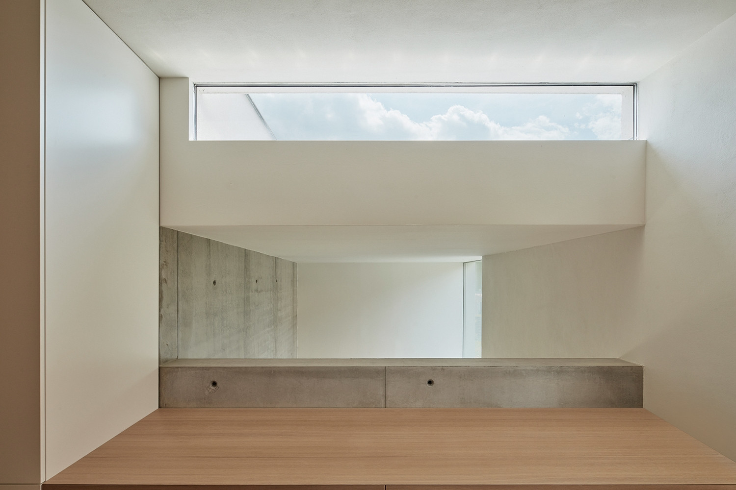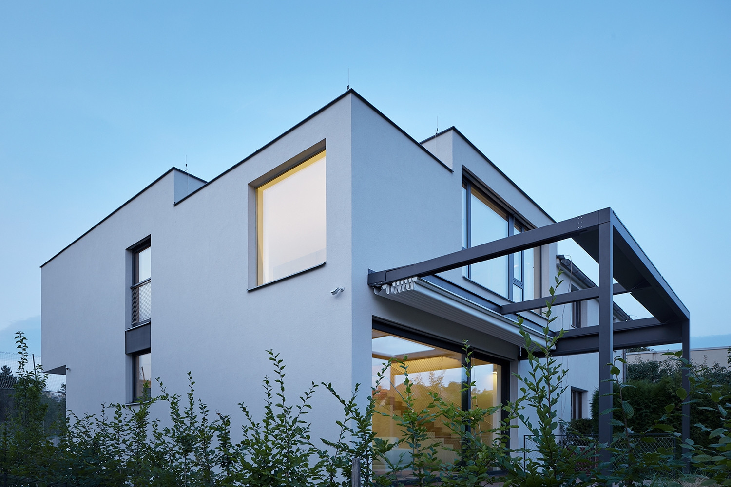 Při komponování otvorů do hmoty domu hrála roli orientace ke světovým stranám. Velké posuvné okno do jižní zahrady rámuje výhled z obýváku, čtvercový otvor v horním rohu převýšeného obytného prostoru se otevírá západnímu slunci a horizontální okno při snížení střechy ve druhém patře umožnuje jižnímu slunci osvětlit horní pracovnou.